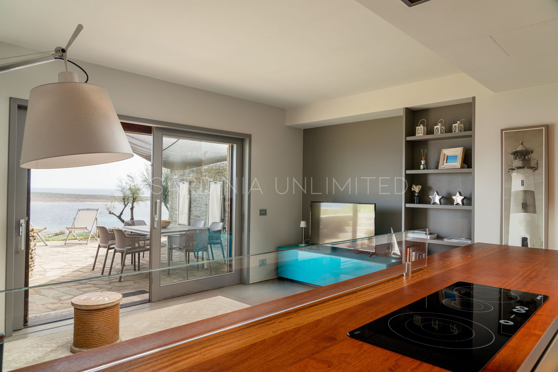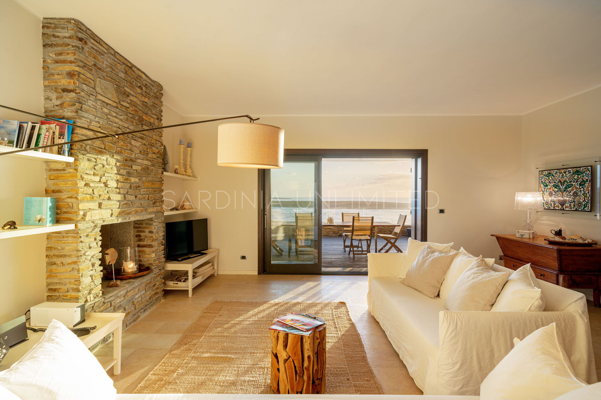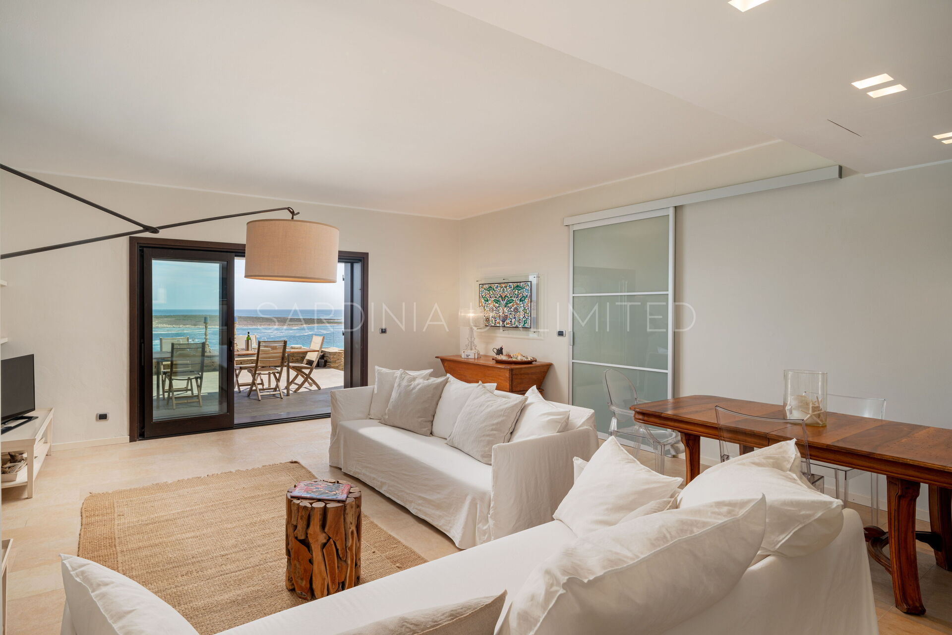 Dalla suggestiva terrazza, in cui è possibile pasteggiare ed ammirare la meravigliosa isola dell’Asinara, si accede all’interno della villa da un’ampia vetrata, che rende la zona living uno spazio gradevole esteticamente e luminoso.