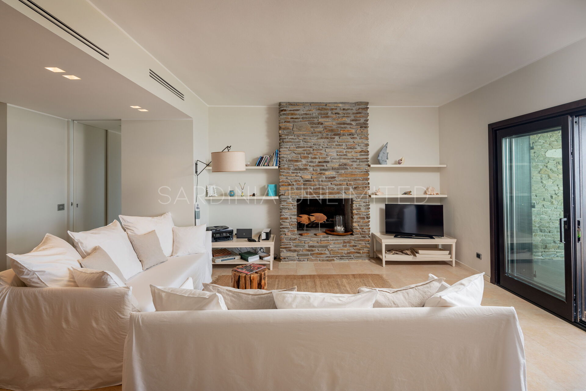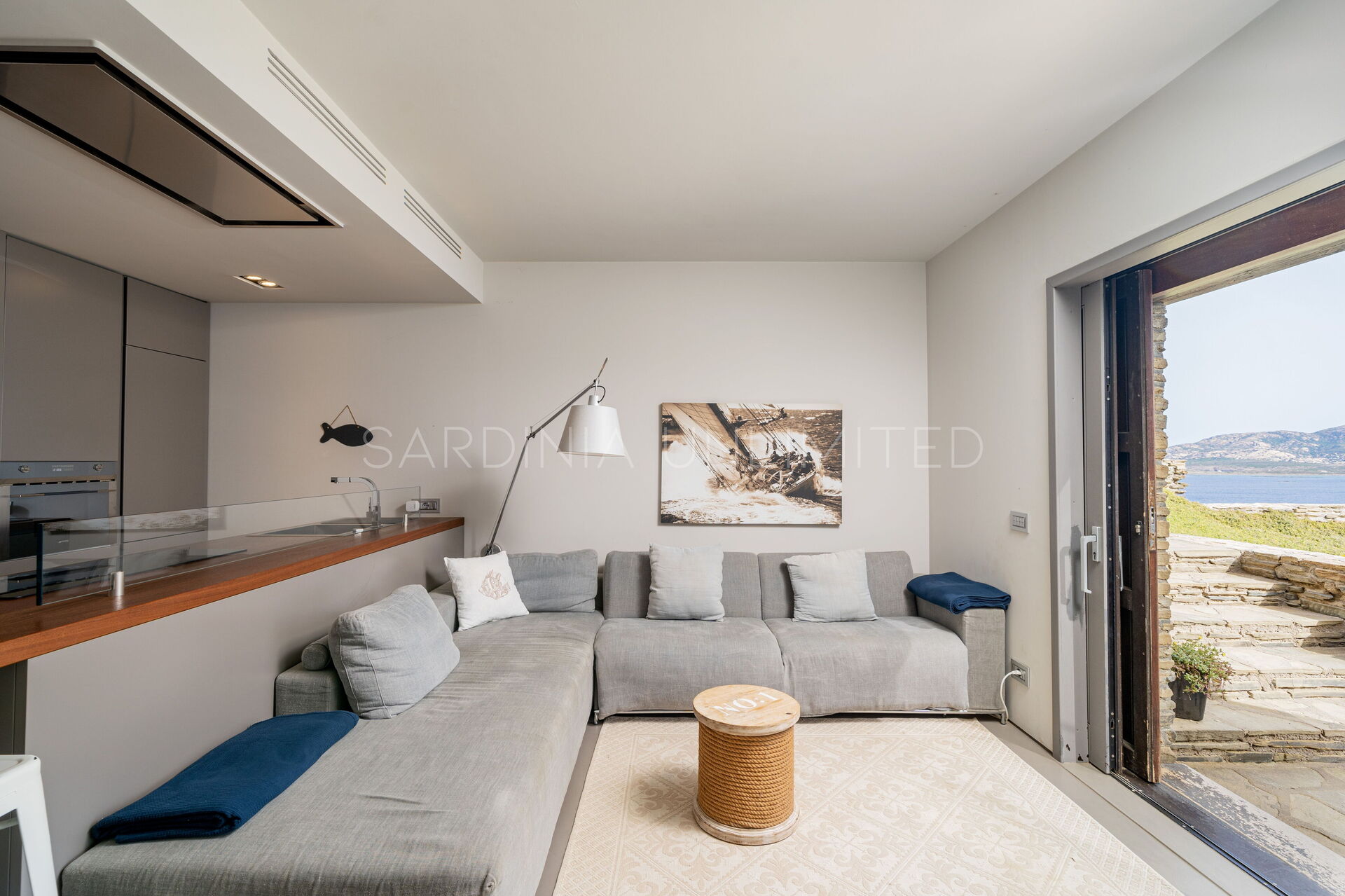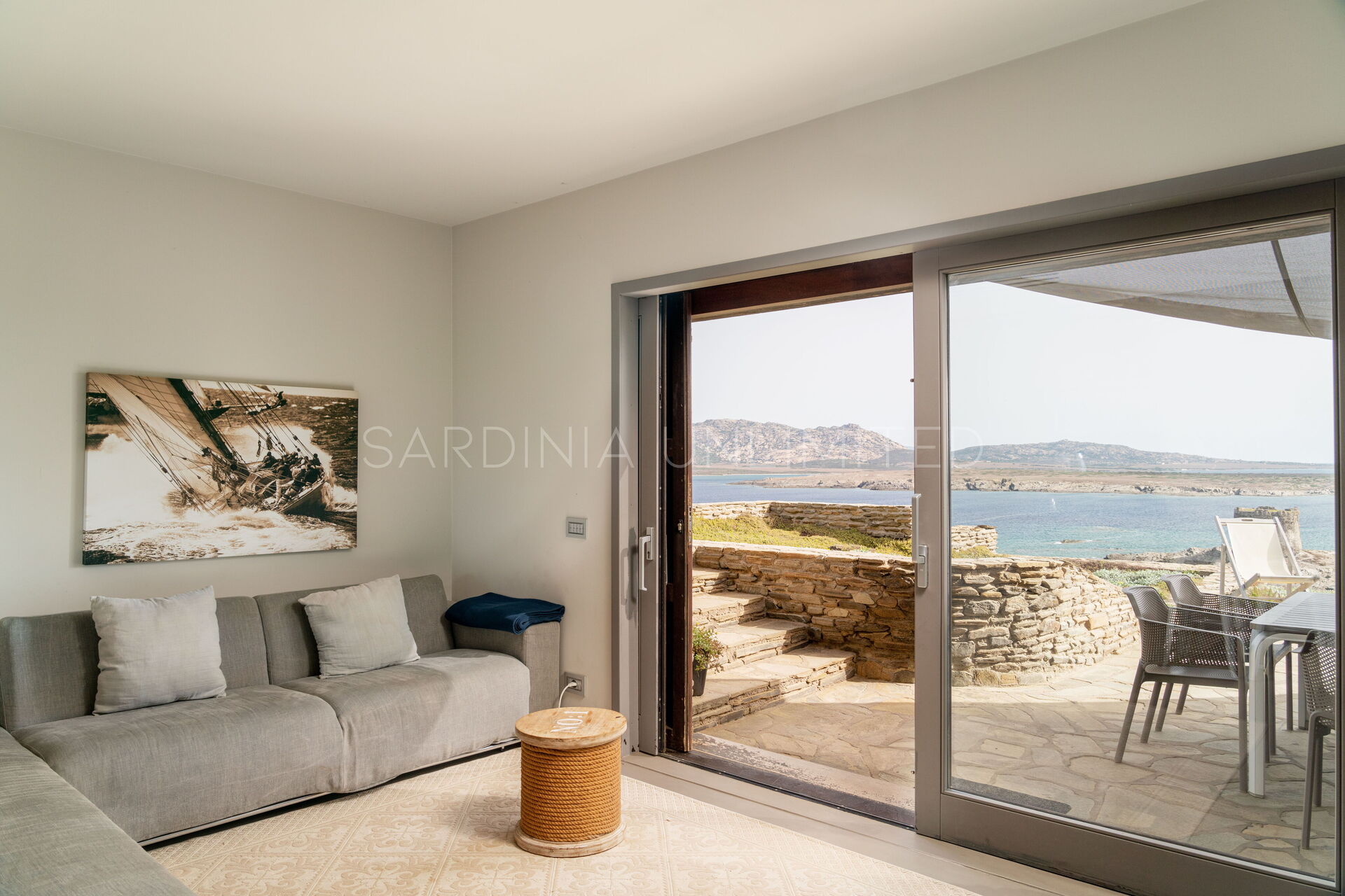 Dalla suggestiva terrazza, in cui è possibile pasteggiare ed ammirare la meravigliosa isola dell’Asinara, si accede all’interno della villa da un’ampia vetrata, che rende la zona living uno spazio gradevole esteticamente e luminoso.