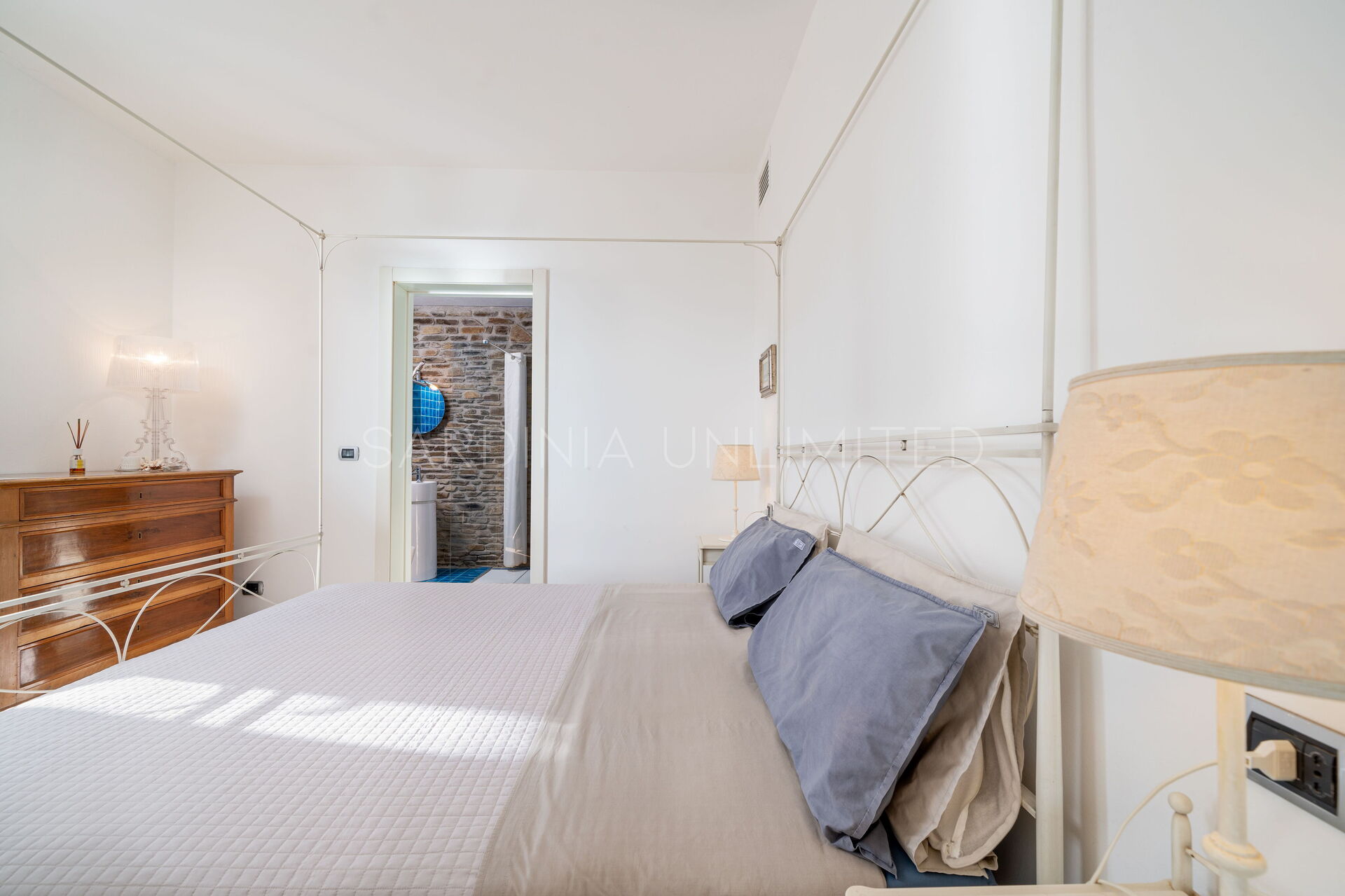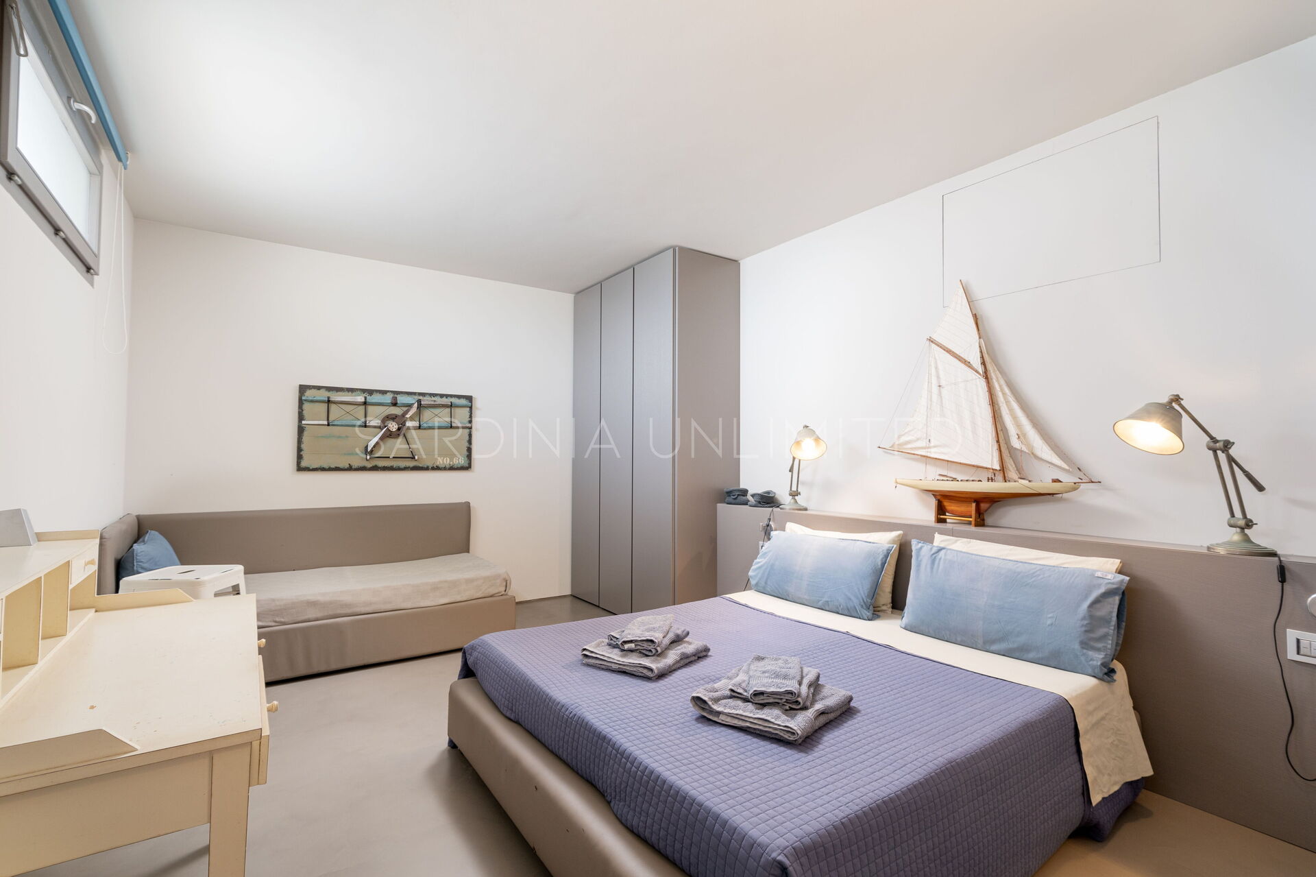 Il corpo principale di questa superba villa a Stintino in affitto, ideale per 5/6 ospiti, è dotato di tutti i comfort. Esso dispone in totale di 3 camere da letto: una matrimoniale con bagno privato con un’ampia doccia, una camera con due letti singoli, una terza camera con letto a una piazza e mezza; due ulteriori bagni (uno in zona notte, uno in zona giorno). È presente una cucina funzionale attrezzata, una zona living con due divani e camino e la zona pranzo.