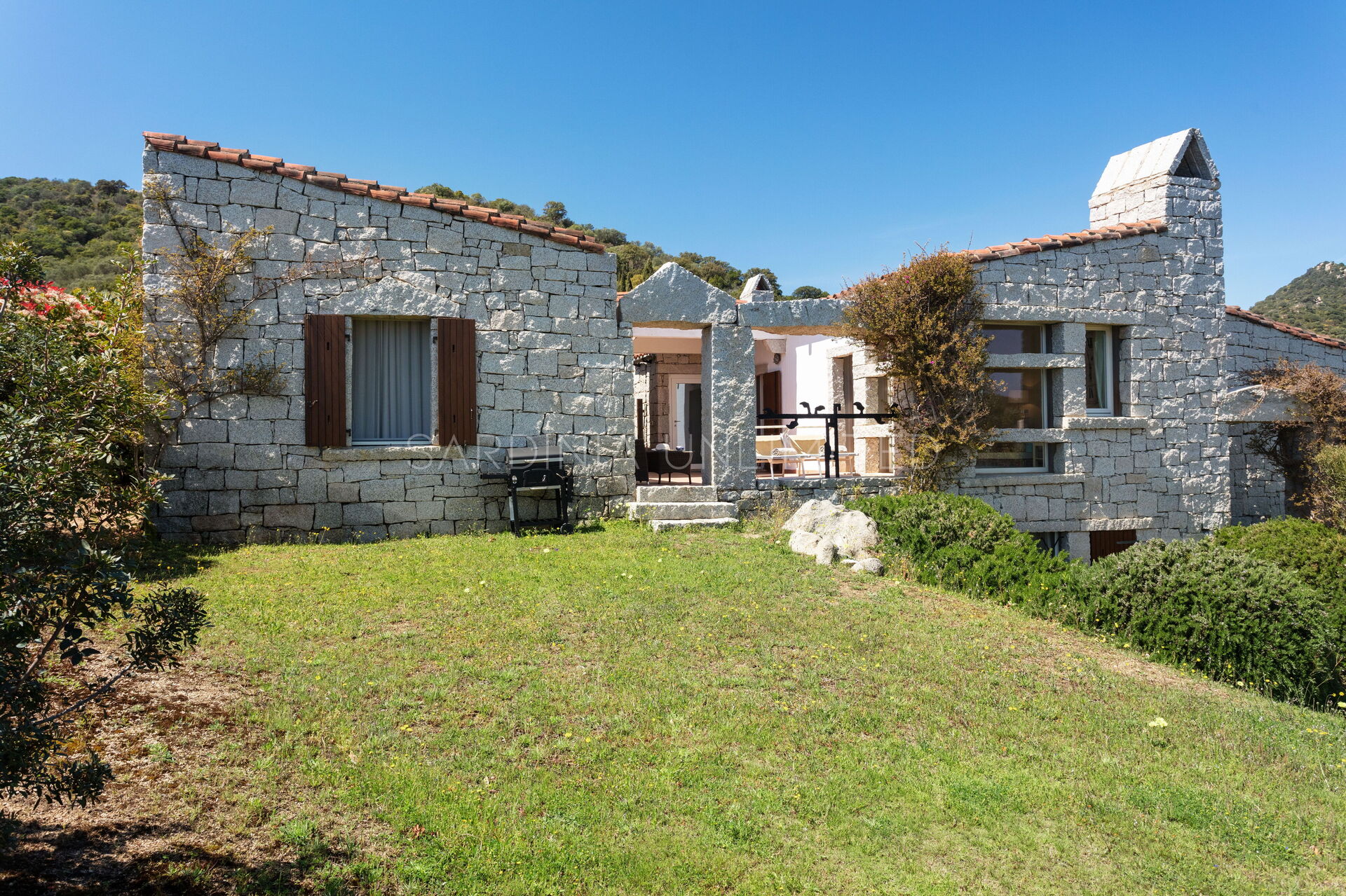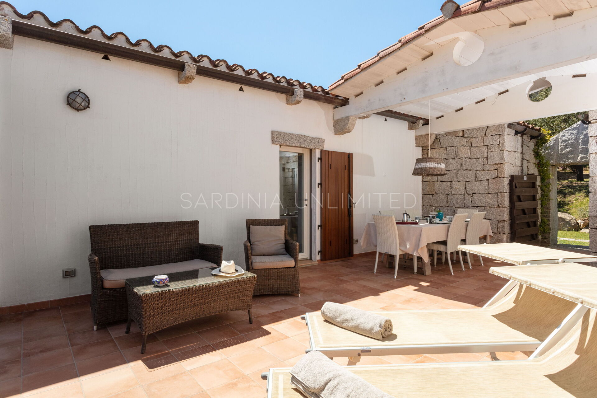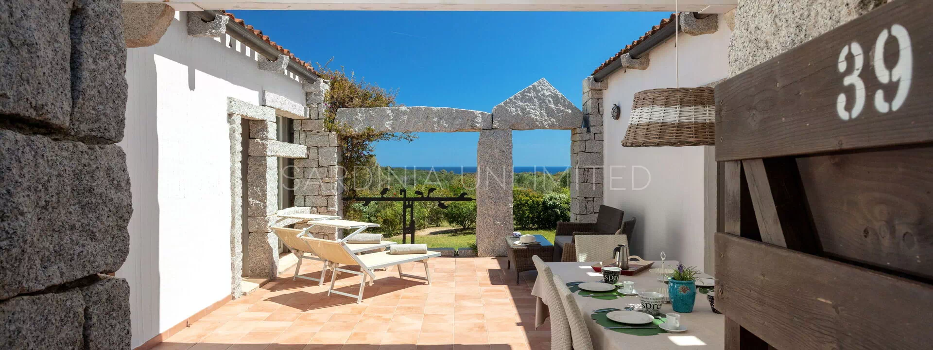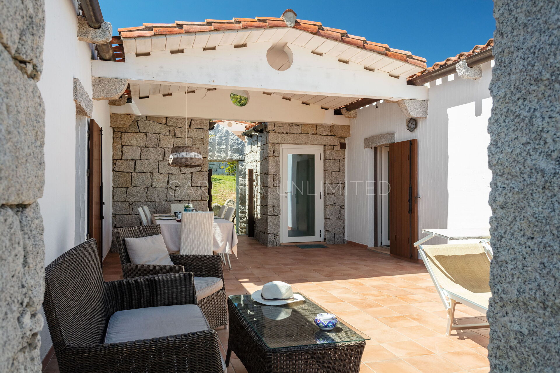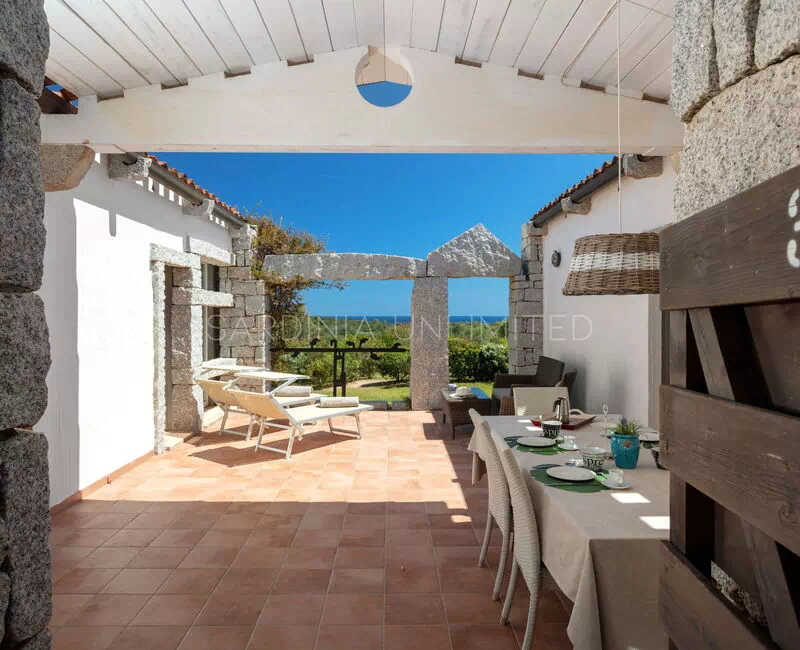 This villa to rent in Sardinia presents itself as a fantastic example of a stone building in which the granite, meticulously worked, emerges in all its beauty with the aim of creating a harmony between human and natural elements. To enjoy the harmony given by the indigo of the sea and the warm colors of the Mediterranean maquis, the villa has a spacious patio which houses a lounge area, a solarium area and a table for comfortably having meals outdoors.