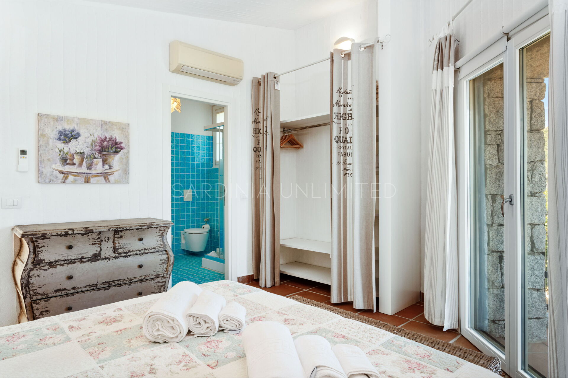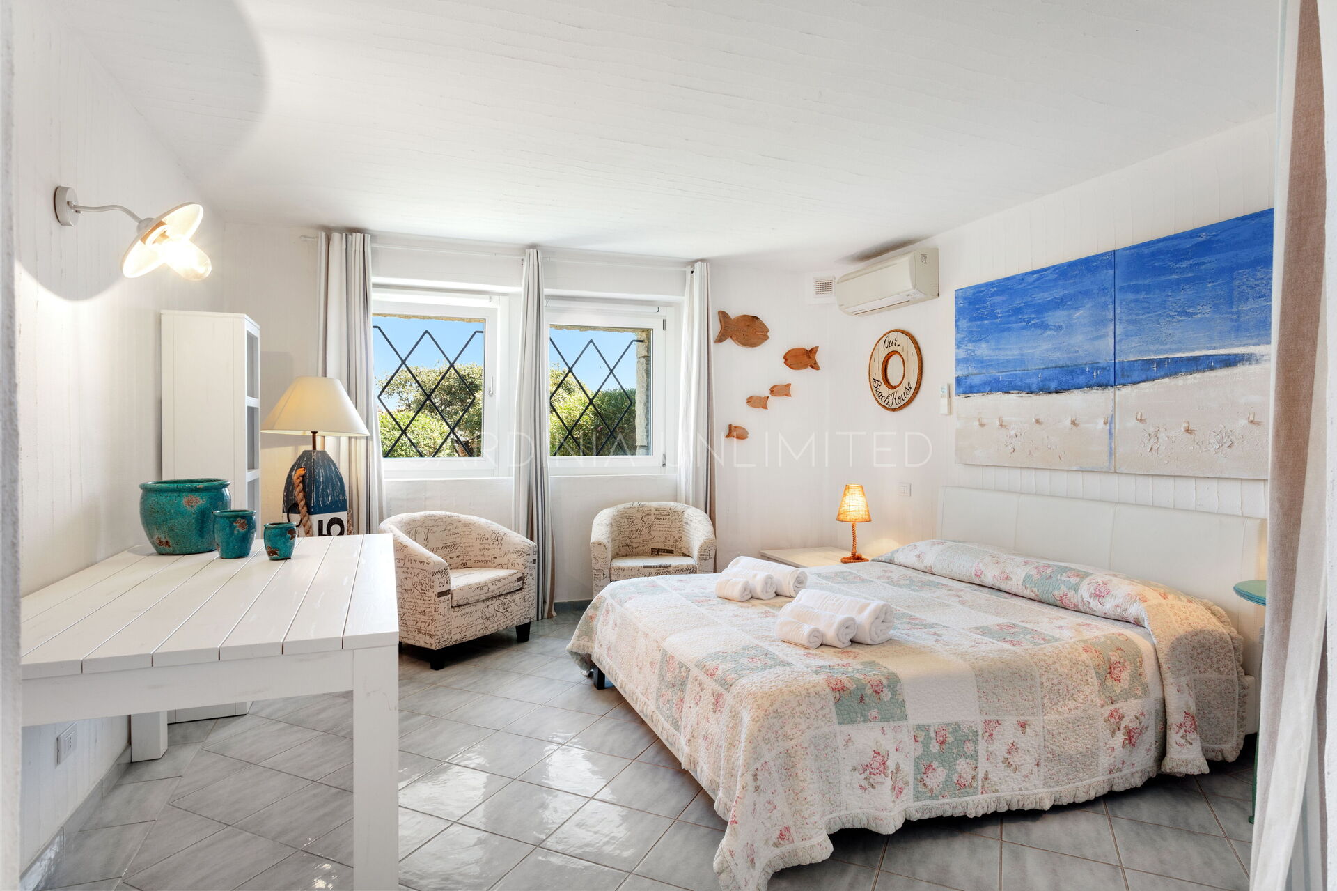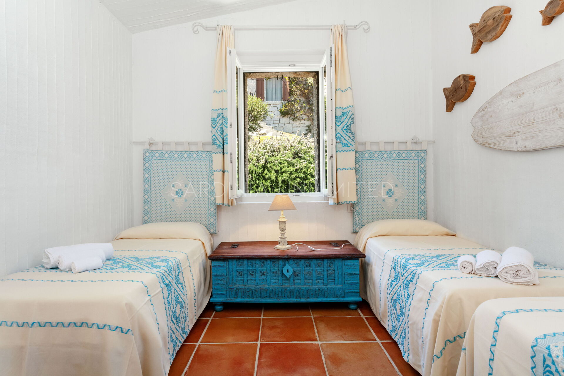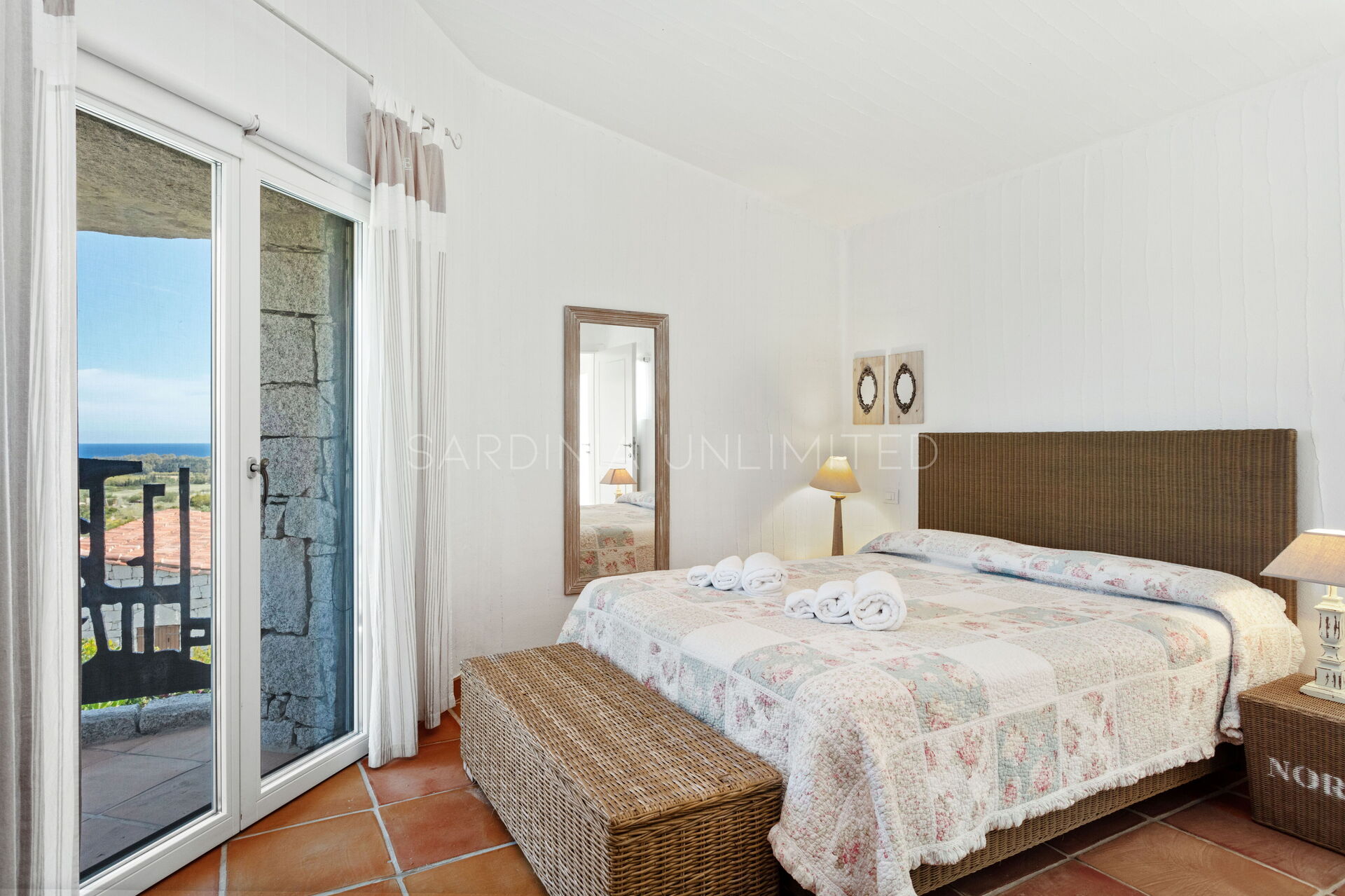 The sleeping area instead consists of a spacious double bedroom with private balcony and sea view which, thanks to the large French windows, gives it a feeling of continuity with the external nature. Furthermore, the house has another very large double bedroom equipped with all comforts and a last room, fully furnished in Sardinian style, with three single beds.