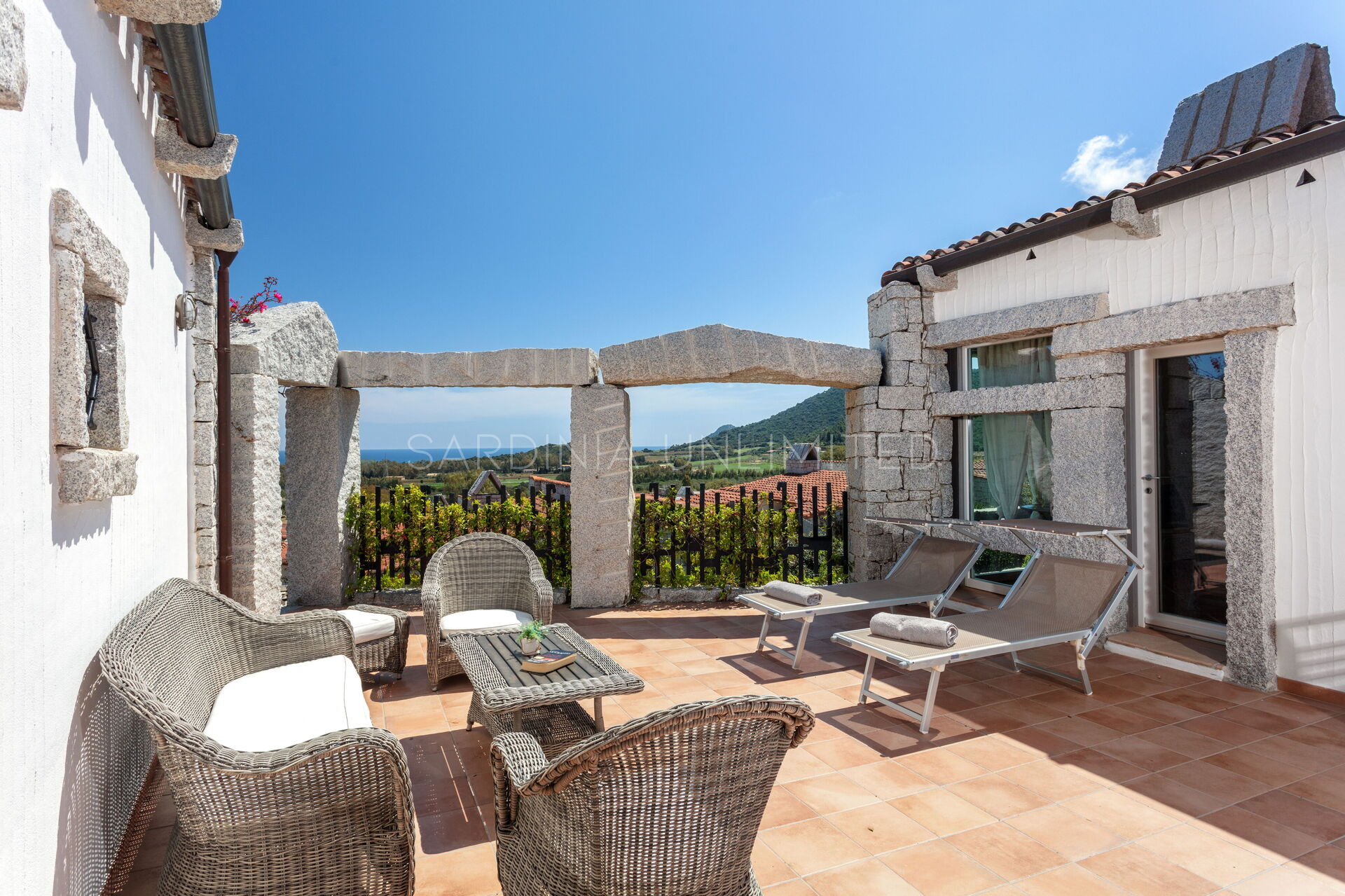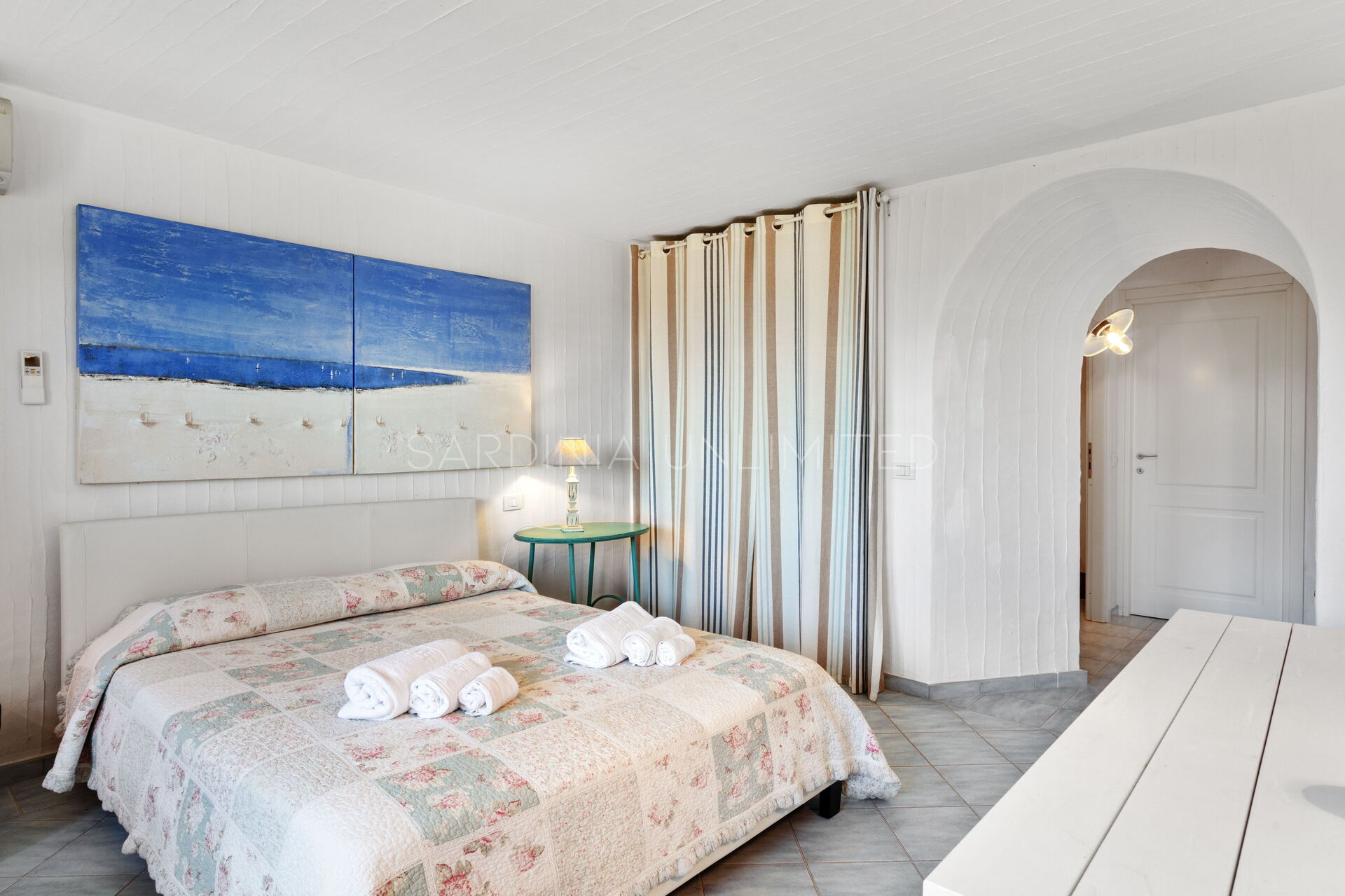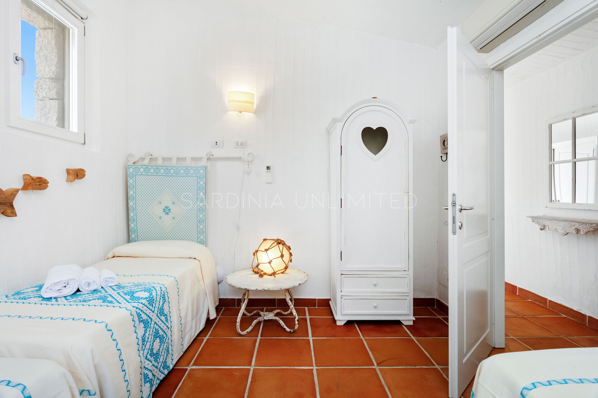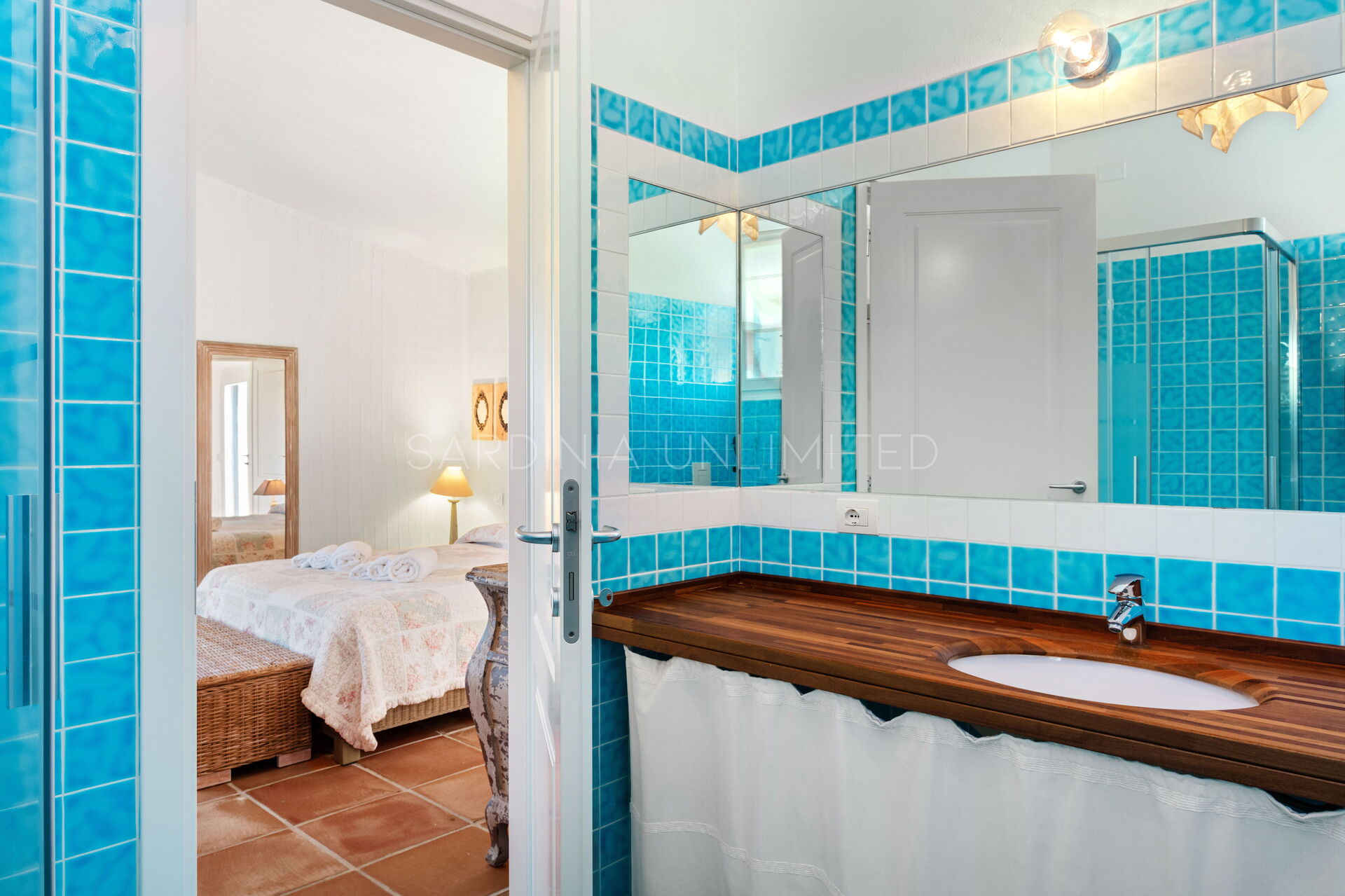 The sleeping area instead consists of a spacious double bedroom with private balcony and sea view which, thanks to the large French windows, gives it a feeling of continuity with the external nature. Furthermore, the house has another very large double bedroom equipped with all comforts and a last room, fully furnished in Sardinian style, with three single beds.