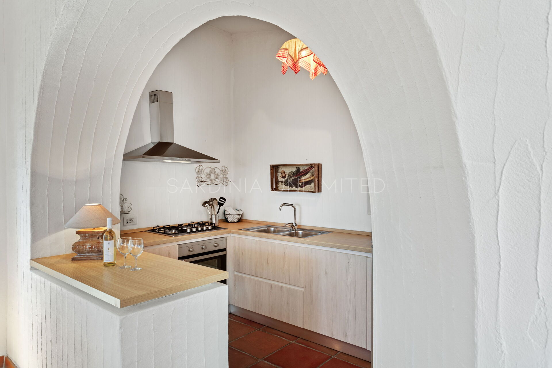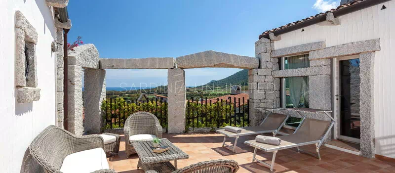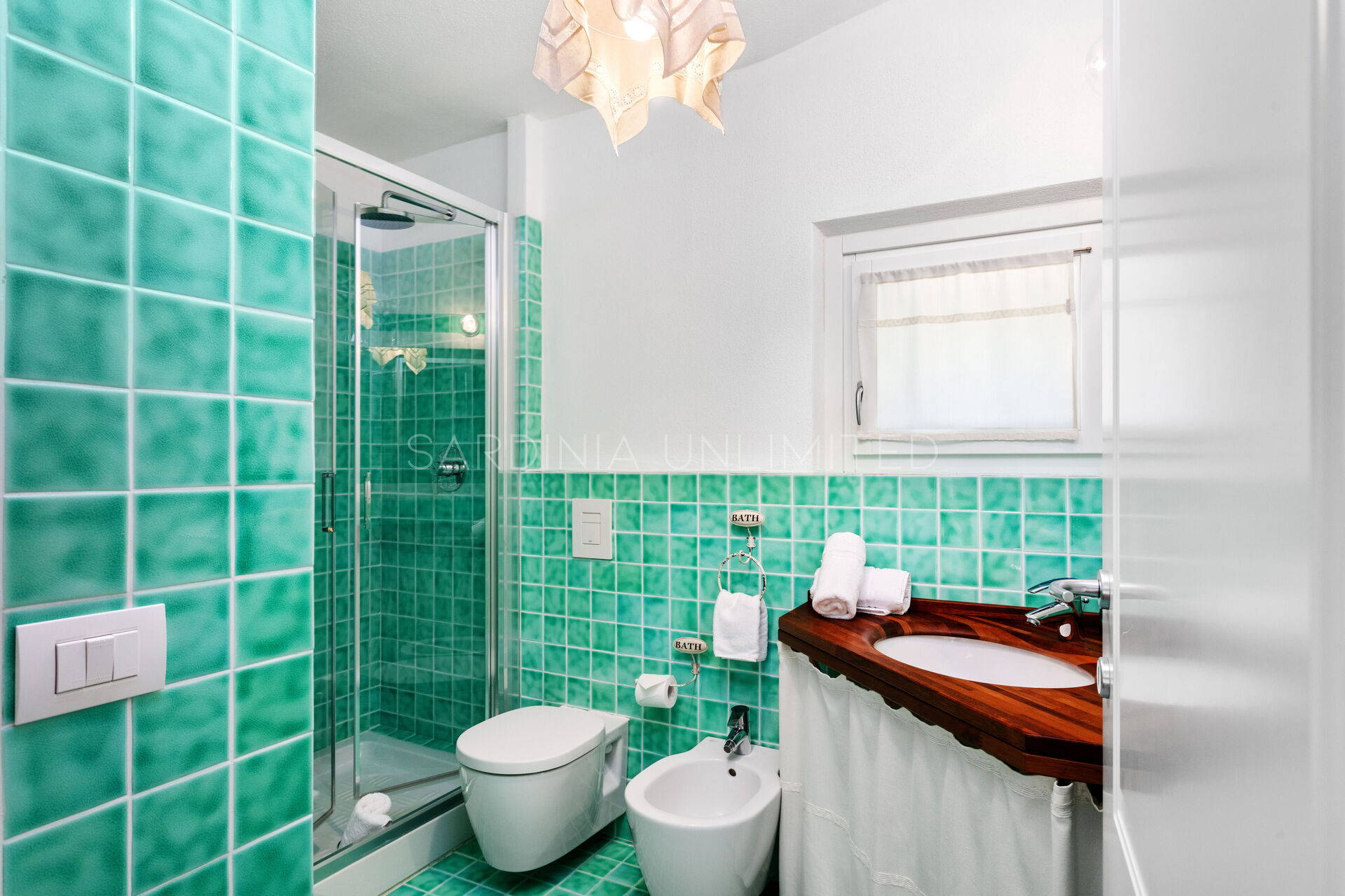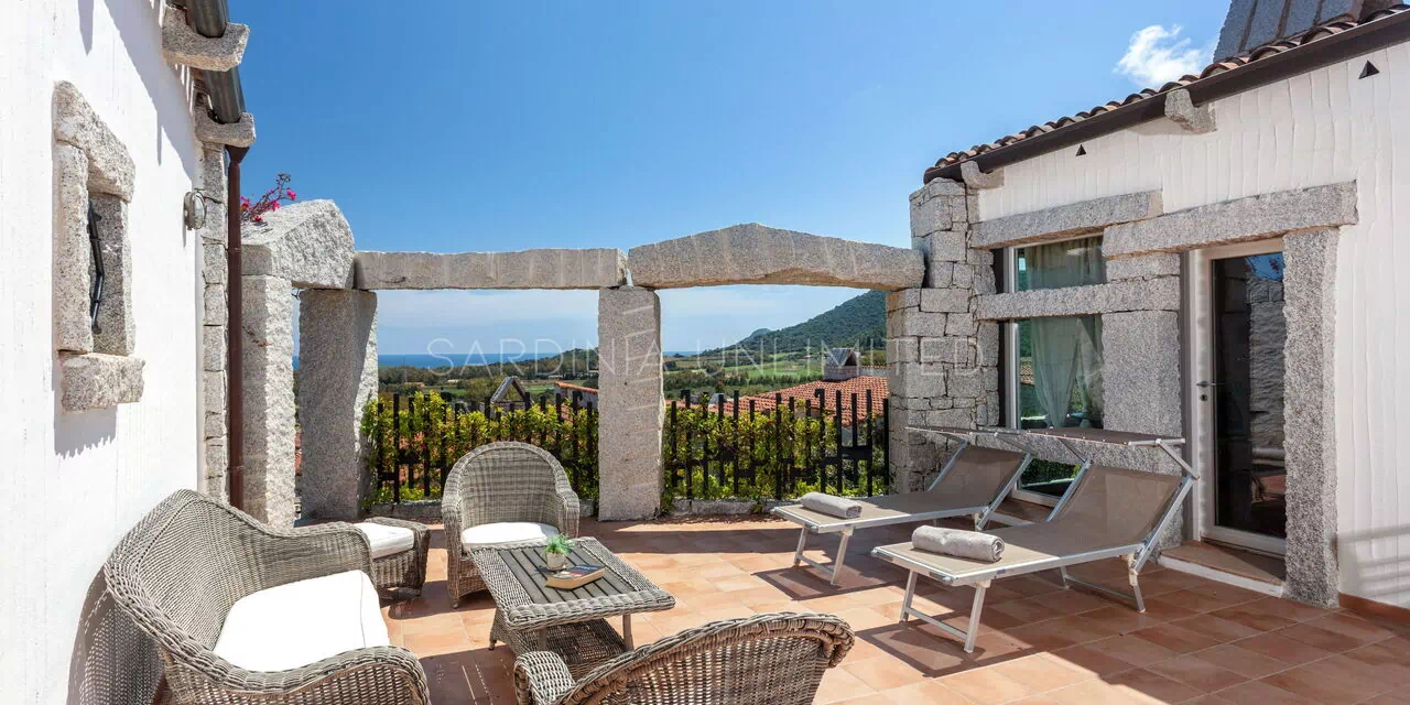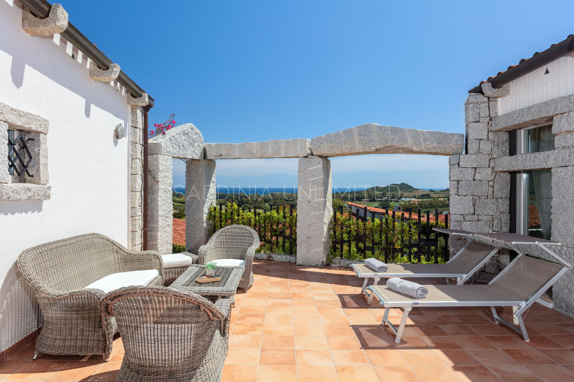 The sleeping area instead consists of a spacious double bedroom with private balcony and sea view which, thanks to the large French windows, gives it a feeling of continuity with the external nature. Furthermore, the house has another very large double bedroom equipped with all comforts and a last room, fully furnished in Sardinian style, with three single beds.