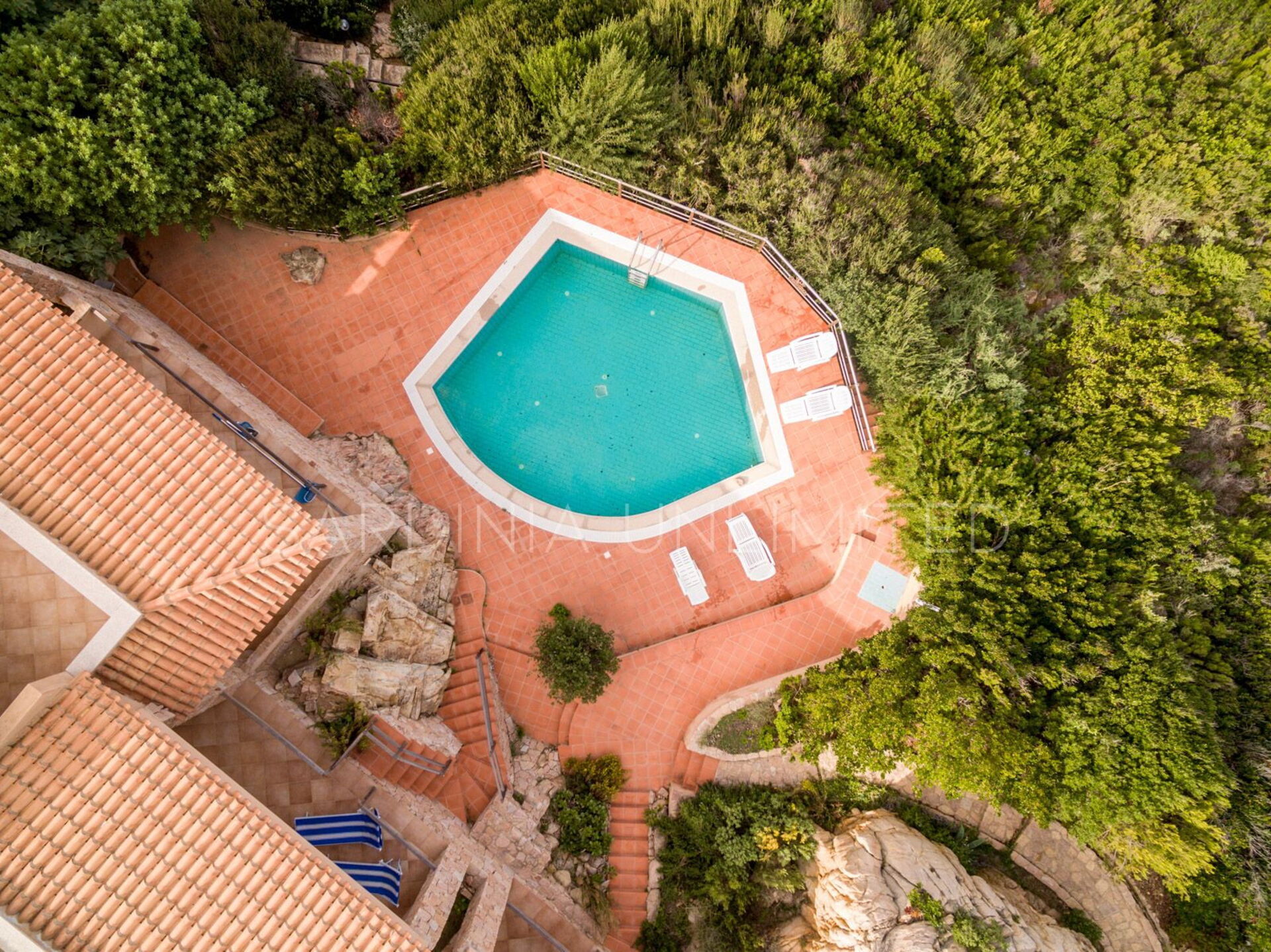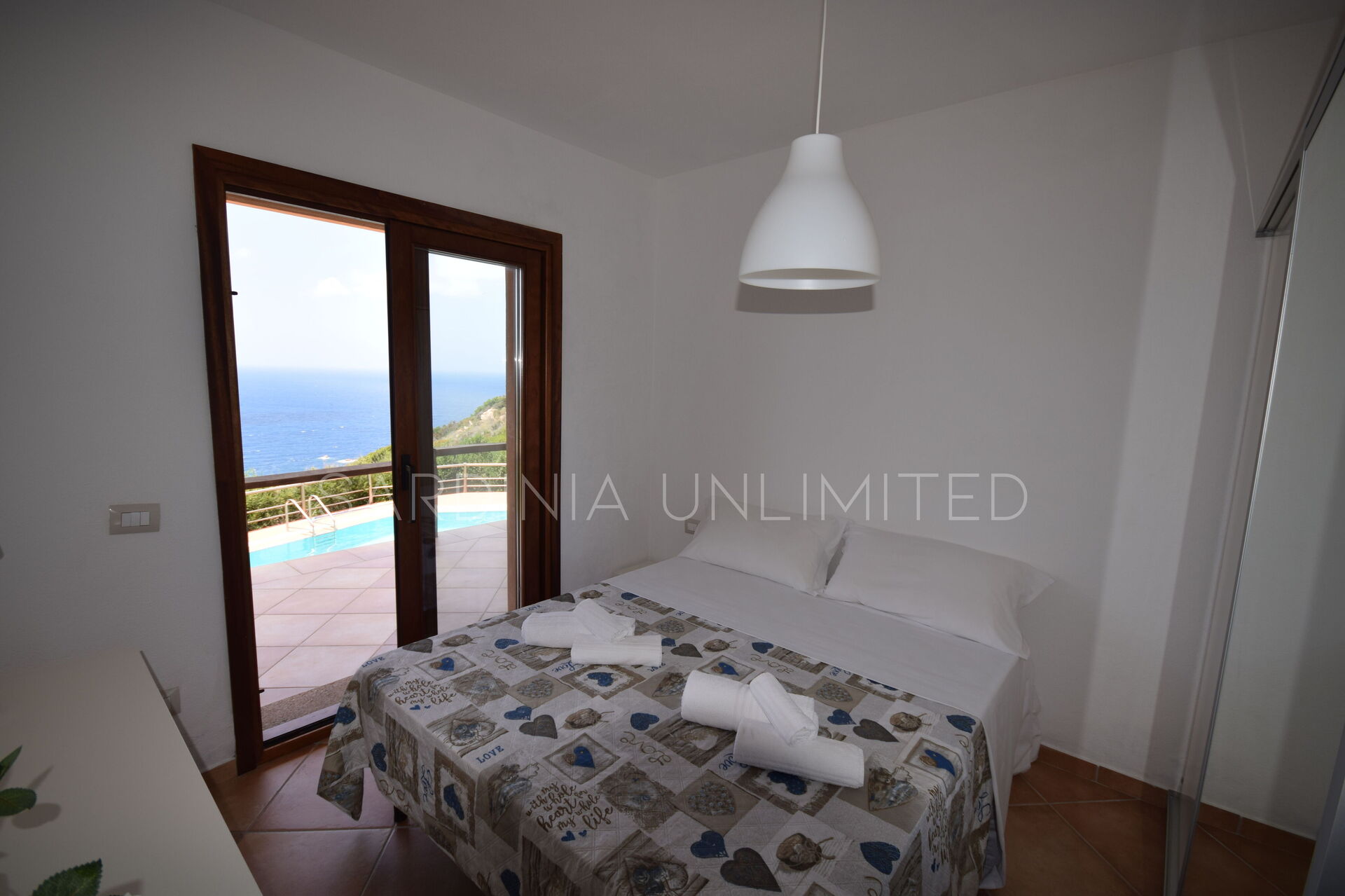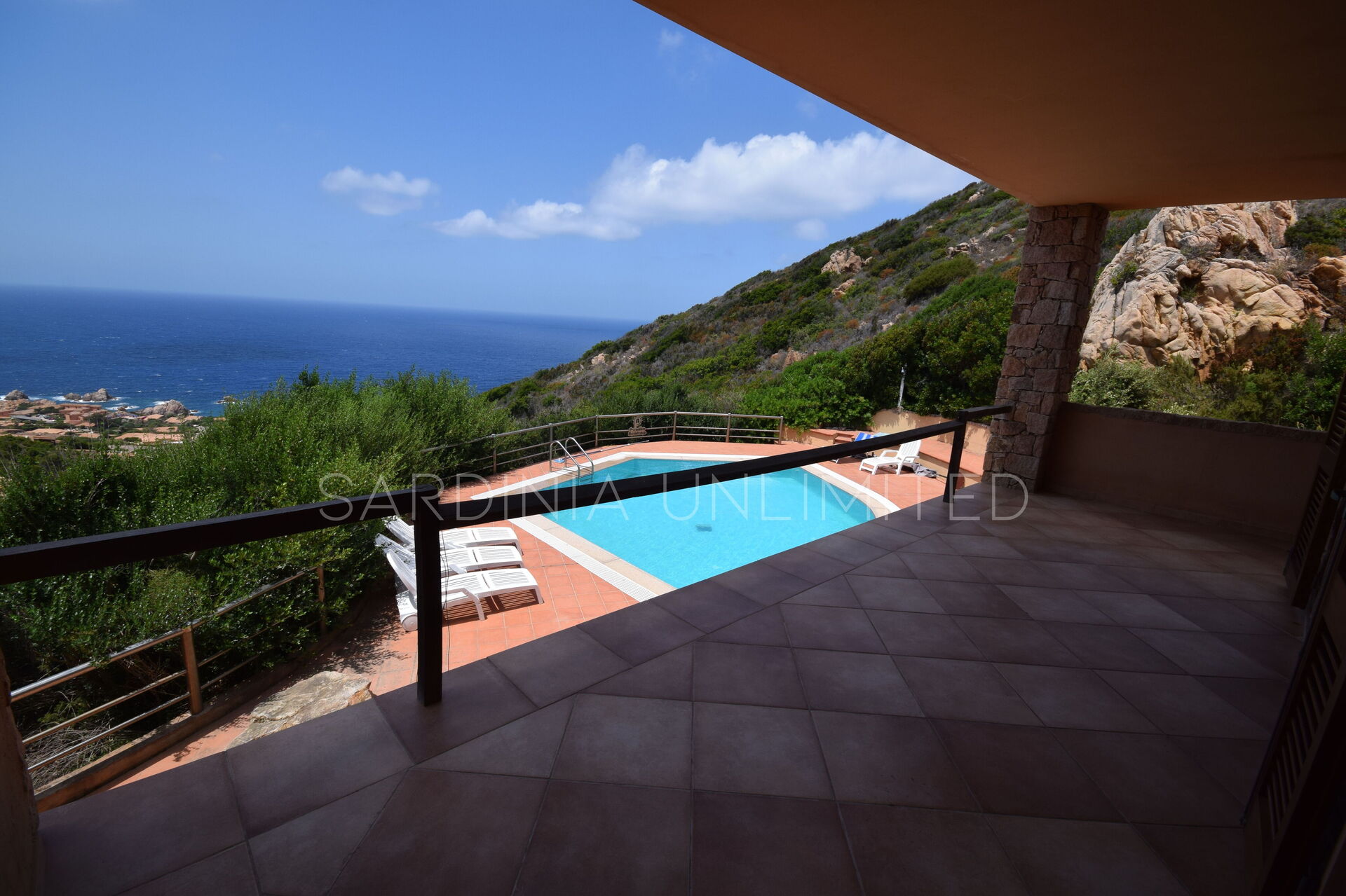 The bedrooms open onto a large and wonderful terrace with a swimming pool, furnished with sun loungers for ultimate relaxation.