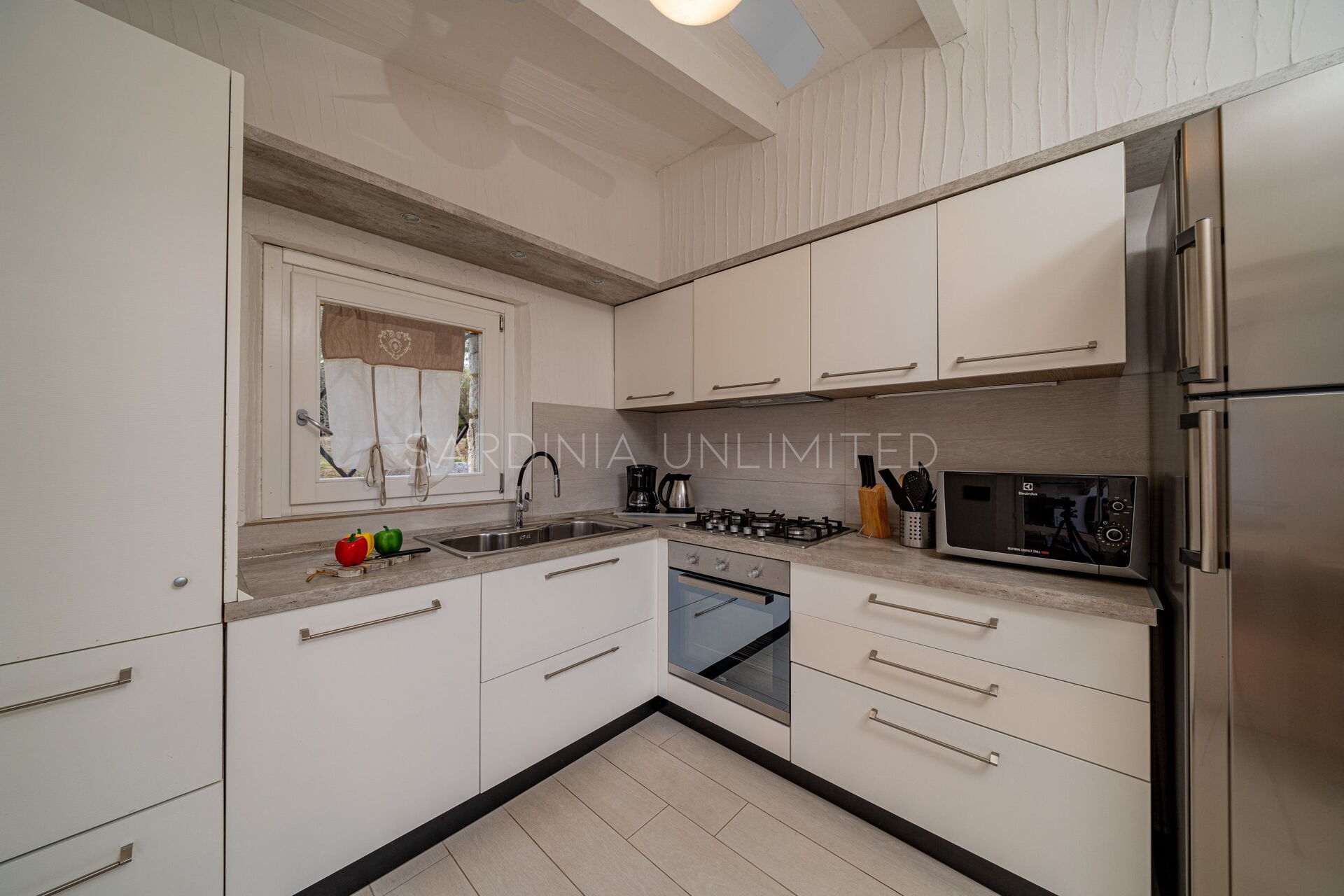 The strong luminosity is another fundamental feature of the structure which is experienced especially in the common area consisting of a large open space with living area and dining table and, in a separate room, a fully equipped kitchen. Two comfortable bathrooms complete the villa.