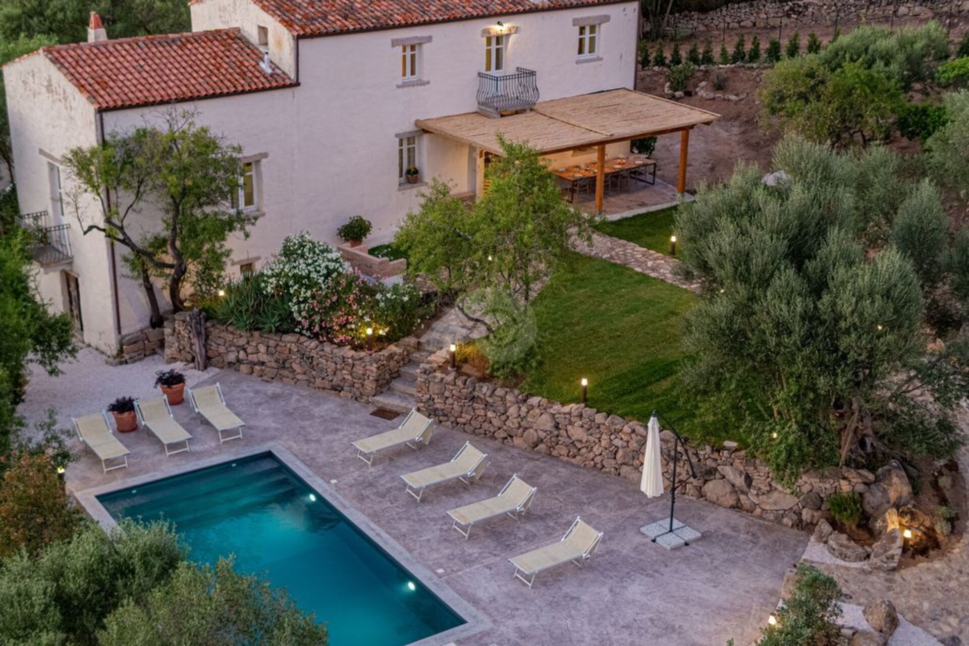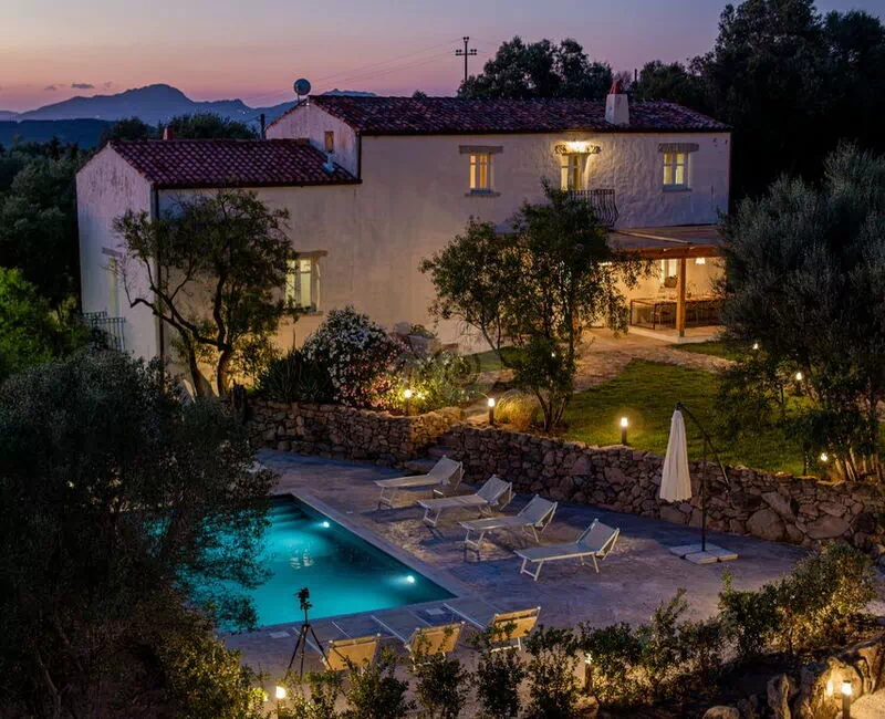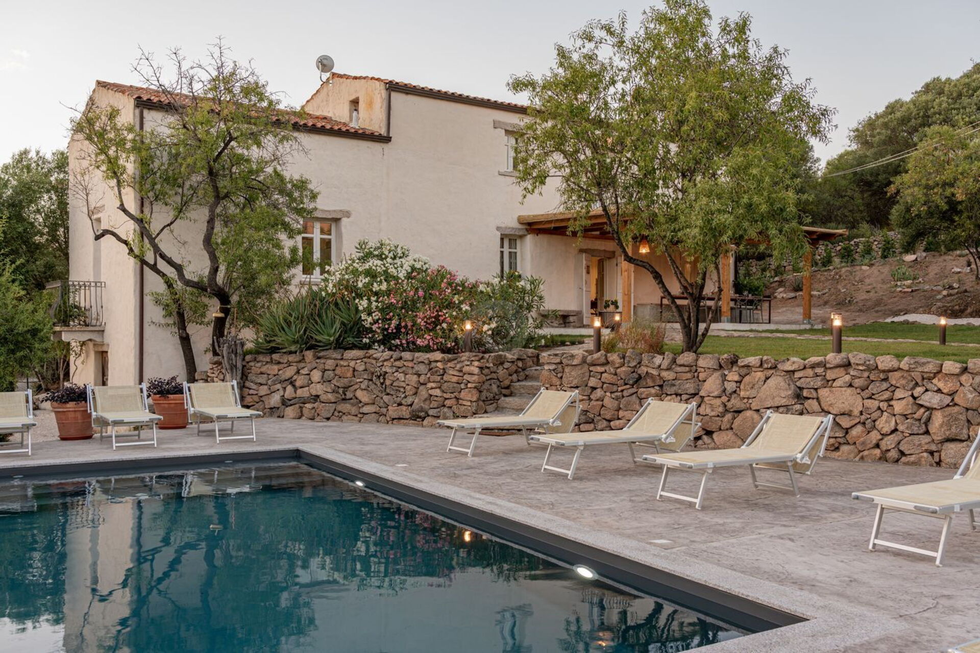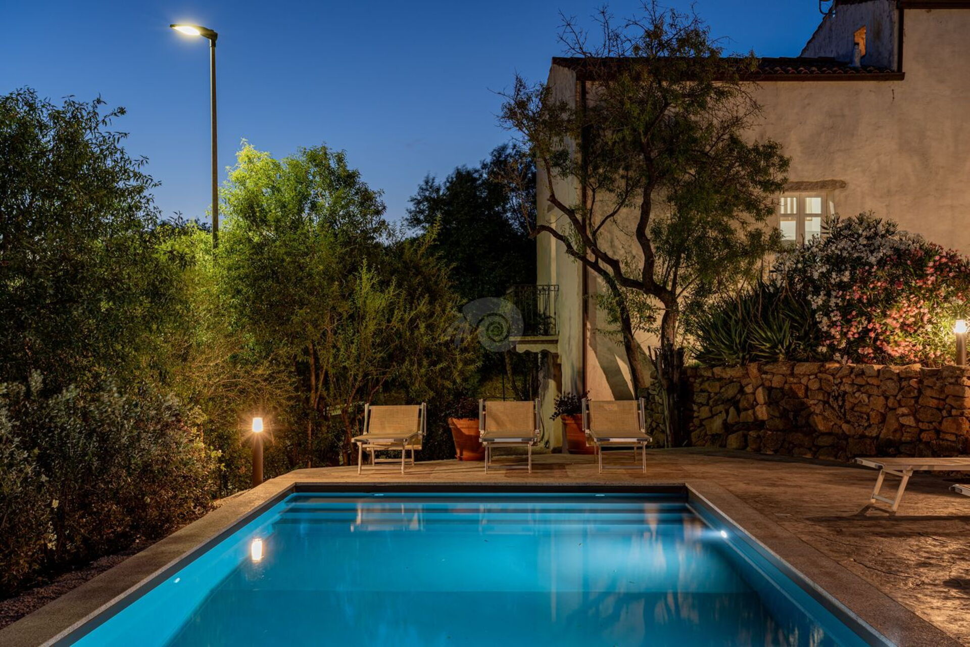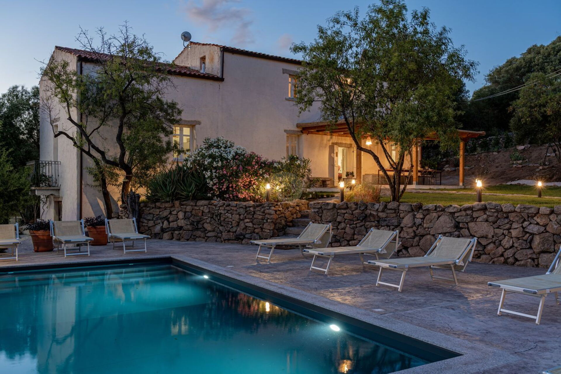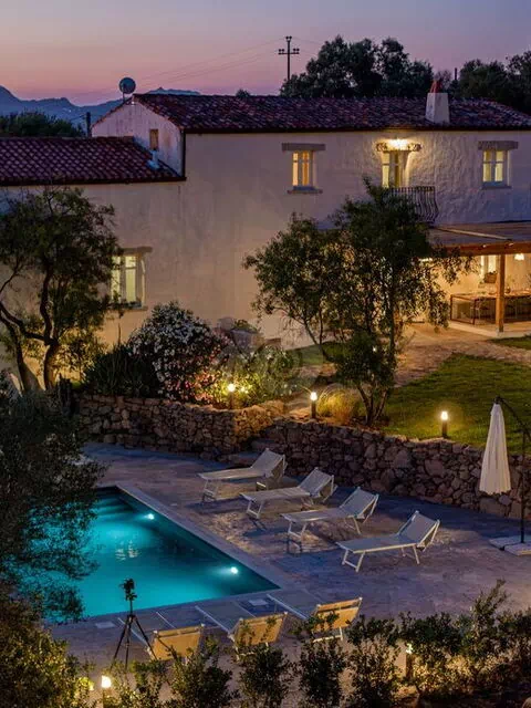 This ancient 19th-century villa for rent in Sardinia has been renovated preserving the historic charm of the foundations, combining elements of to a refined style. This charming property can be reached along a paved path that leads directly to a large and well-kept lawn overlooked by a large veranda. Here there is a large table to comfortably dine outdoors and enjoy the surrounding nature. On the left there is a large paved space which houses a fantastic and clear heated in-ground private swimming pool surrounded by a relaxing solarium area.