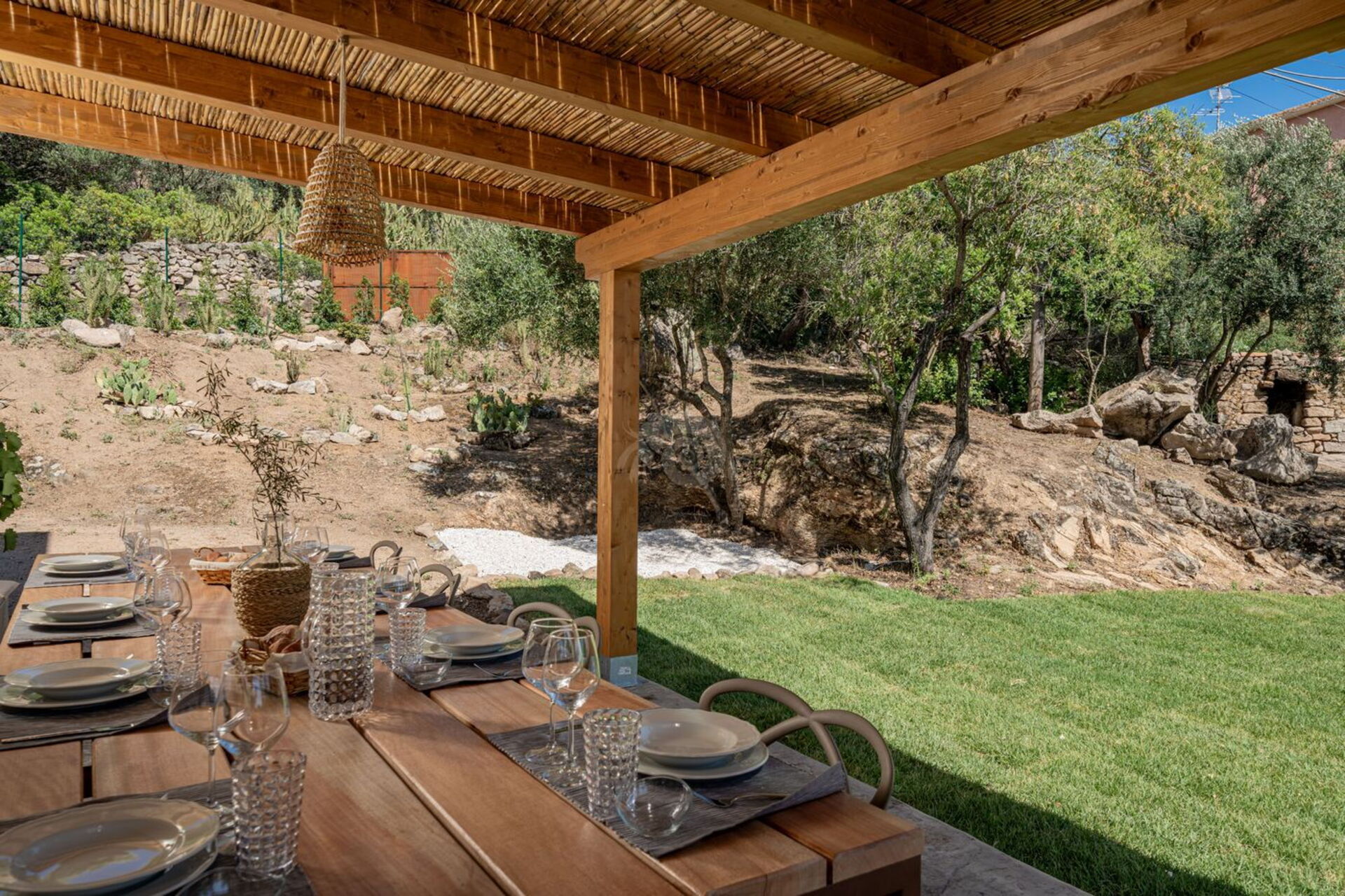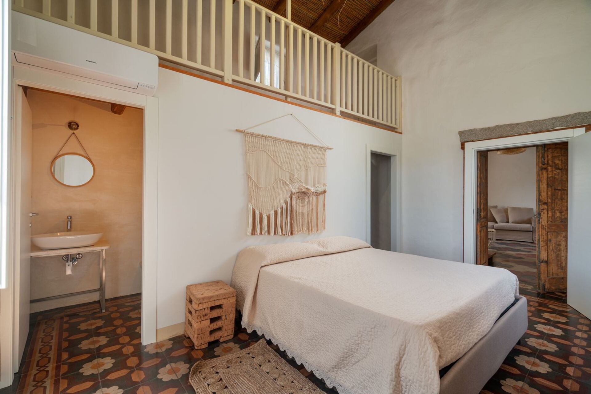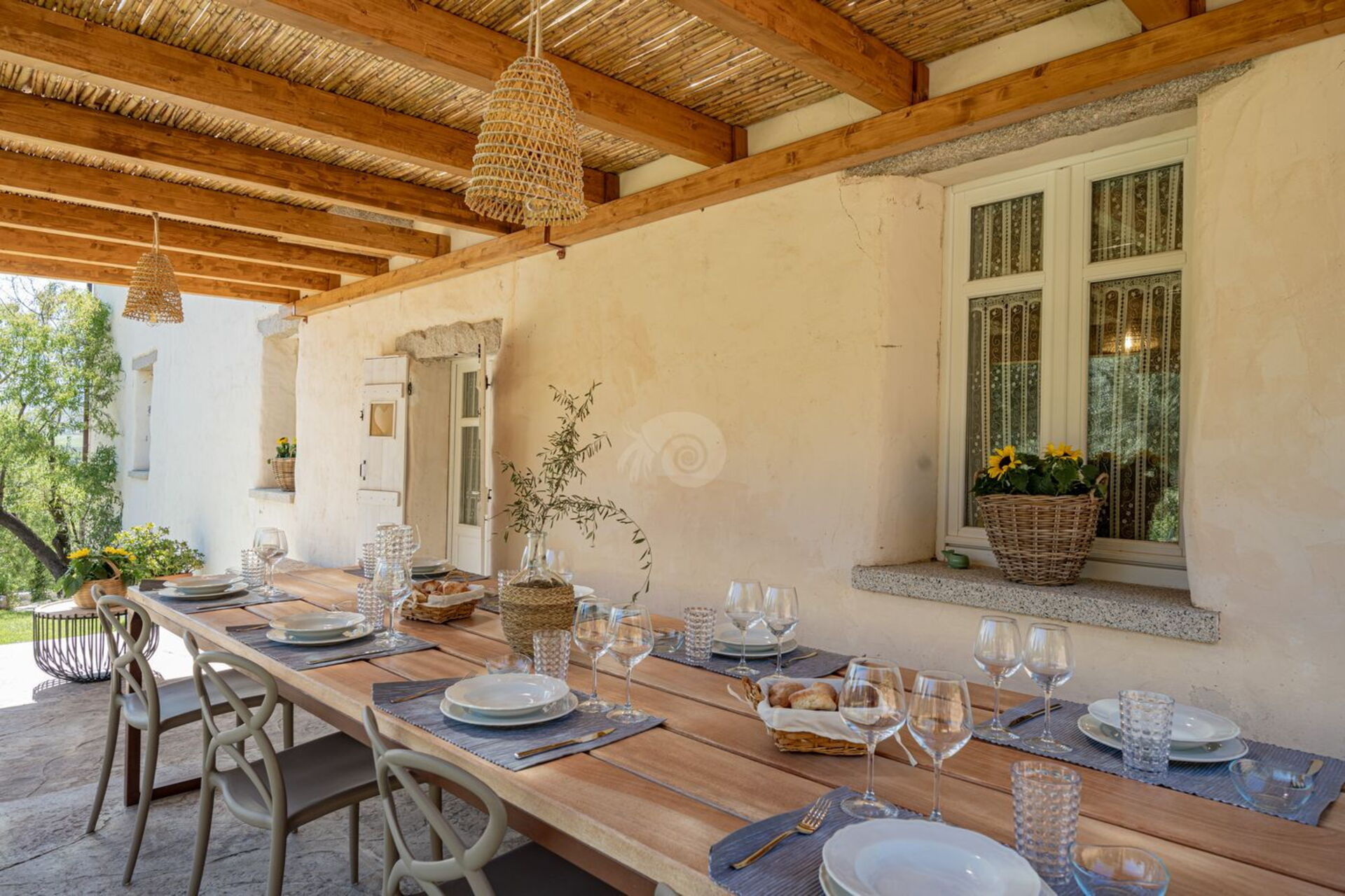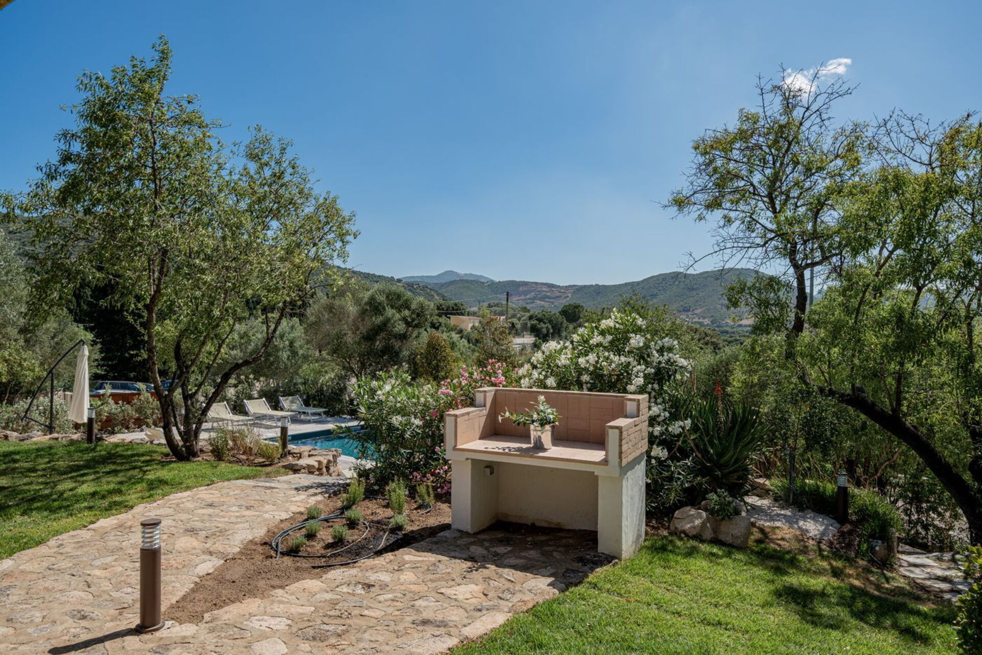 This ancient 19th-century villa for rent in Sardinia has been renovated preserving the historic charm of the foundations, combining elements of to a refined style. This charming property can be reached along a paved path that leads directly to a large and well-kept lawn overlooked by a large veranda. Here there is a large table to comfortably dine outdoors and enjoy the surrounding nature. On the left there is a large paved space which houses a fantastic and clear heated in-ground private swimming pool surrounded by a relaxing solarium area.