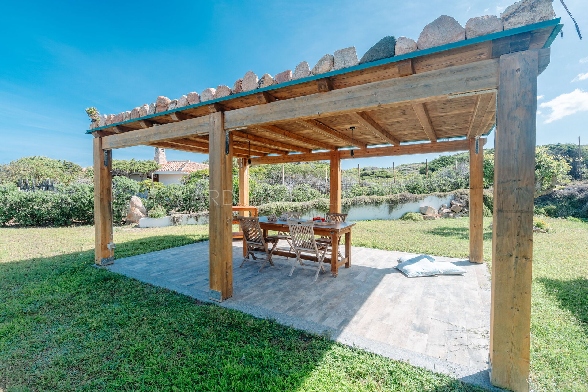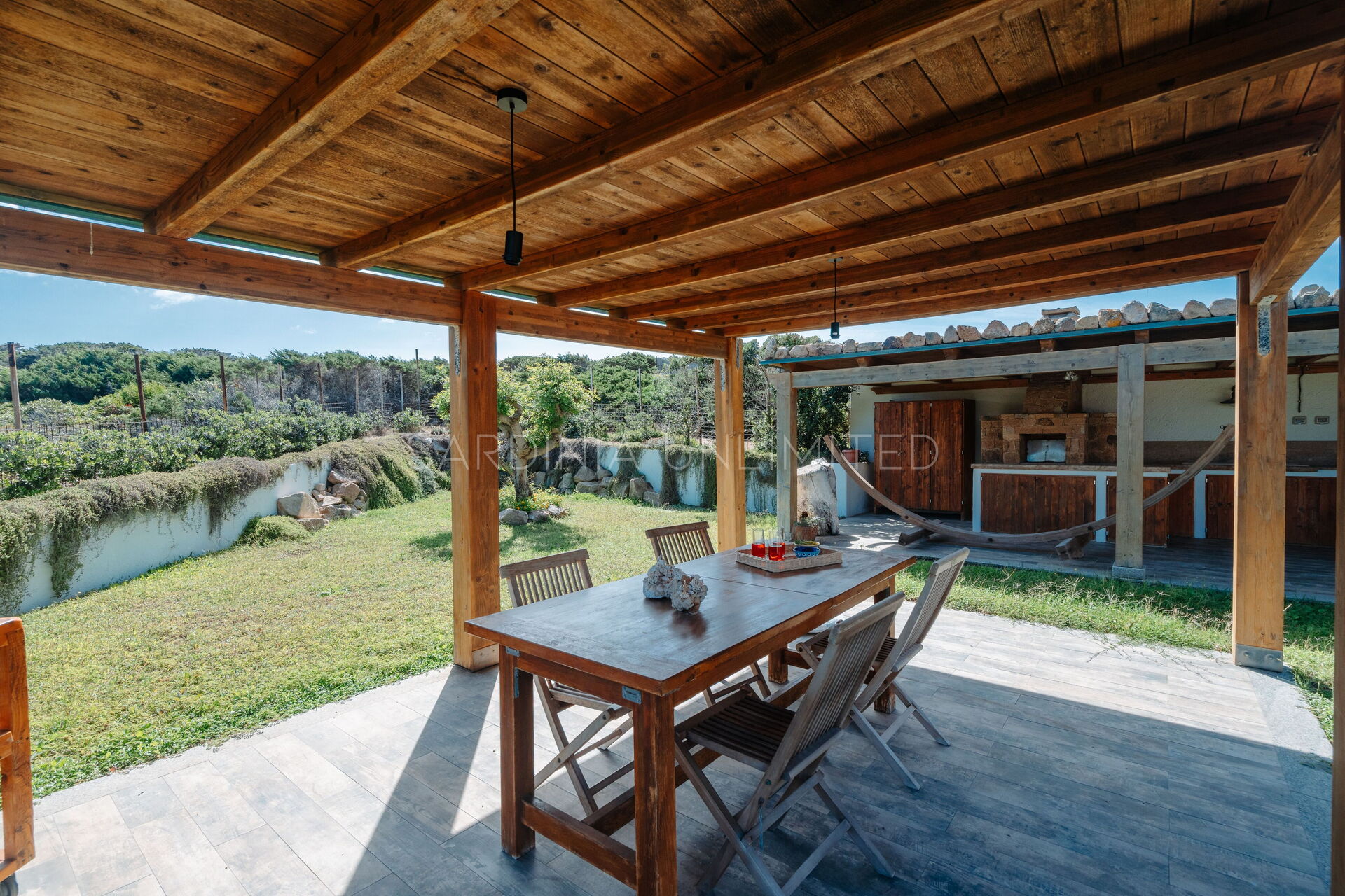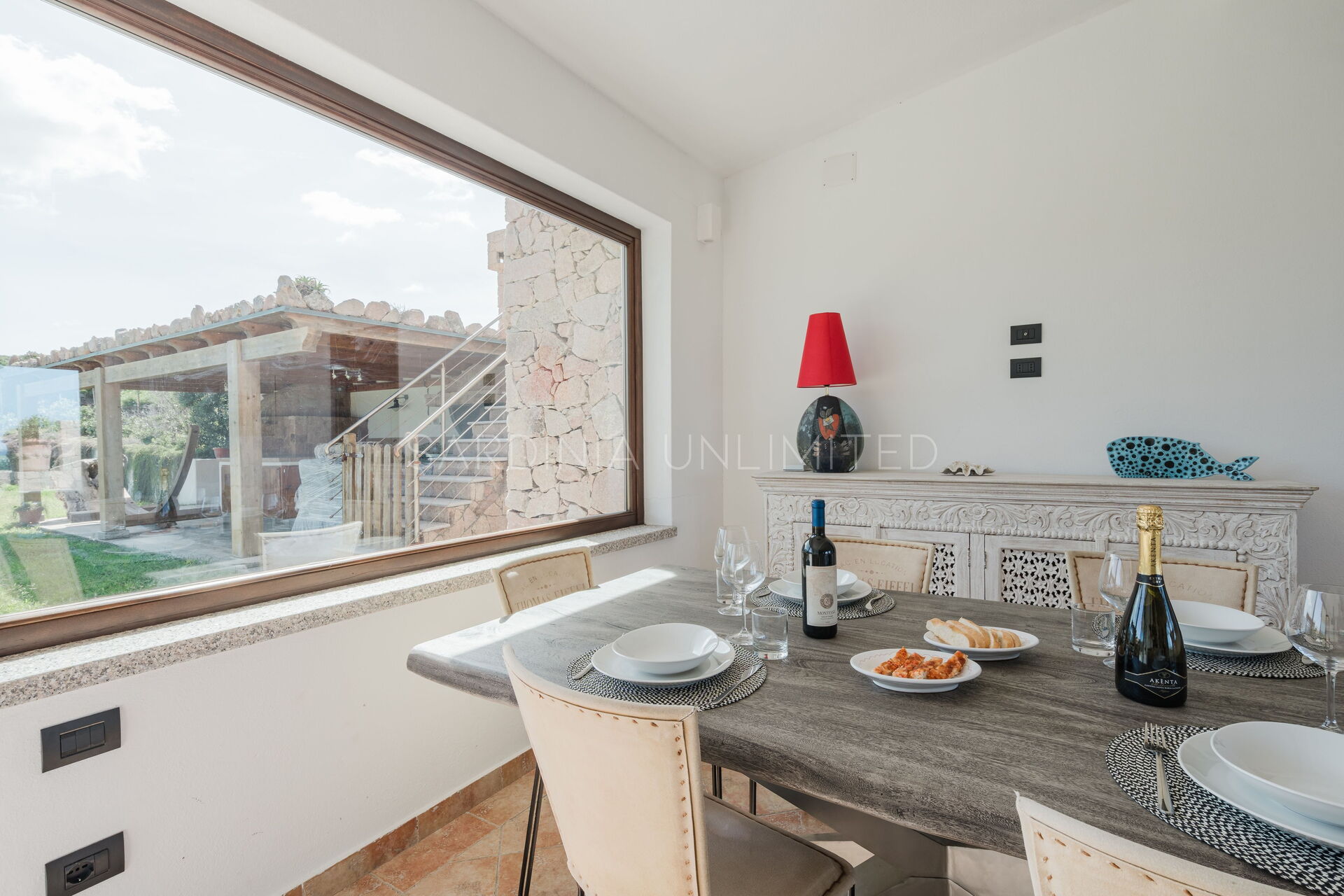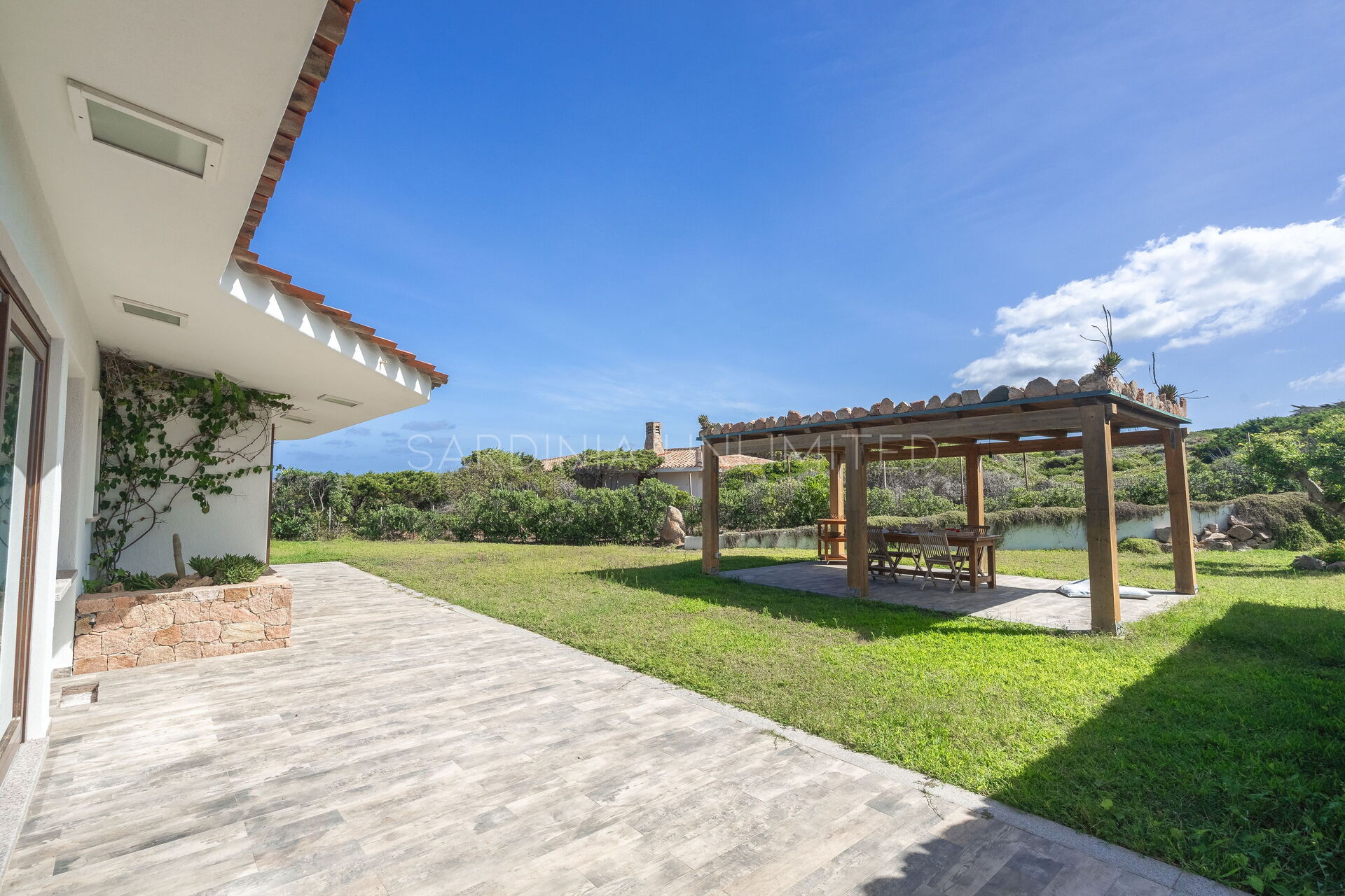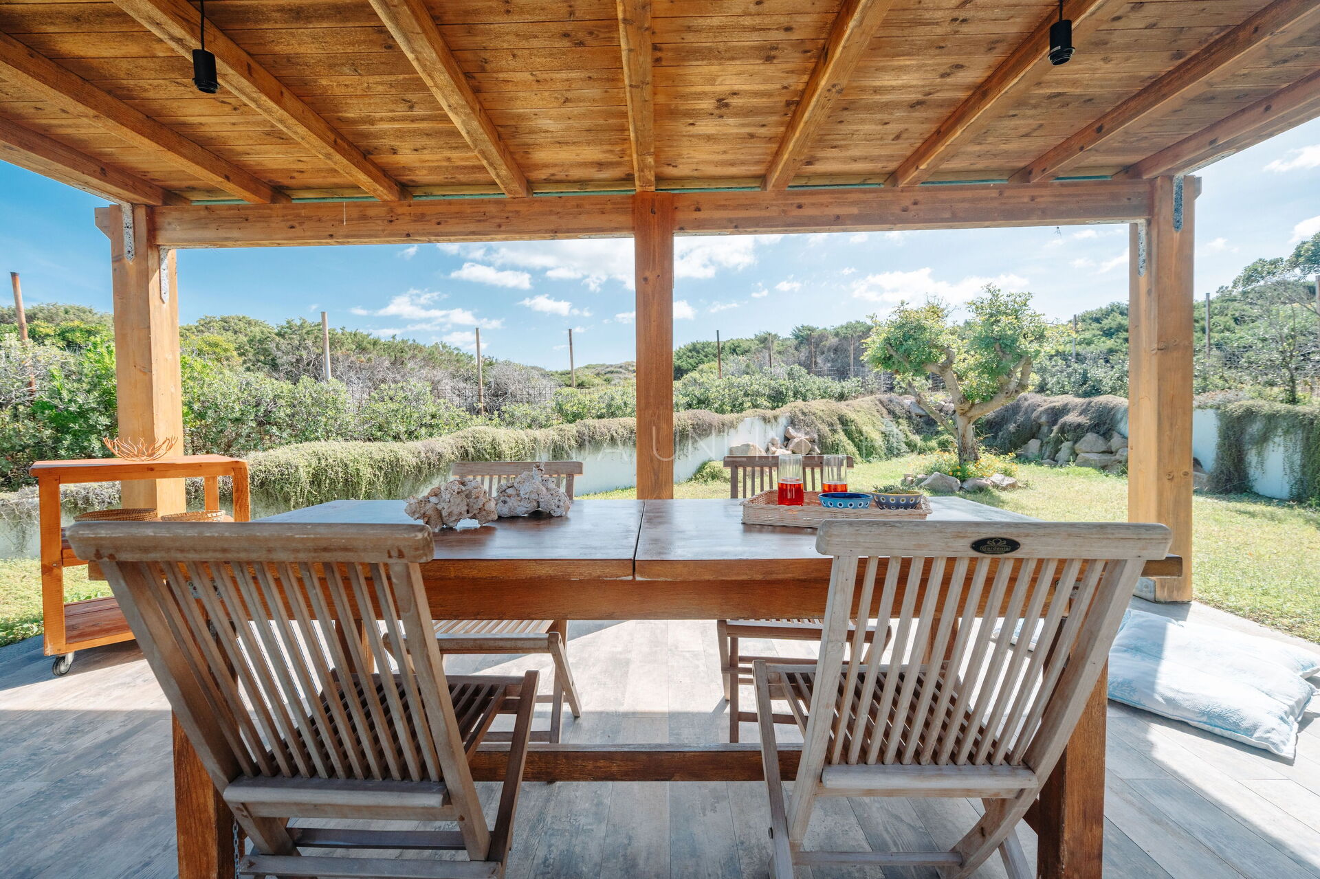 The large outdoor spaces are the real heart of the villa, designed to offer unforgettable moments thanks to the private saltwater pool, surrounded by the colors and scents of the Mediterranean scrub, the lounge areas, and the outdoor barbecue area set up with tables and chairs, allowing you to share unforgettable dinners under the stars of the Sardinian sky, caressed by the sea breeze.