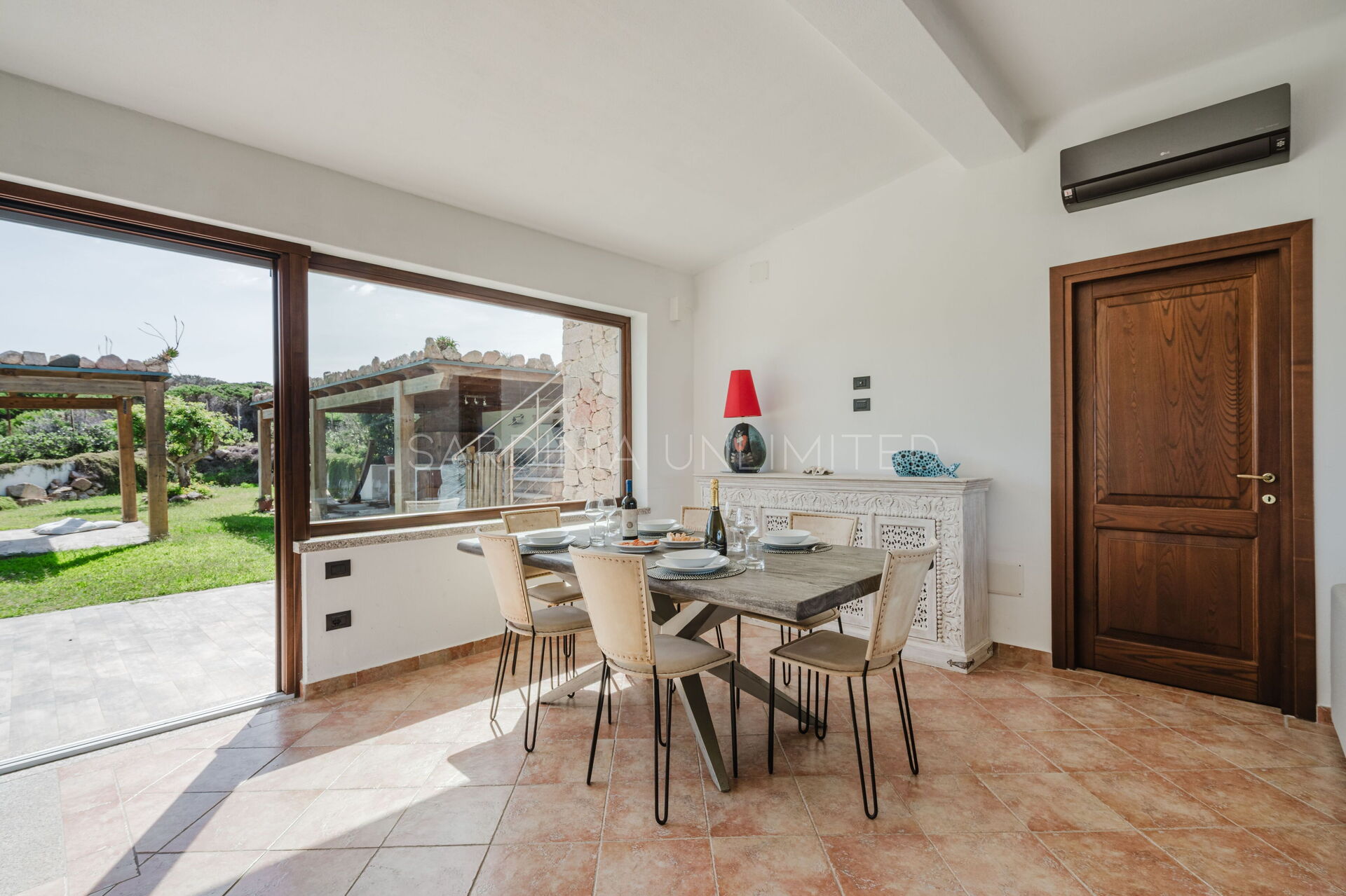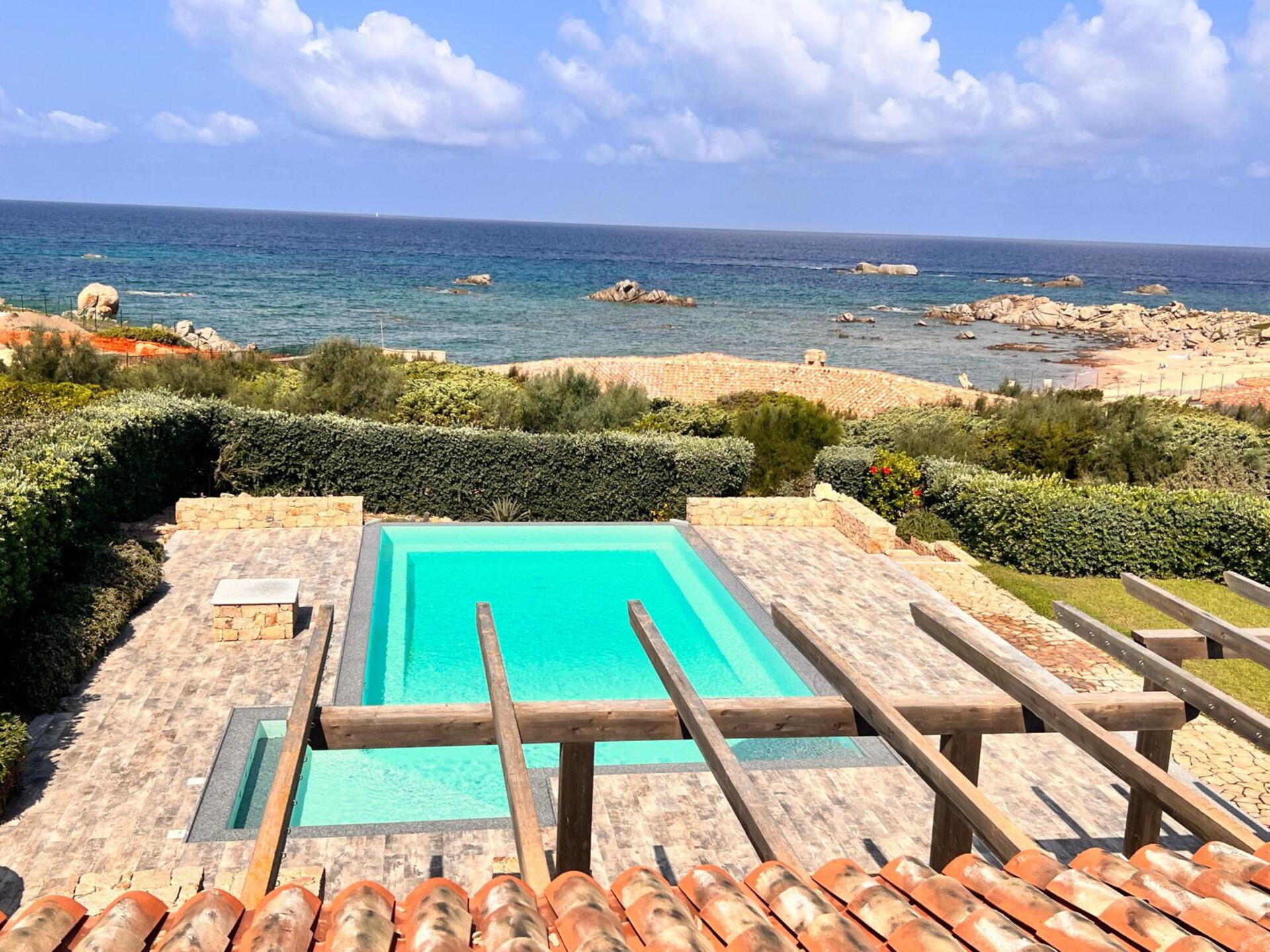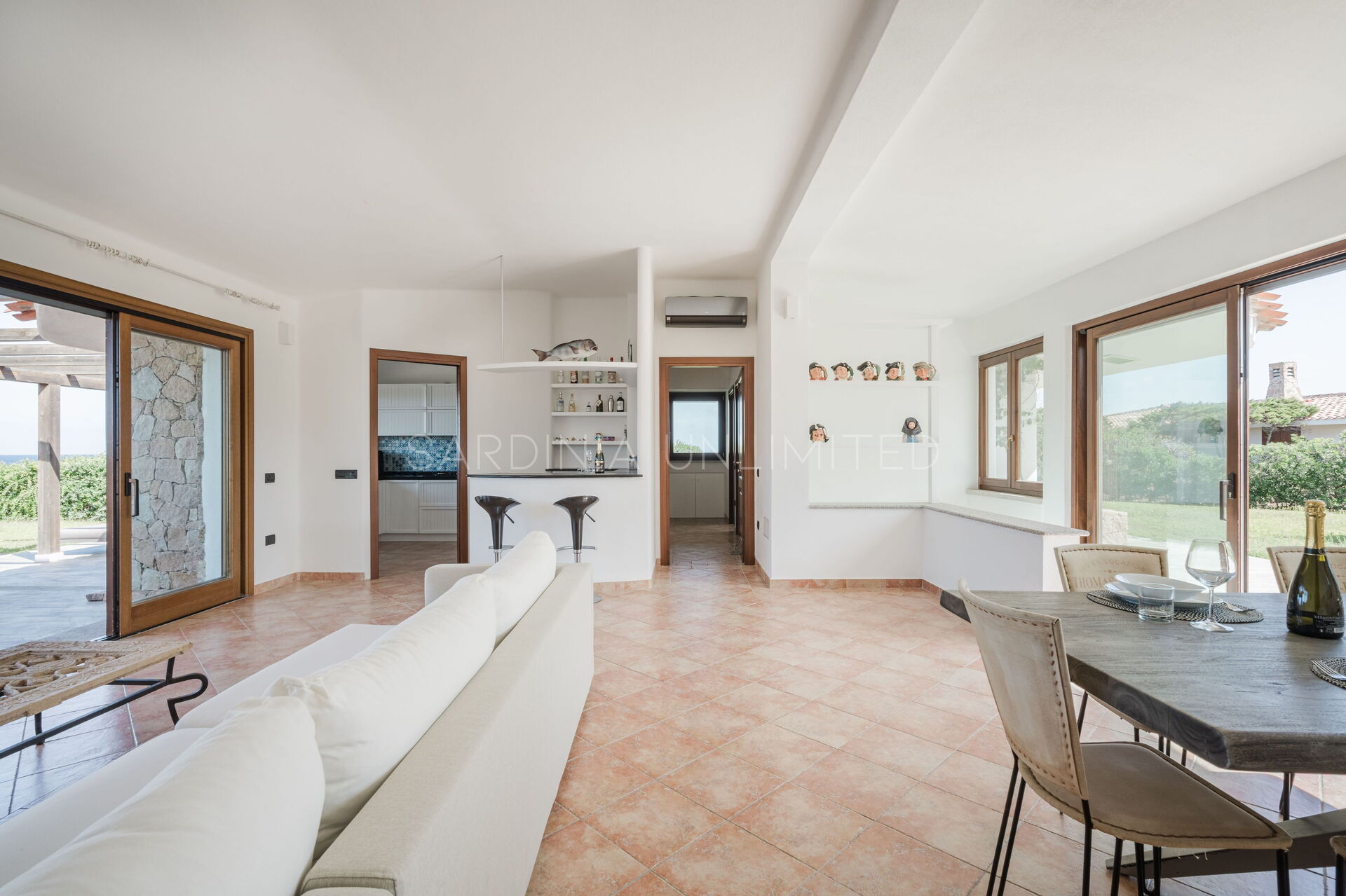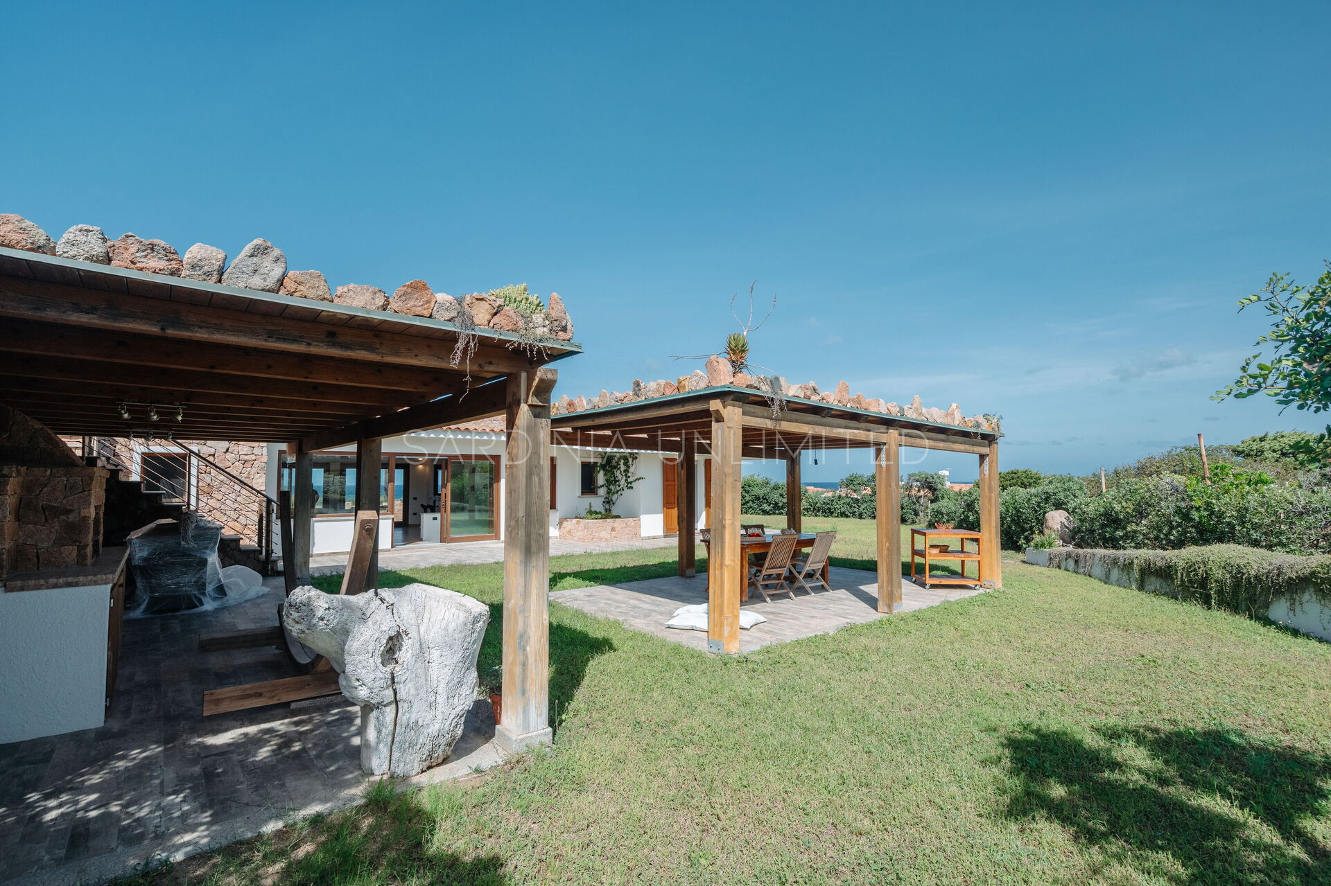 The large outdoor spaces are the real heart of the villa, designed to offer unforgettable moments thanks to the private saltwater pool, surrounded by the colors and scents of the Mediterranean scrub, the lounge areas, and the outdoor barbecue area set up with tables and chairs, allowing you to share unforgettable dinners under the stars of the Sardinian sky, caressed by the sea breeze.