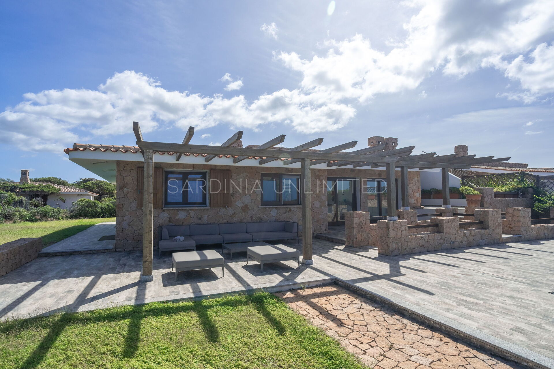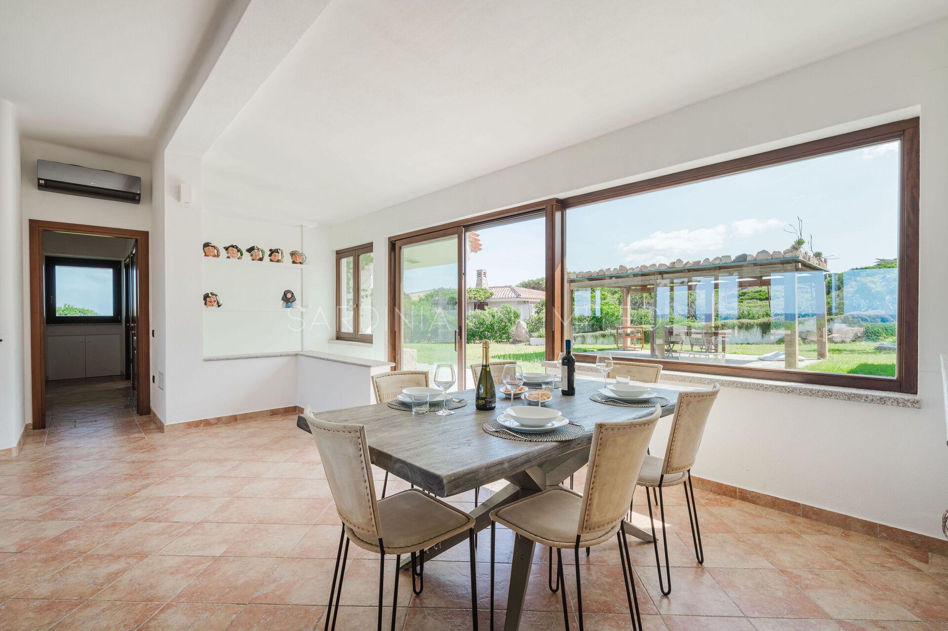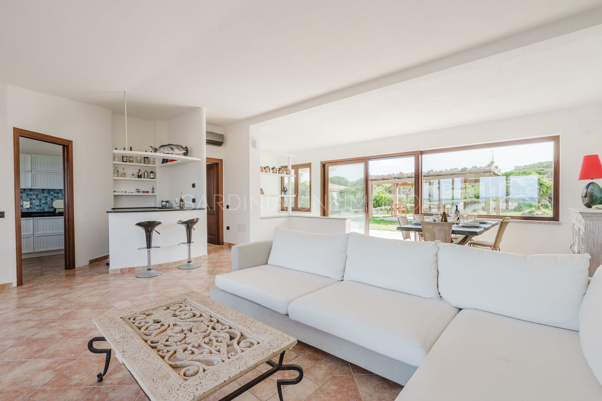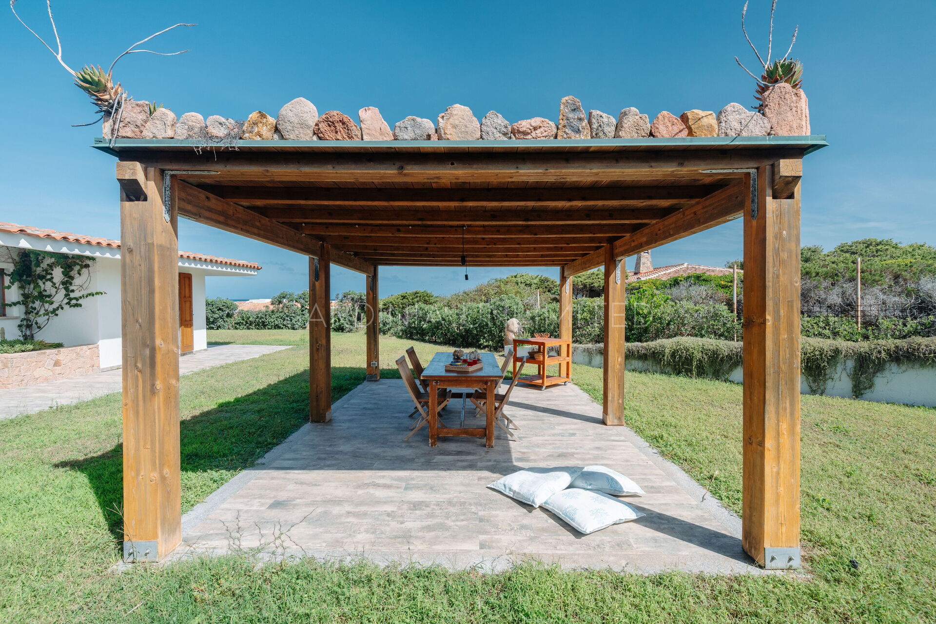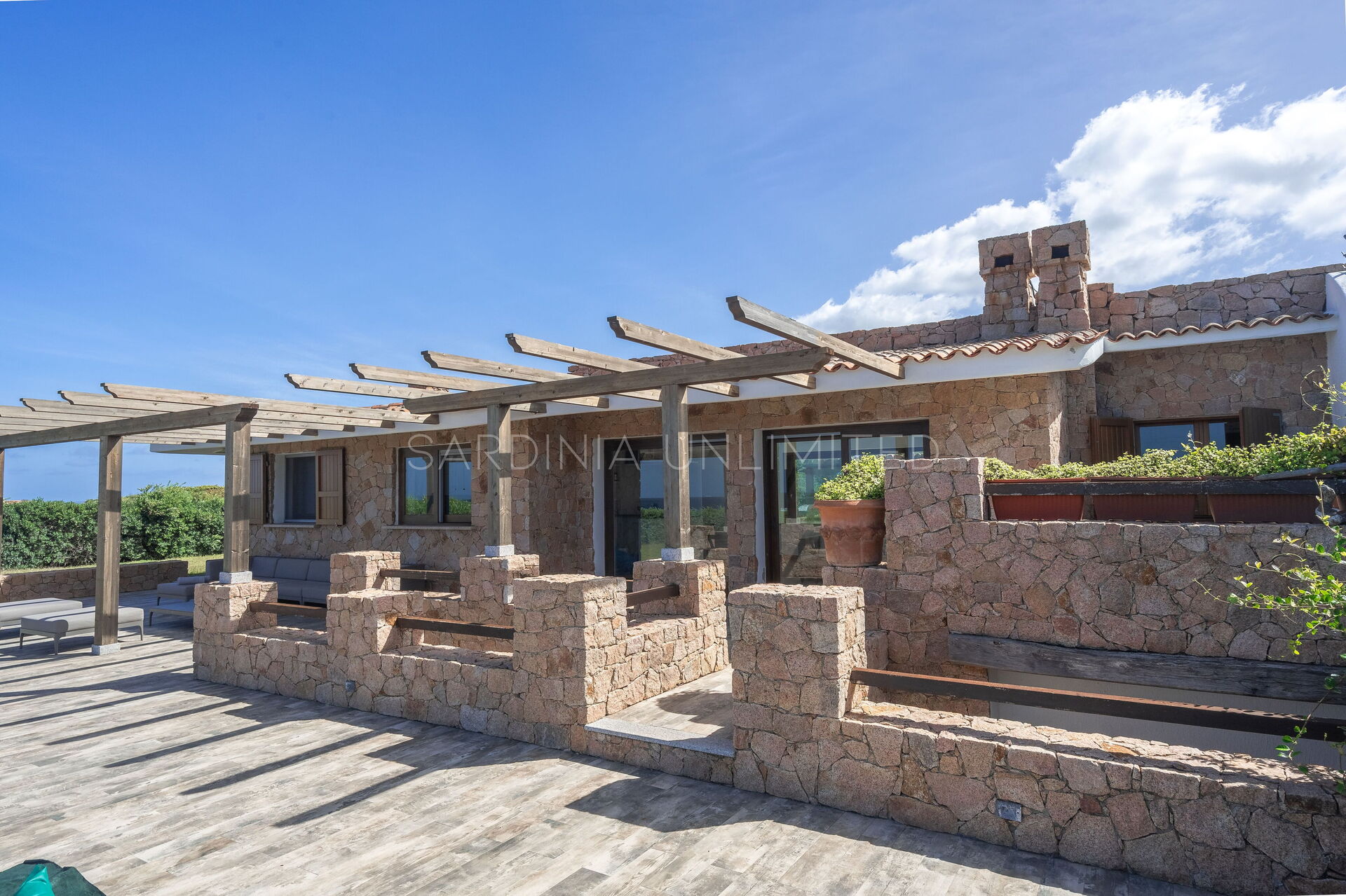 The large outdoor spaces are the real heart of the villa, designed to offer unforgettable moments thanks to the private saltwater pool, surrounded by the colors and scents of the Mediterranean scrub, the lounge areas, and the outdoor barbecue area set up with tables and chairs, allowing you to share unforgettable dinners under the stars of the Sardinian sky, caressed by the sea breeze.