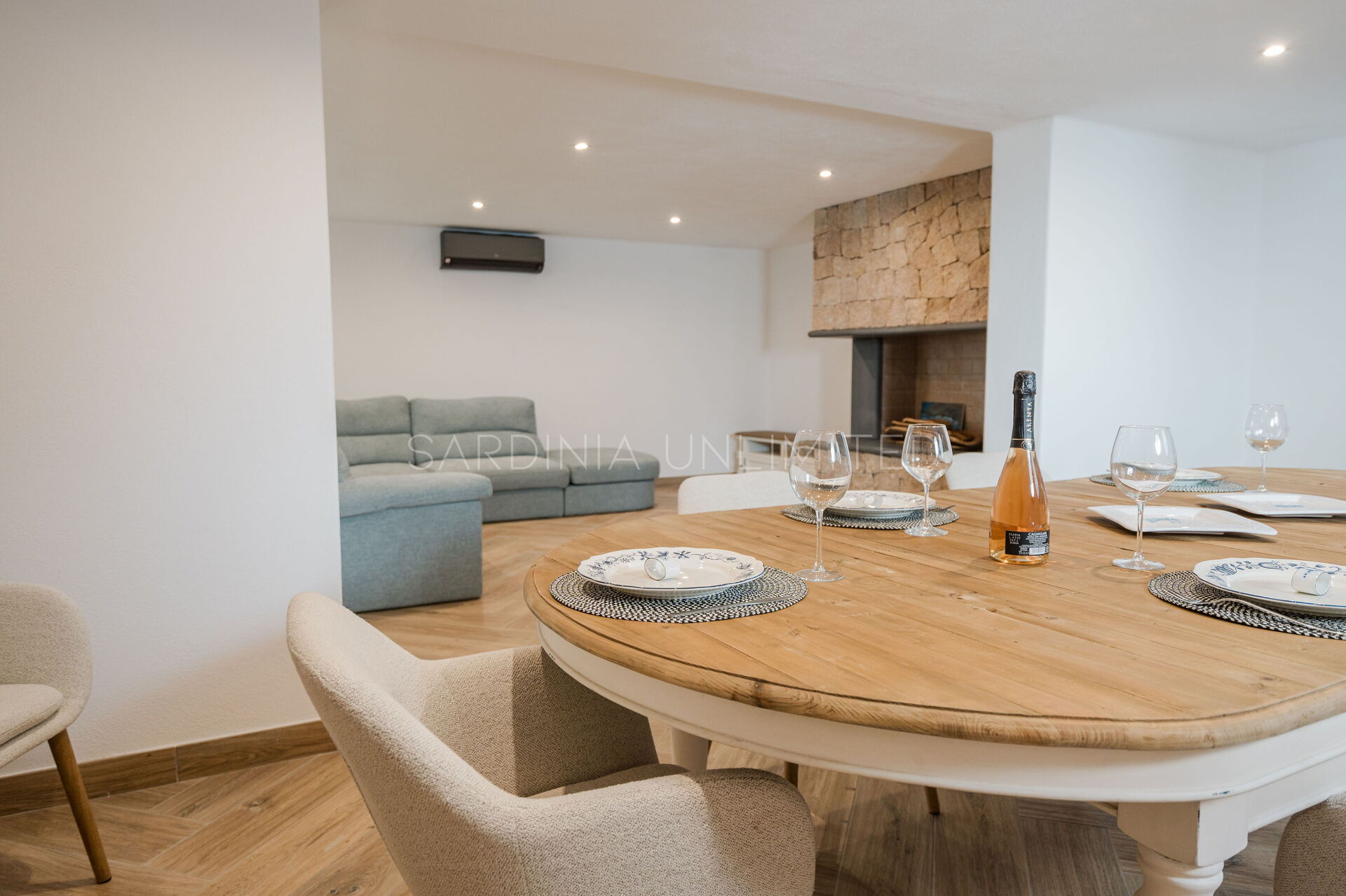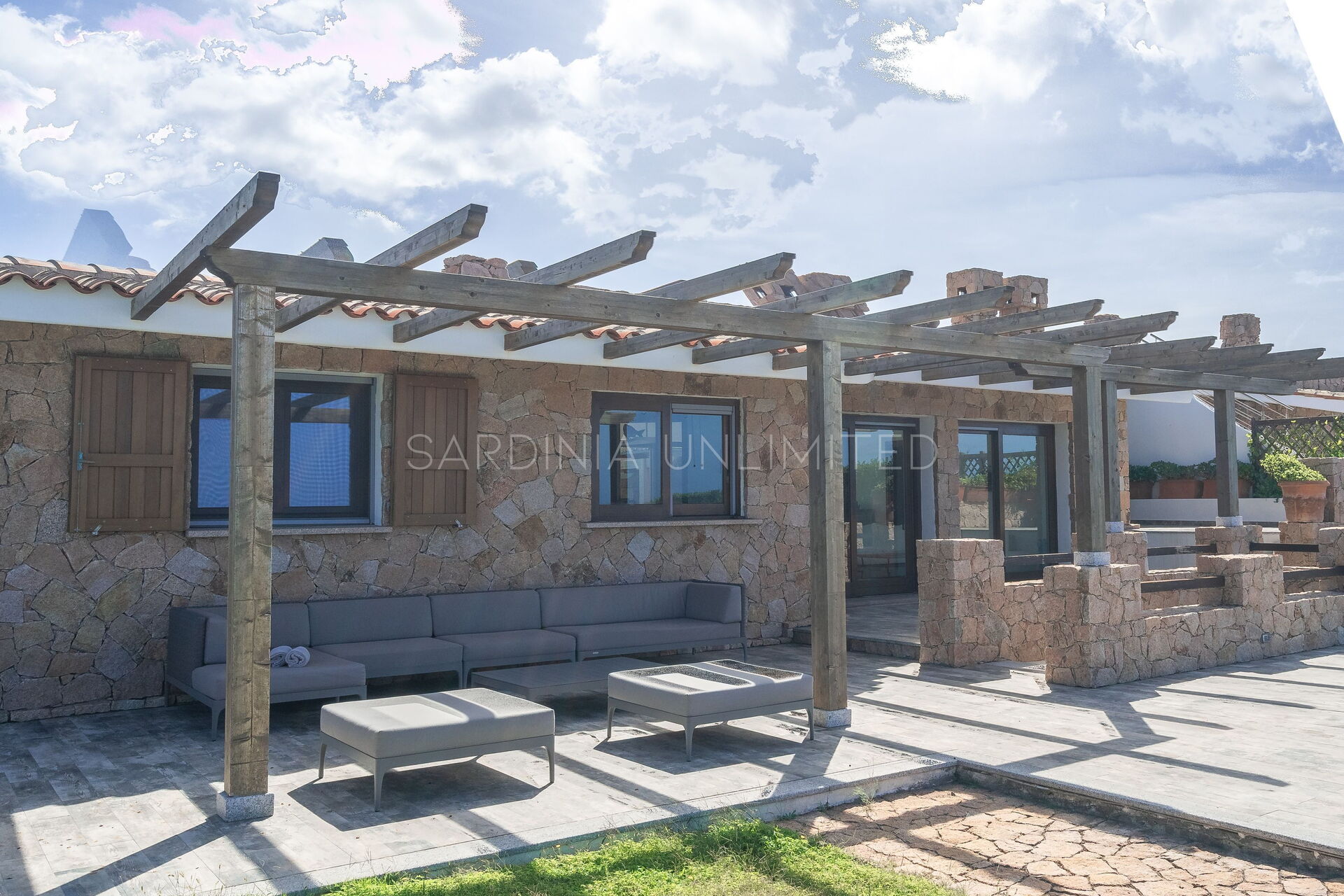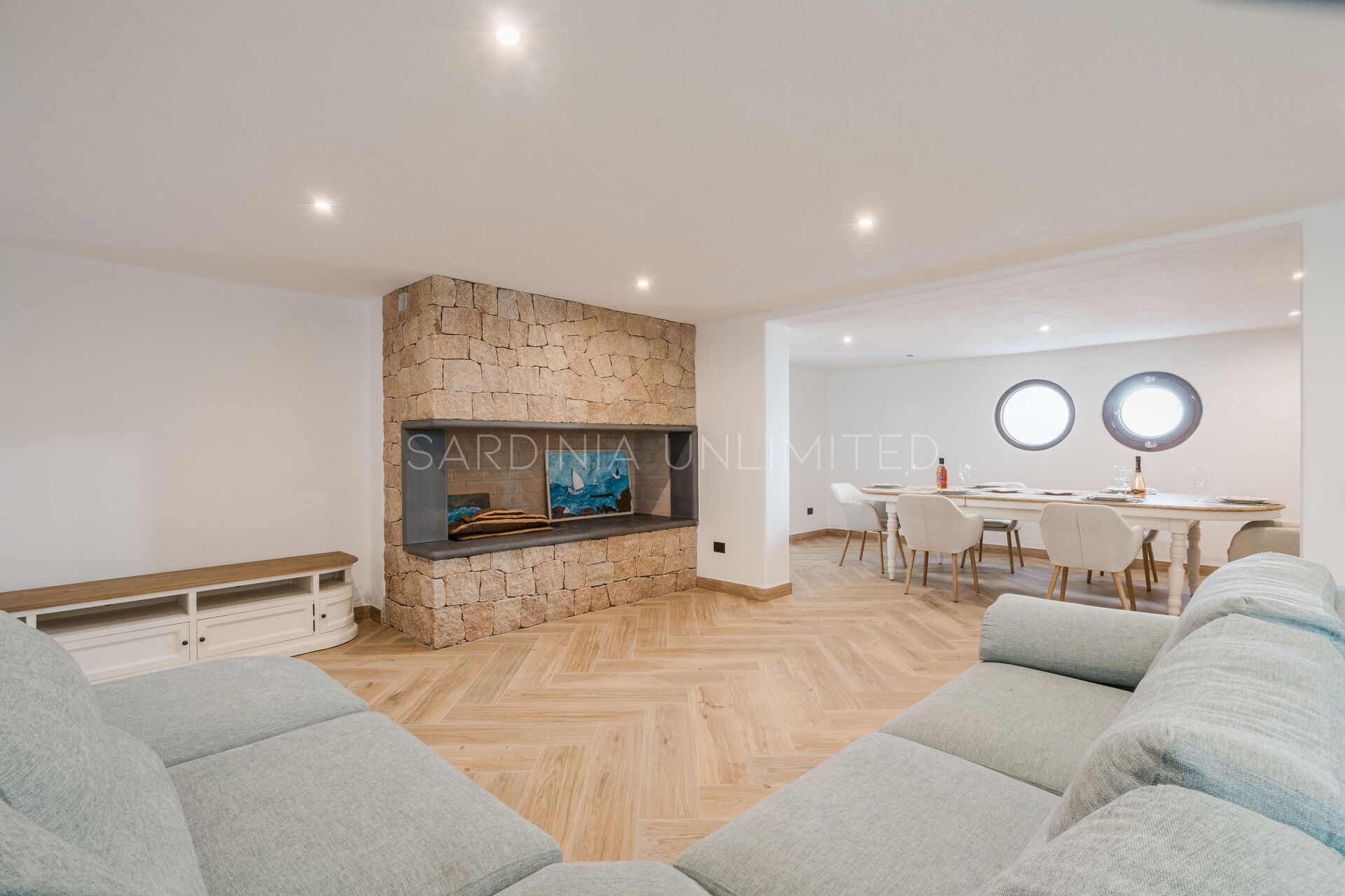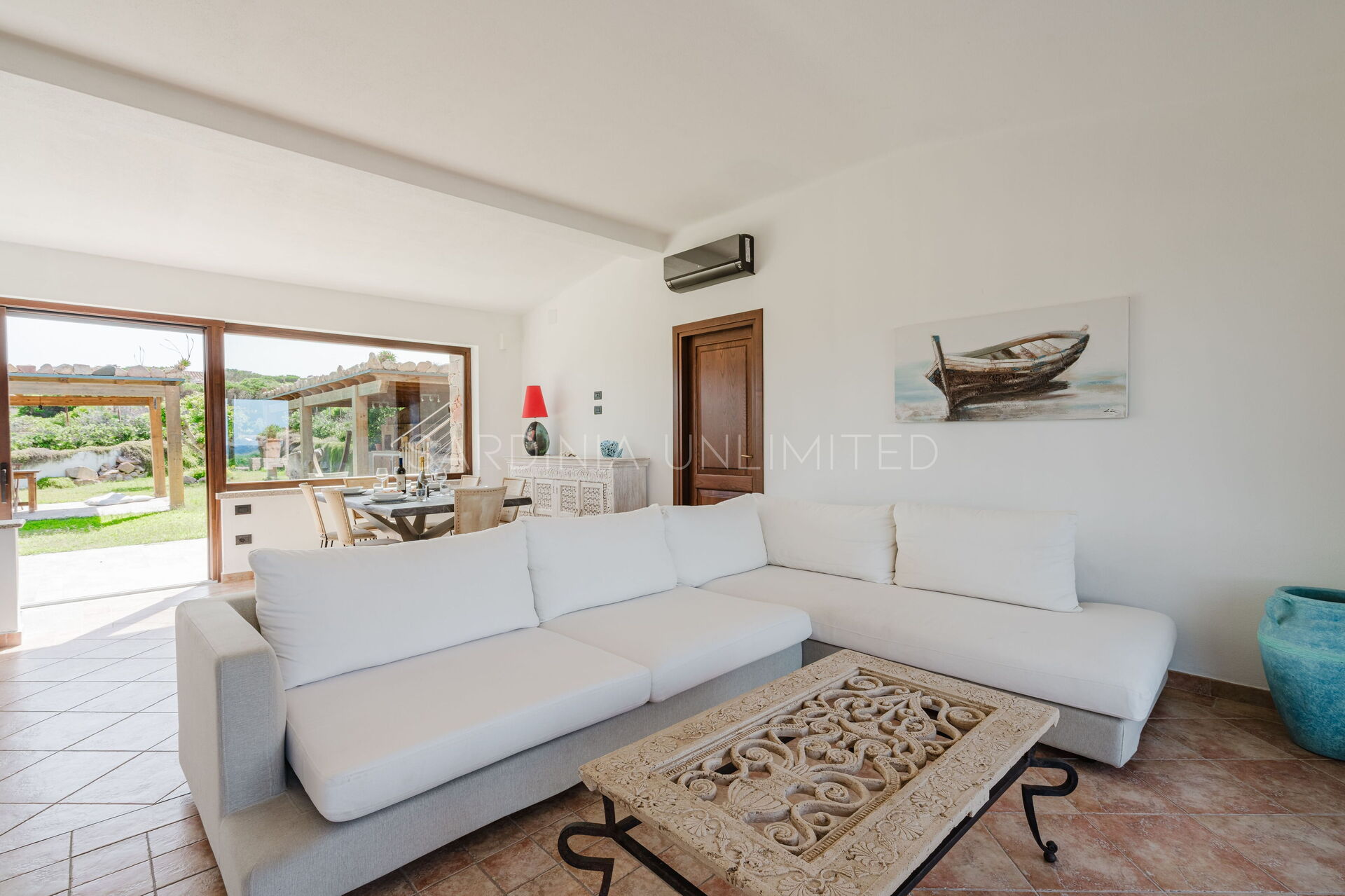 The large outdoor spaces are the real heart of the villa, designed to offer unforgettable moments thanks to the private saltwater pool, surrounded by the colors and scents of the Mediterranean scrub, the lounge areas, and the outdoor barbecue area set up with tables and chairs, allowing you to share unforgettable dinners under the stars of the Sardinian sky, caressed by the sea breeze.