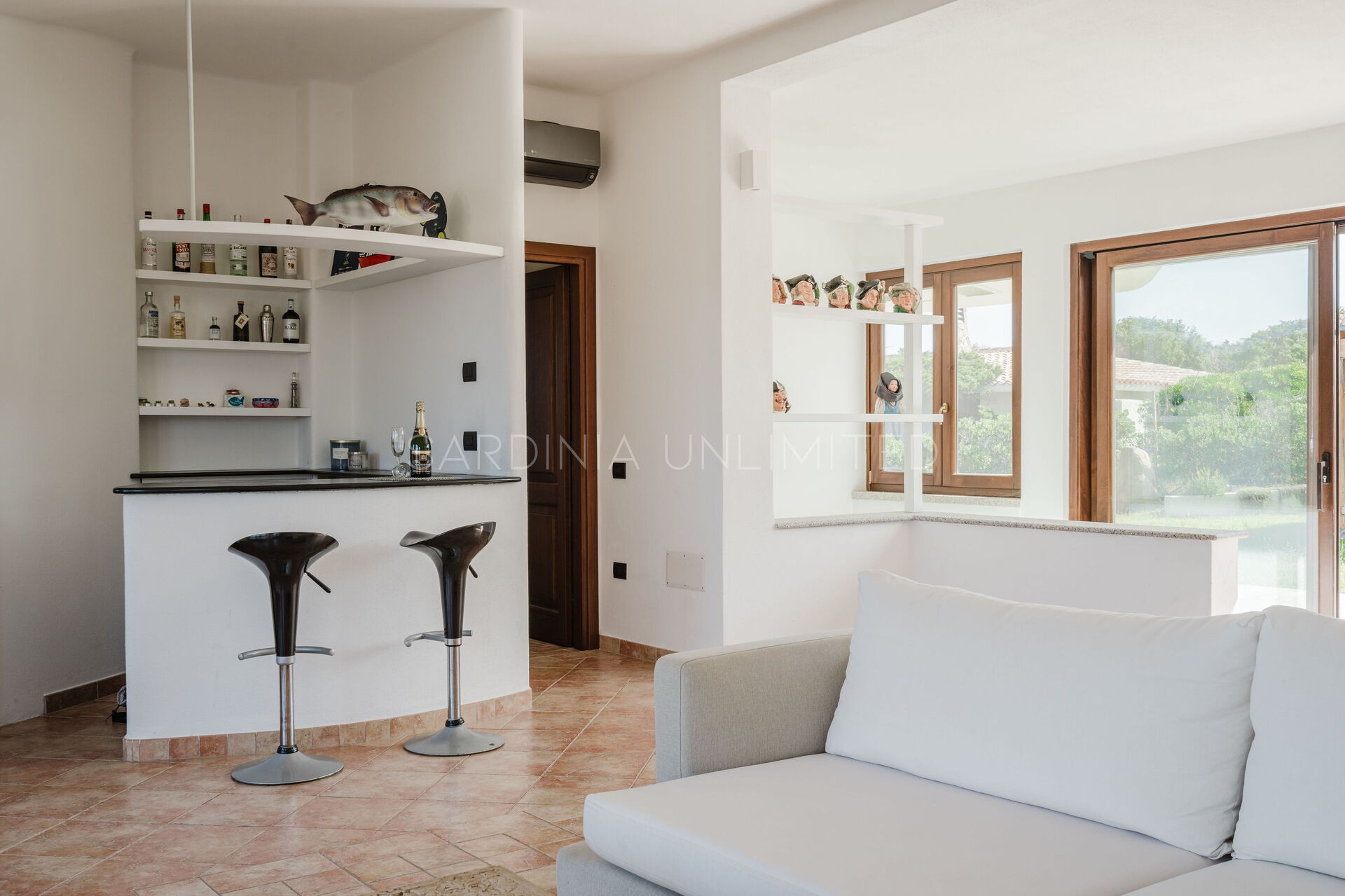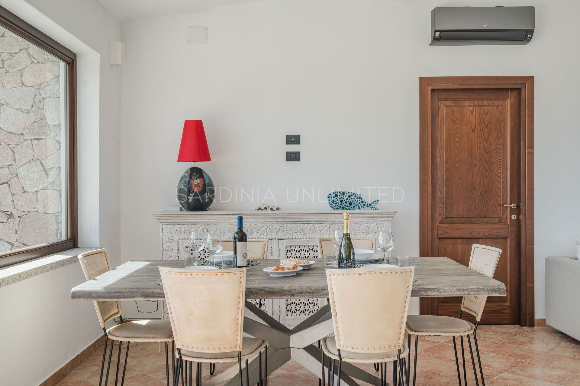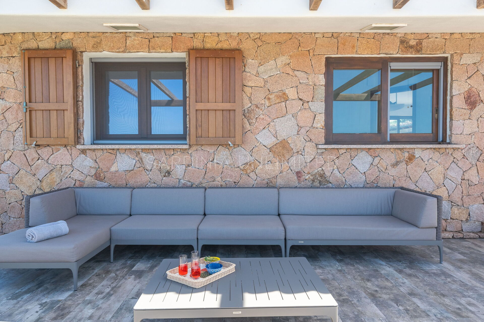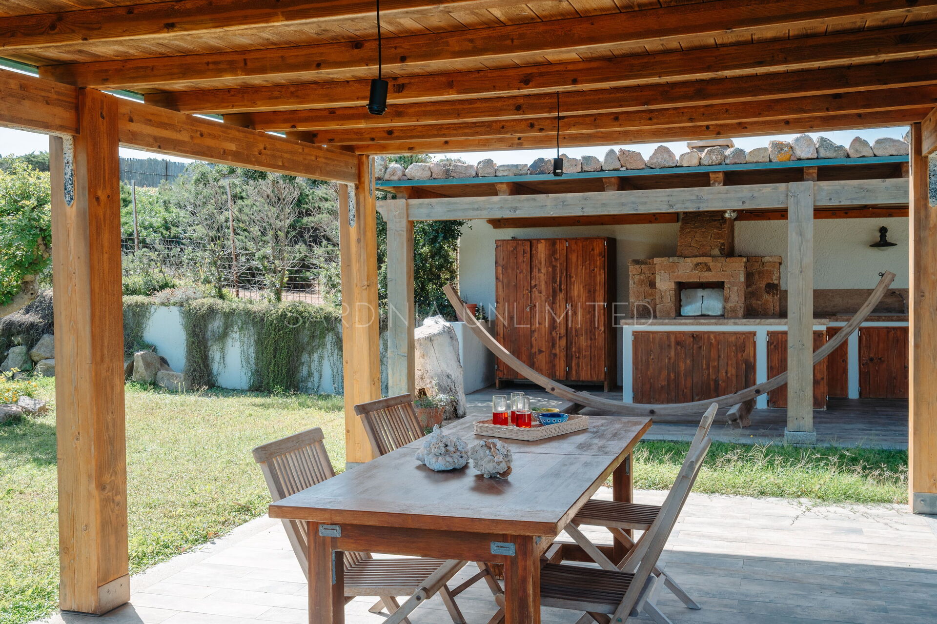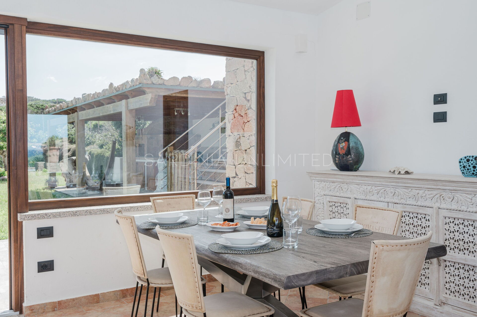The large outdoor spaces are the real heart of the villa, designed to offer unforgettable moments thanks to the private saltwater pool, surrounded by the colors and scents of the Mediterranean scrub, the lounge areas, and the outdoor barbecue area set up with tables and chairs, allowing you to share unforgettable dinners under the stars of the Sardinian sky, caressed by the sea breeze.
