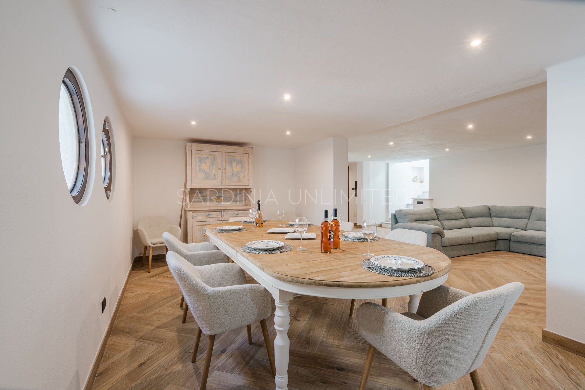 Leaving the outdoor area, you are welcomed by the open-plan upper floor. The living room, with its large sofas, and the dining area are bathed in a bright atmosphere, thanks to large windows that offer splendid glimpses of the sea. The modern style and essential design are reflected in the well-curated furnishings with clean lines, creating a space that ensures a fluid continuity between indoors and outdoors.