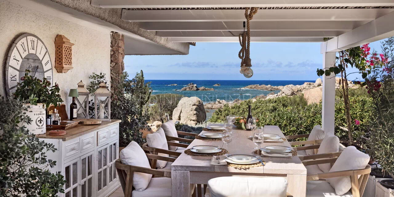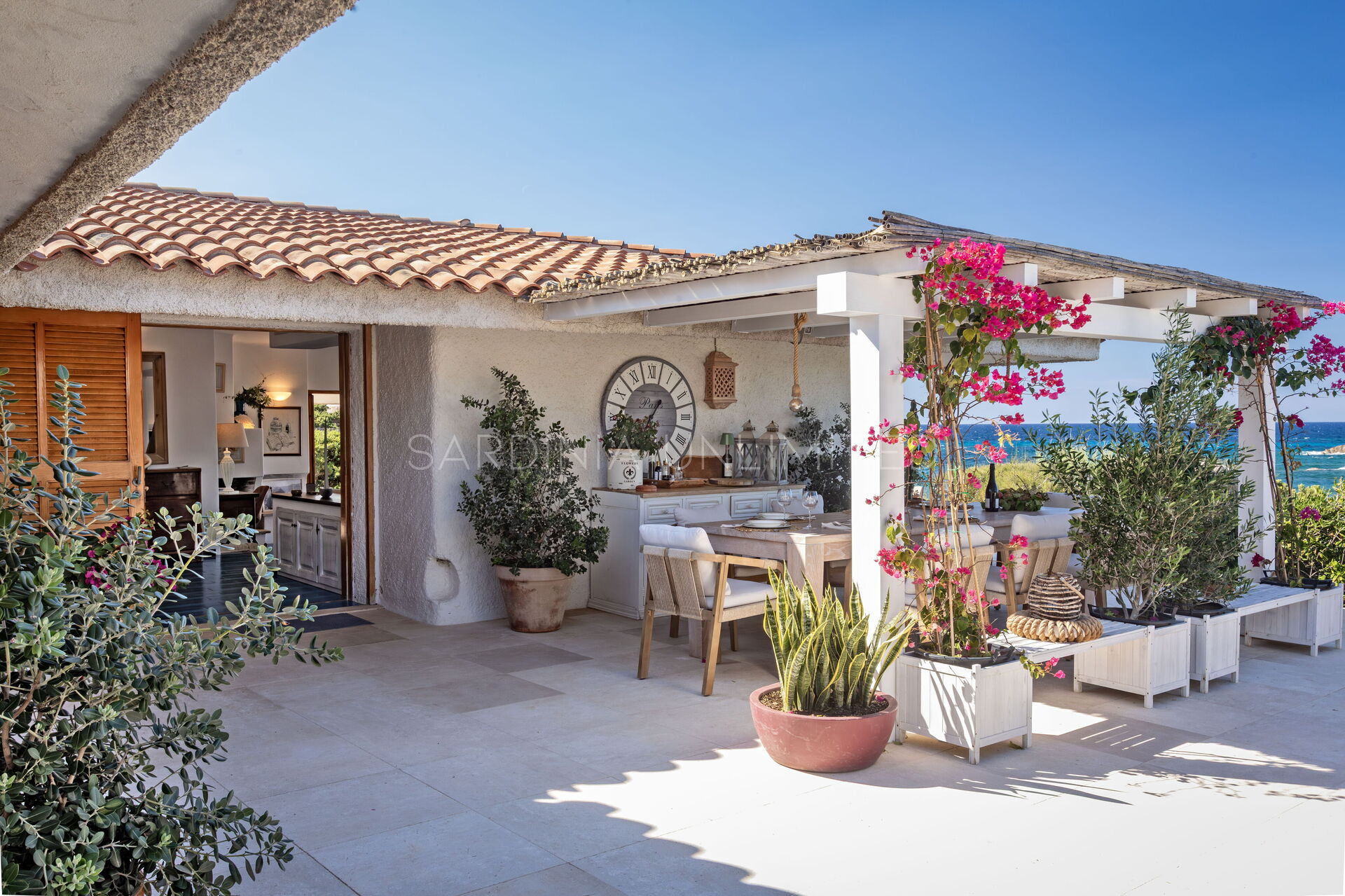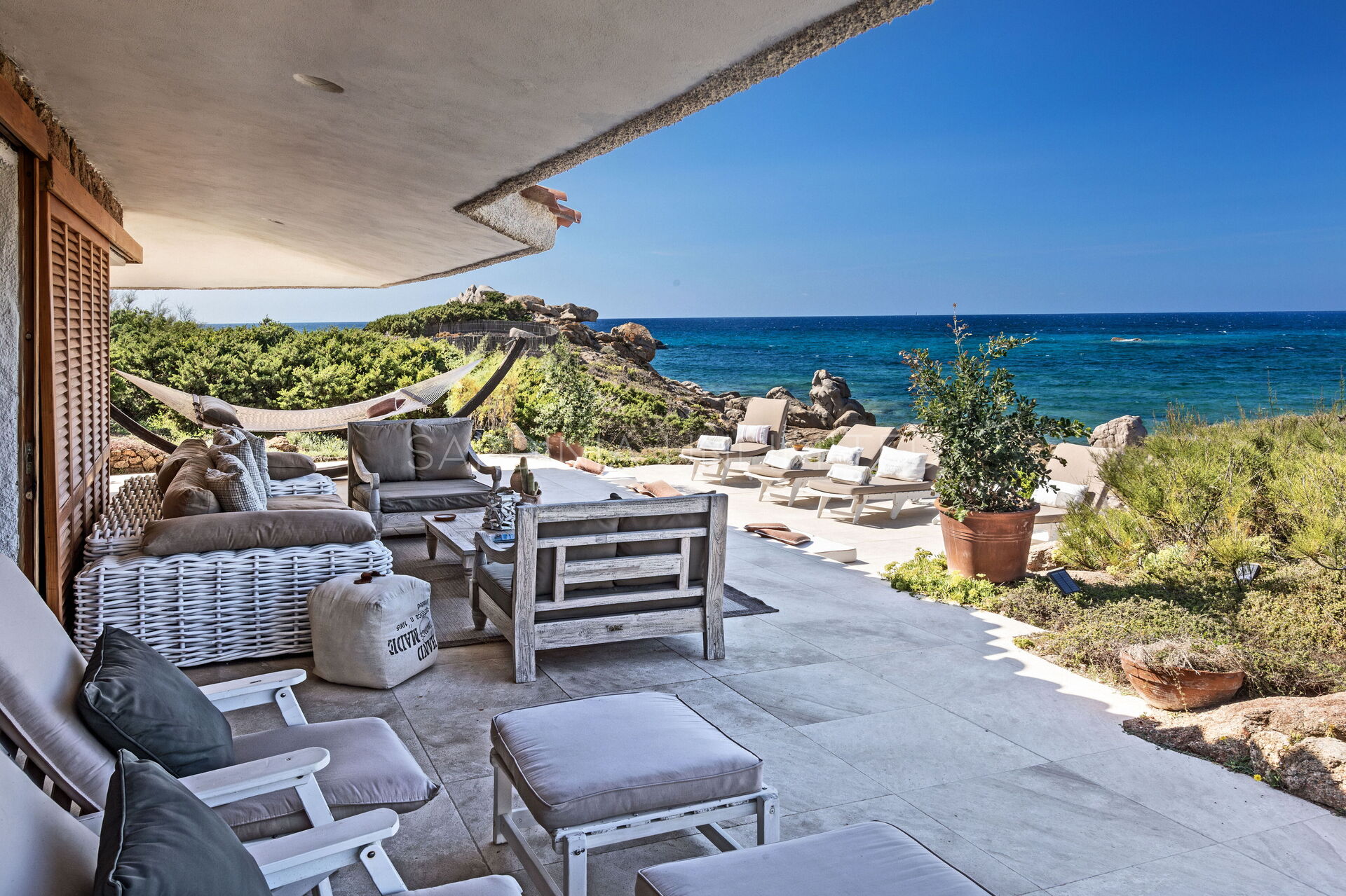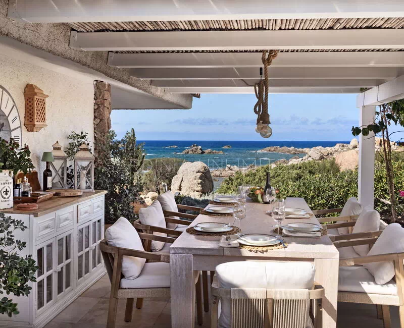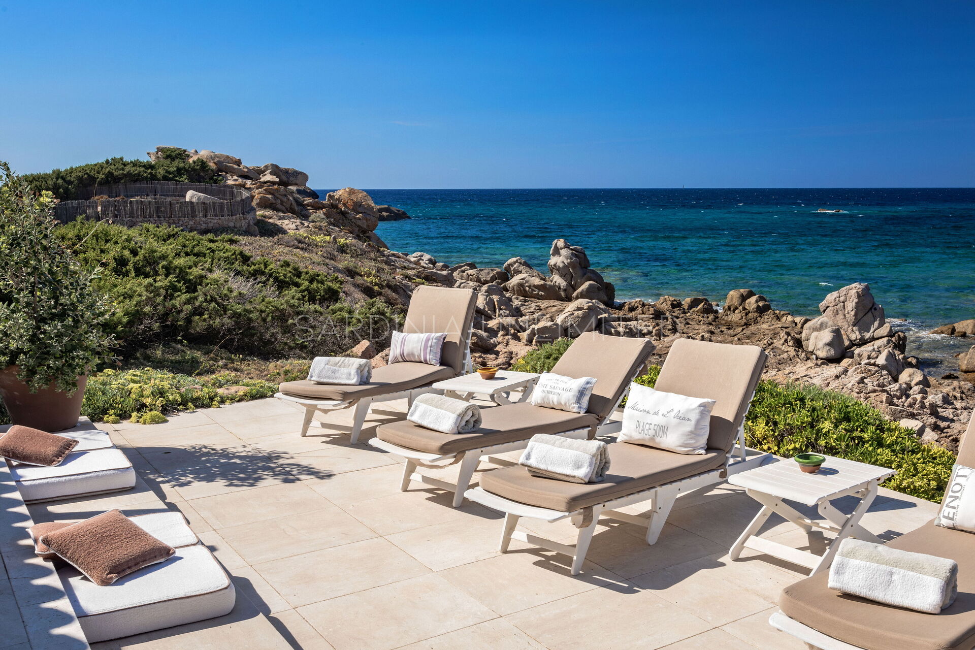 The covered and fully equipped veranda is ideal for social gatherings and al fresco dining, perfect for enjoying the Sardinian climate in complete relaxation. In addition, several dedicated lounge areas have been designed to offer maximum tranquility, allowing you to unwind, accompanied only by the soothing sound of the waves. An extra rear area, also furnished with a table and chairs, creates intimate corners for quiet breakfasts or aperitifs in an atmosphere of total serenity.