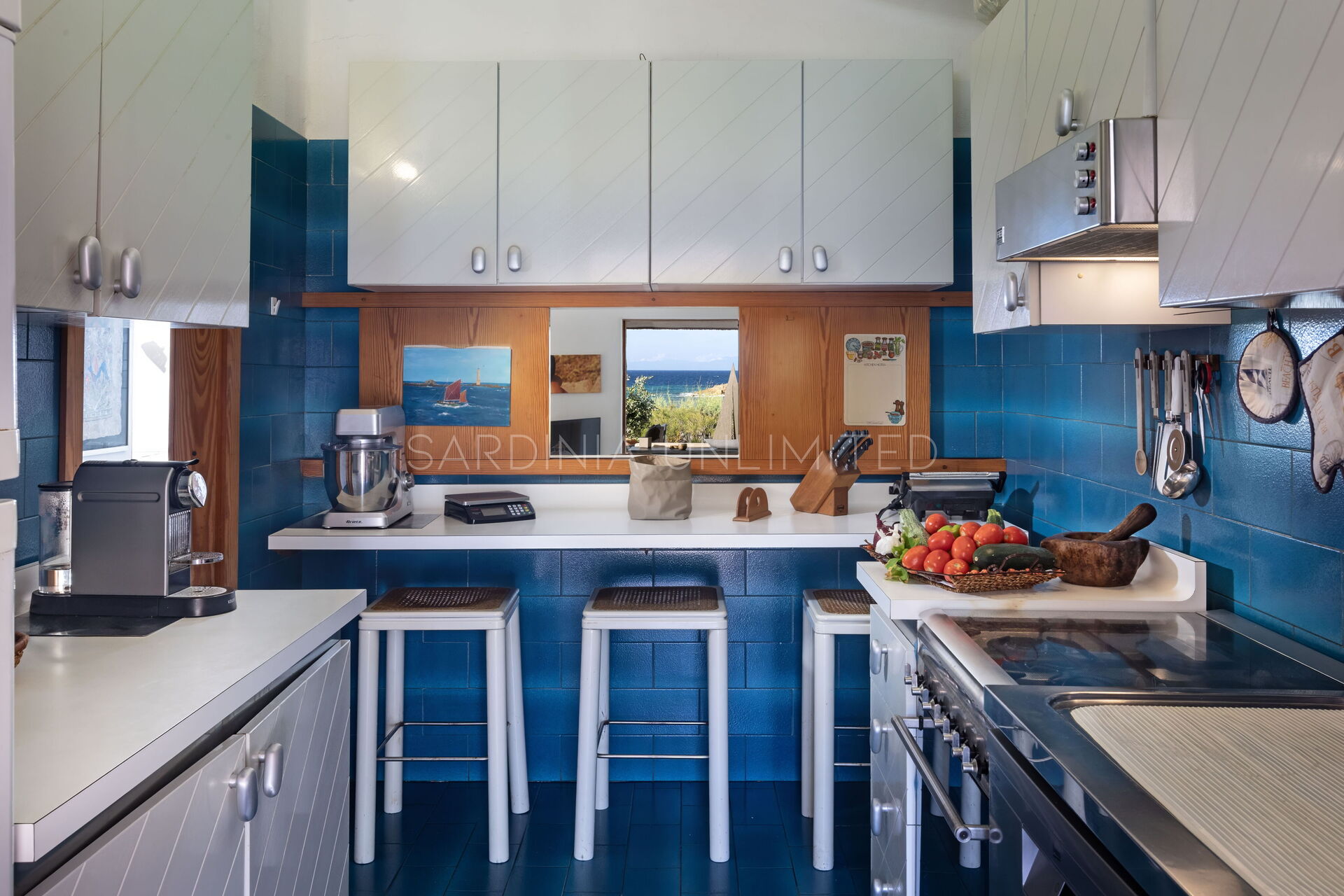The small kitchen is well-equipped with light-coloured cabinet doors to maintain consistency with the living room's neutral tones, and elements that echo the blue tones of the sea. Despite its contained size, it is equipped with modern appliances and all necessary comforts.