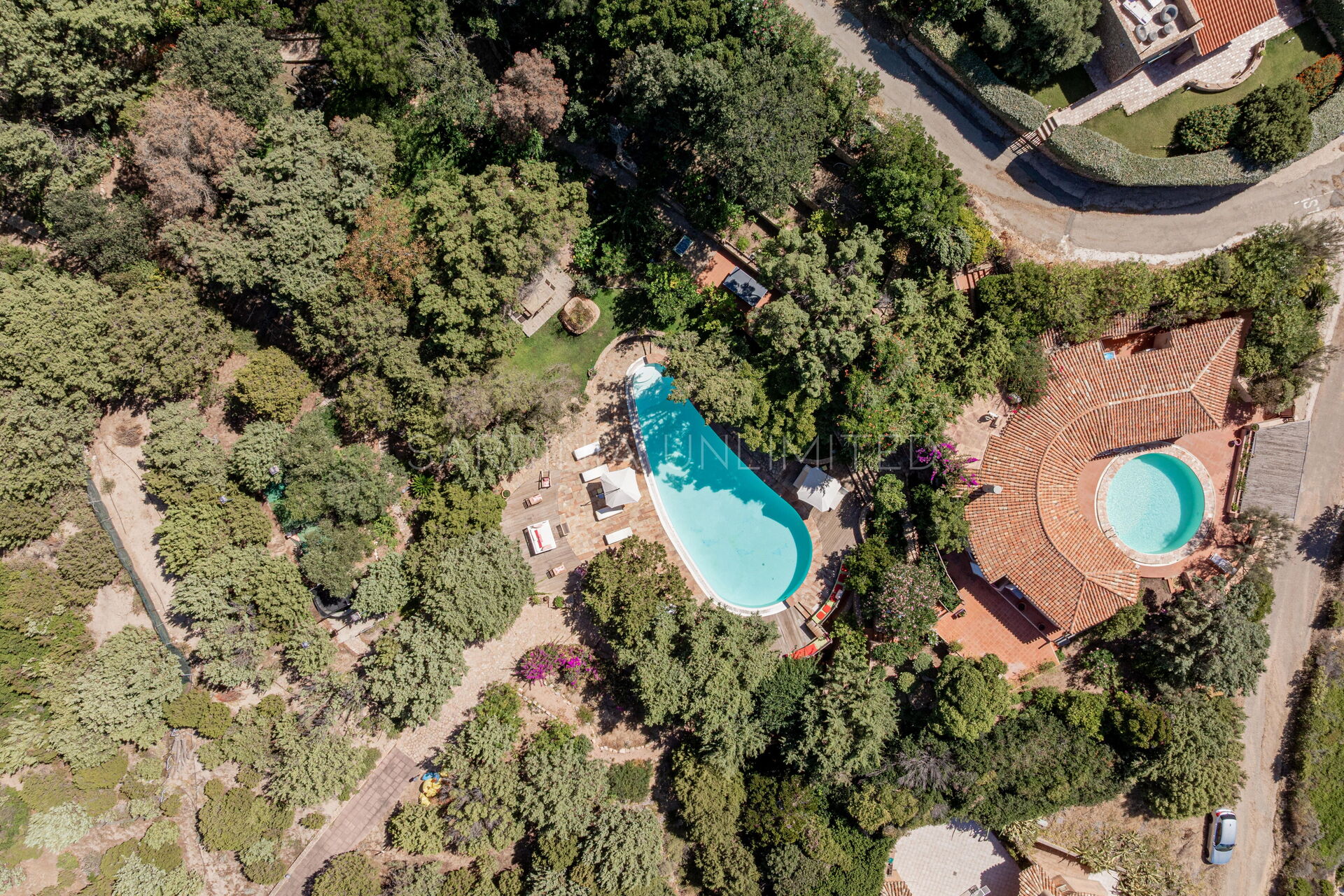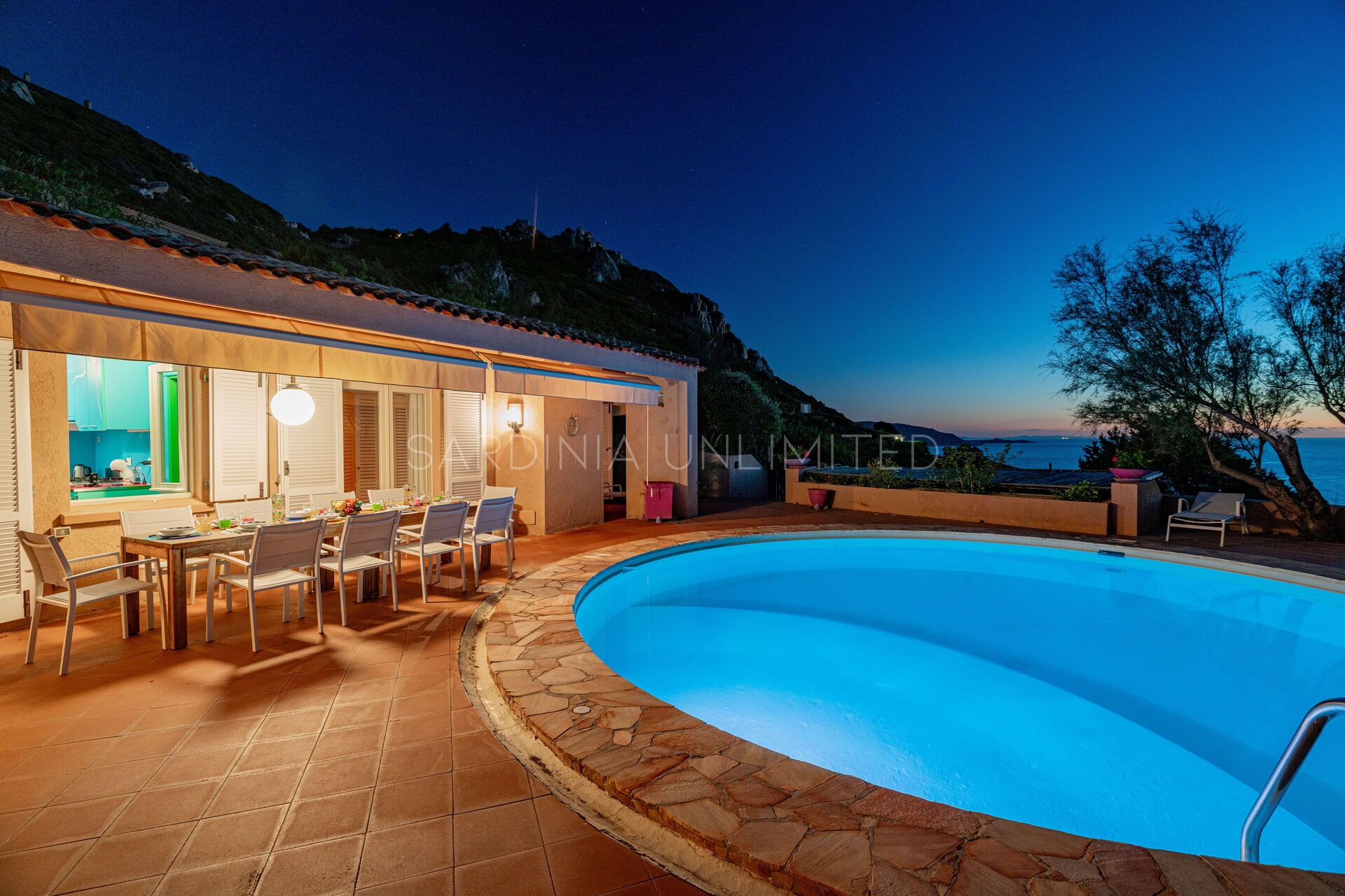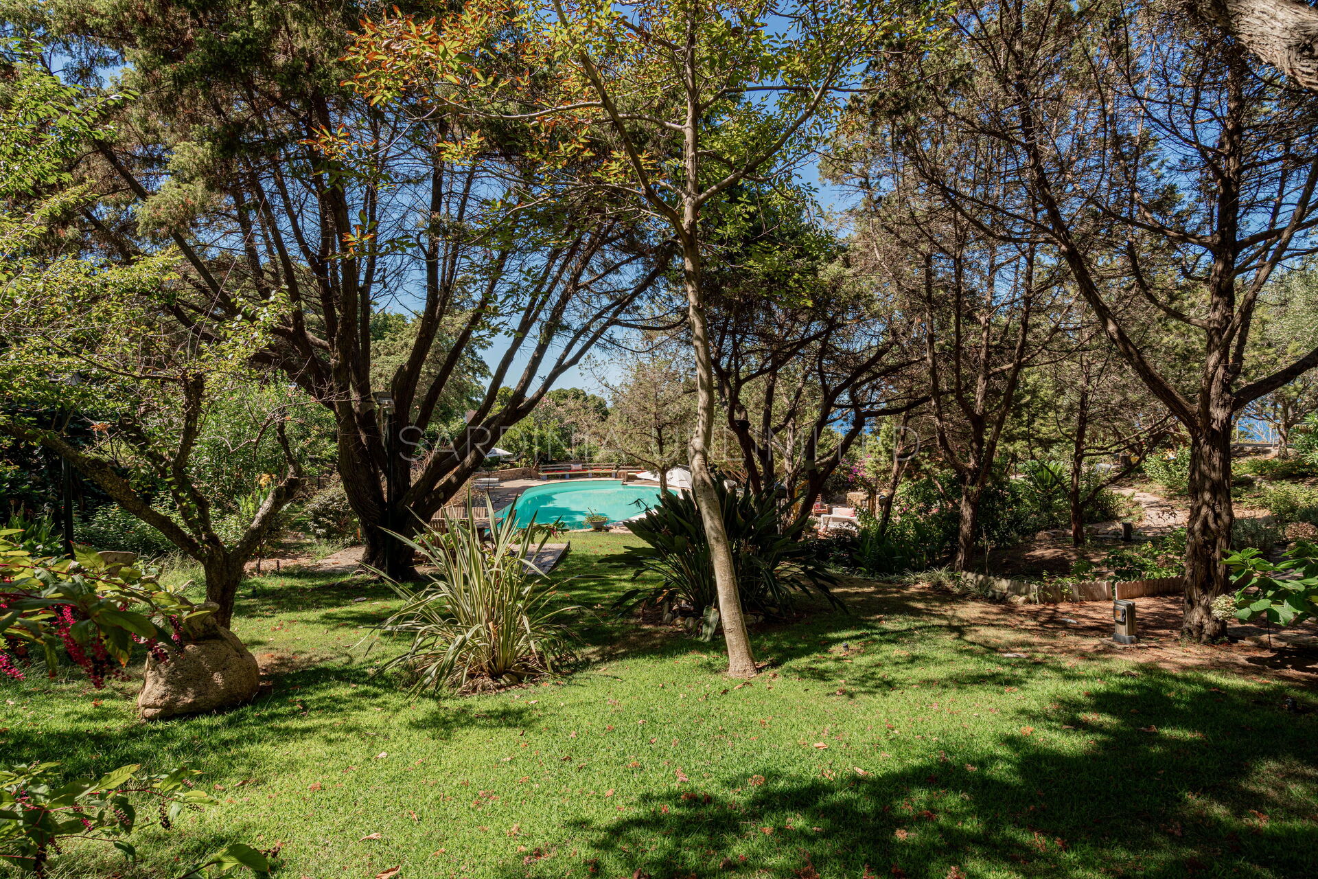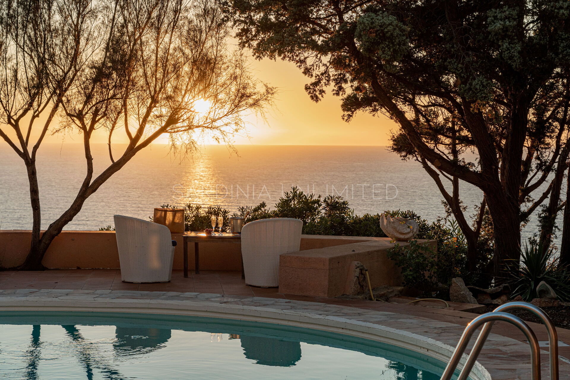 Buiten beschikt het pand over twee panoramische zwembaden om af te koelen op warme zomerdagen, omringd door een tot in de puntjes verzorgde tuin met tafelvoetbal en een pingpongtafel voor plezierige momenten in de buitenlucht. Op loopafstand ligt een afgelegen rotsachtige baai, perfect voor een duik in de kristalheldere zee.