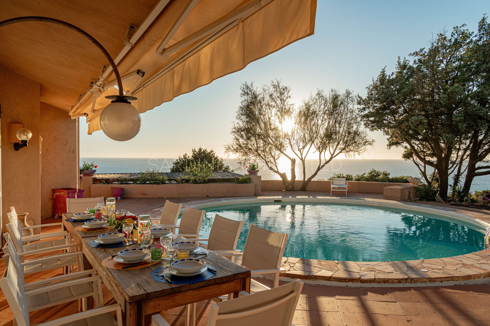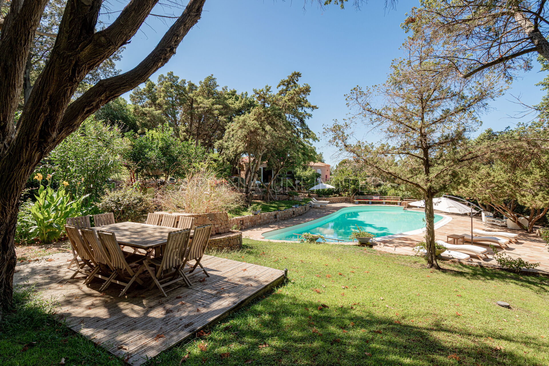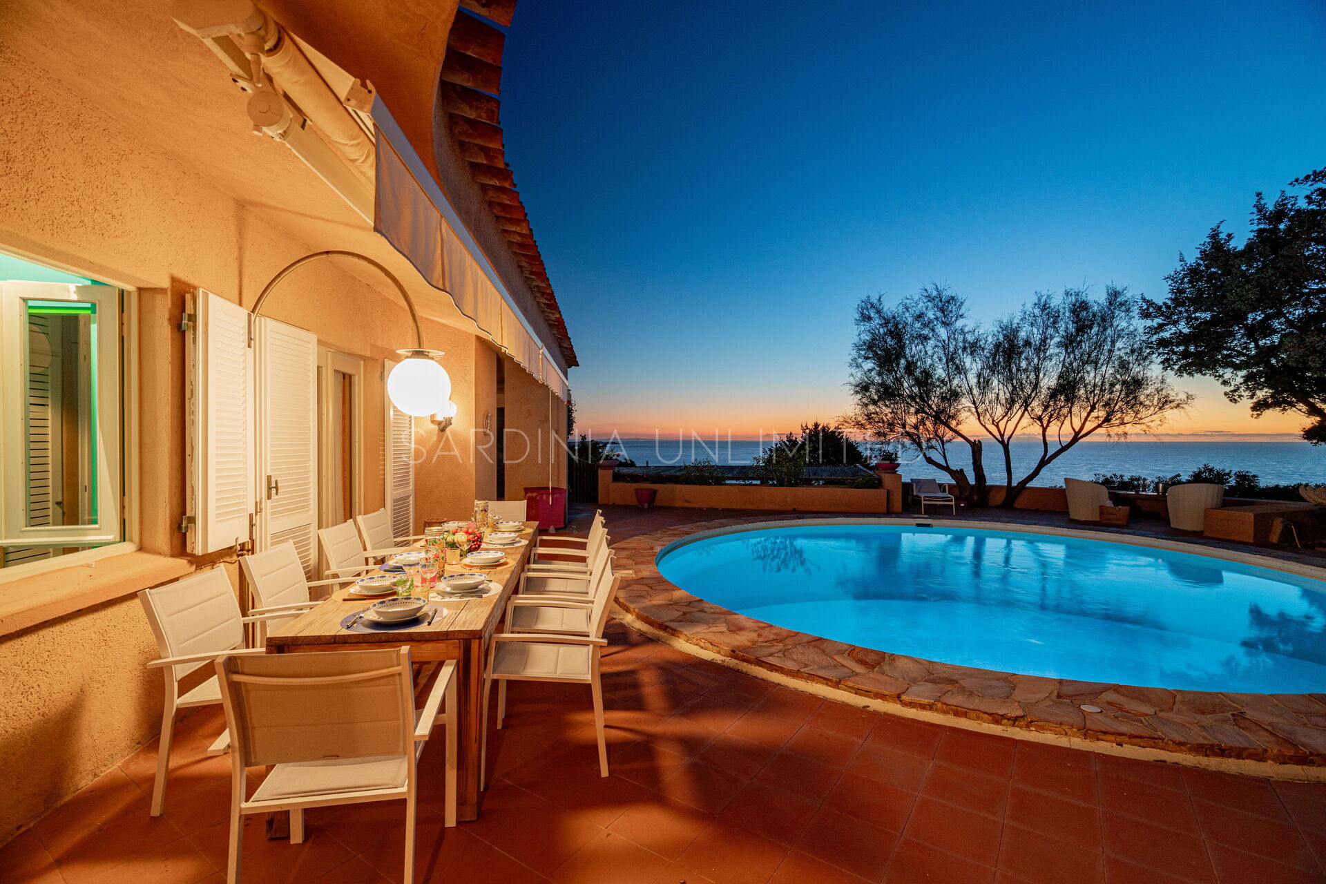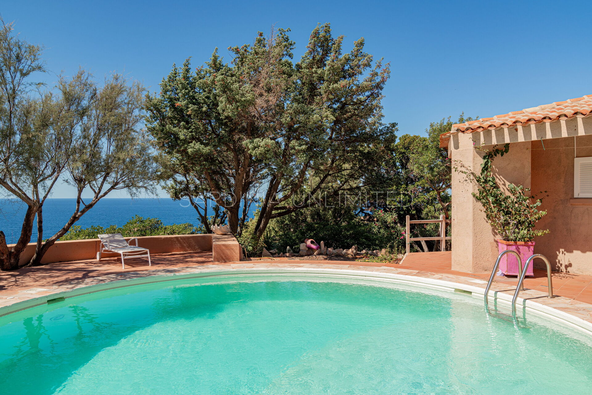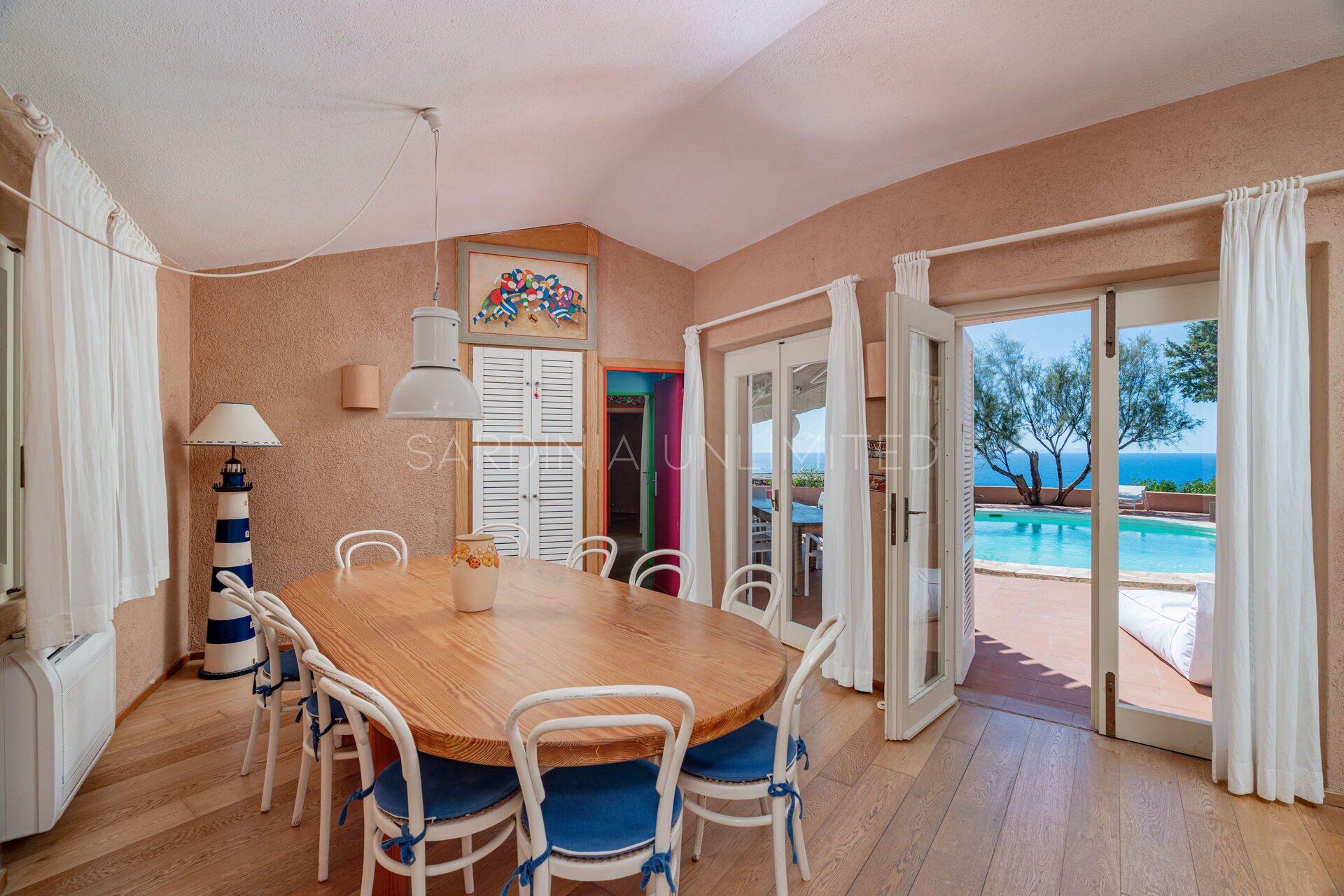 Buiten beschikt het pand over twee panoramische zwembaden om af te koelen op warme zomerdagen, omringd door een tot in de puntjes verzorgde tuin met tafelvoetbal en een pingpongtafel voor plezierige momenten in de buitenlucht. Op loopafstand ligt een afgelegen rotsachtige baai, perfect voor een duik in de kristalheldere zee.