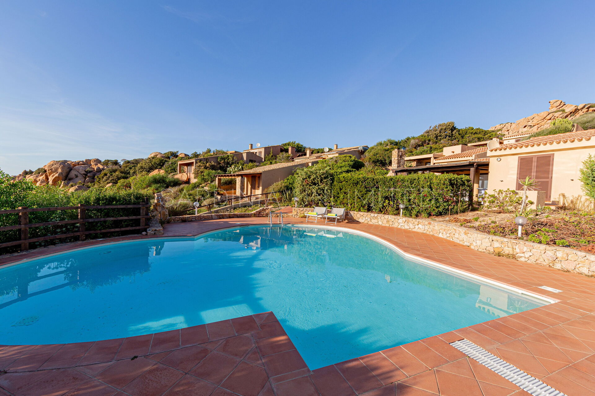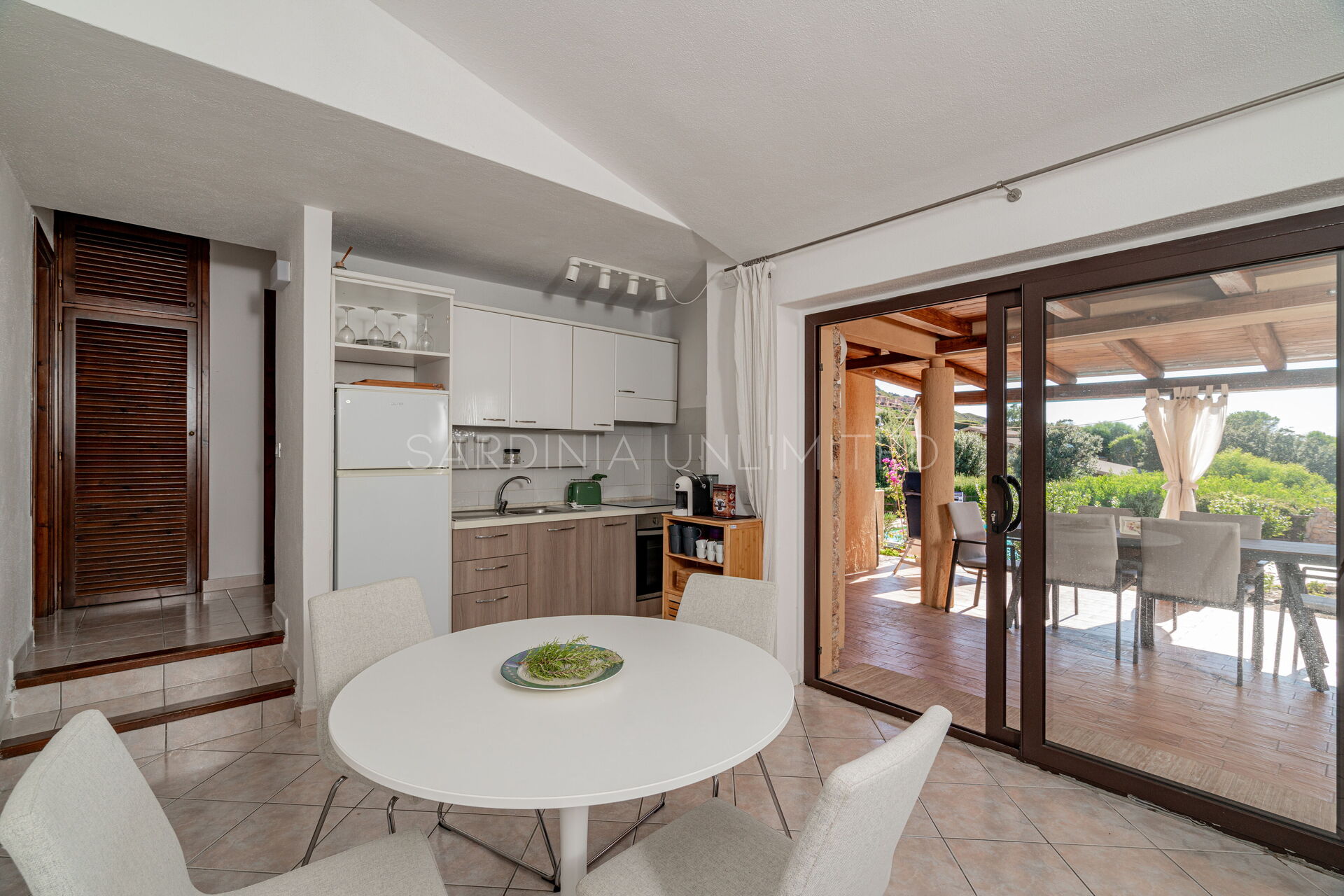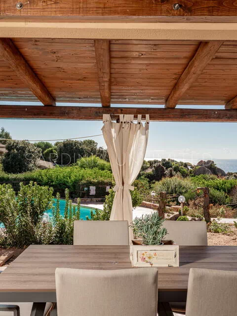 Een glazen deur verwelkomt je in de buitenruimtes van deze villa in Costa Paradiso. Als je bij Villetta Ginepro Verde een duik wilt nemen, staat het gedeelde zwembad tot je beschikking en het is altijd zichtbaar vanaf het huis.