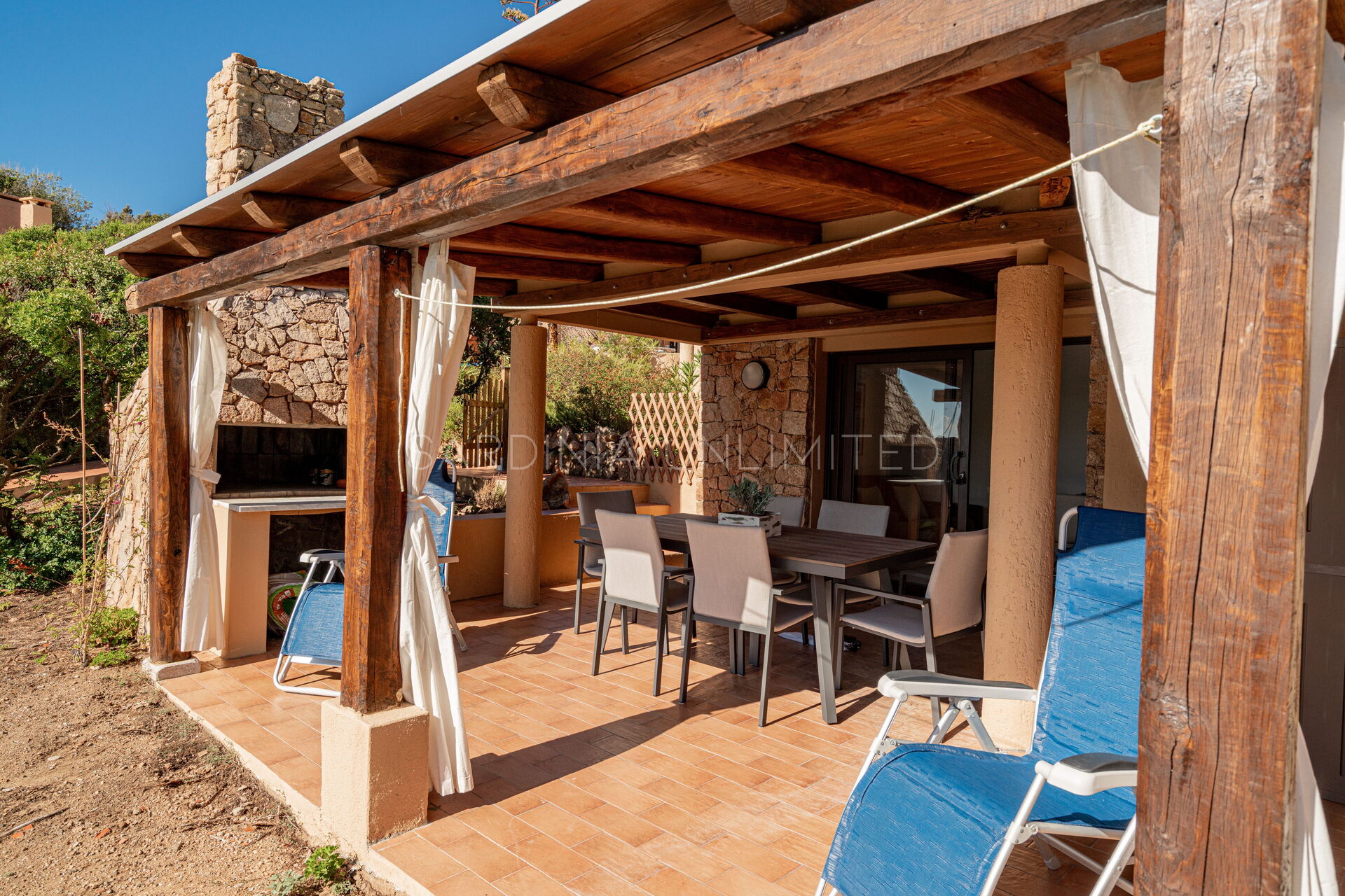 De veranda is een uitstekend verfrissingspunt voor en na een lange dag aan het strand. Hier is een barbecue die je de mogelijkheid geeft om te ontspannen met gegrild eten dat in de smaak zal vallen bij al je gasten. Het huis wordt omringd door het groen van het mediterrane struikgewas en een zeer suggestief uitzicht op de kust.