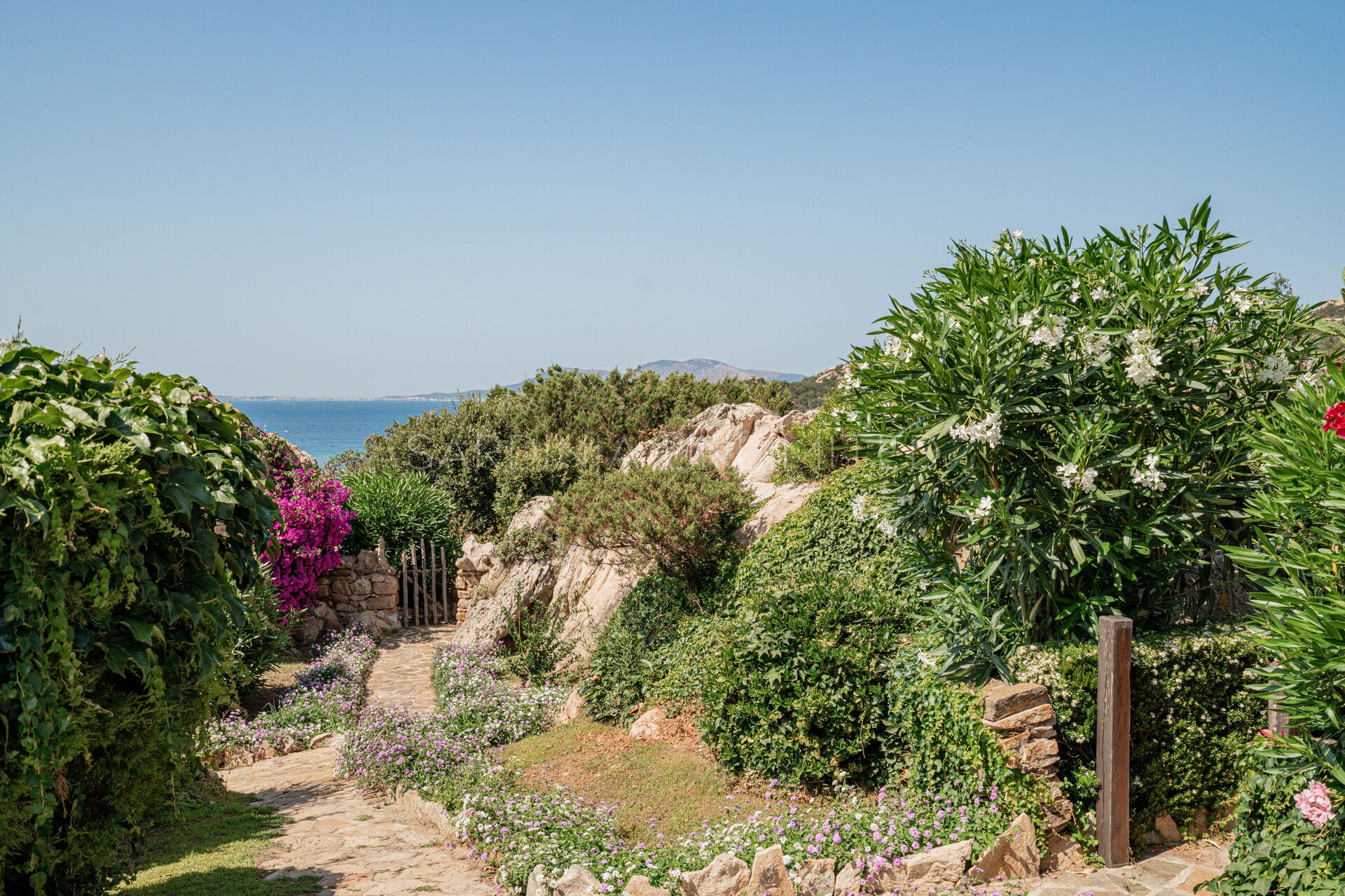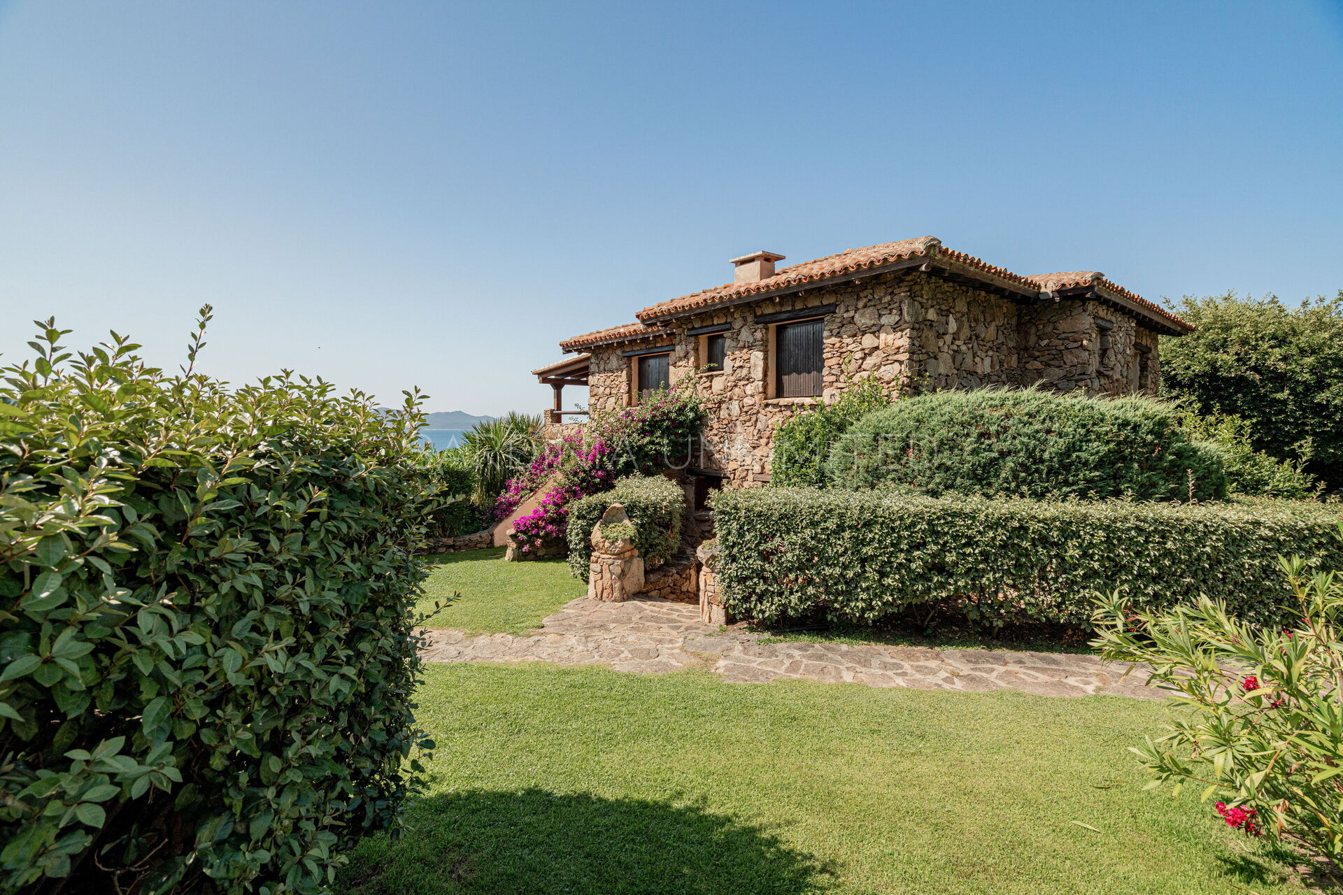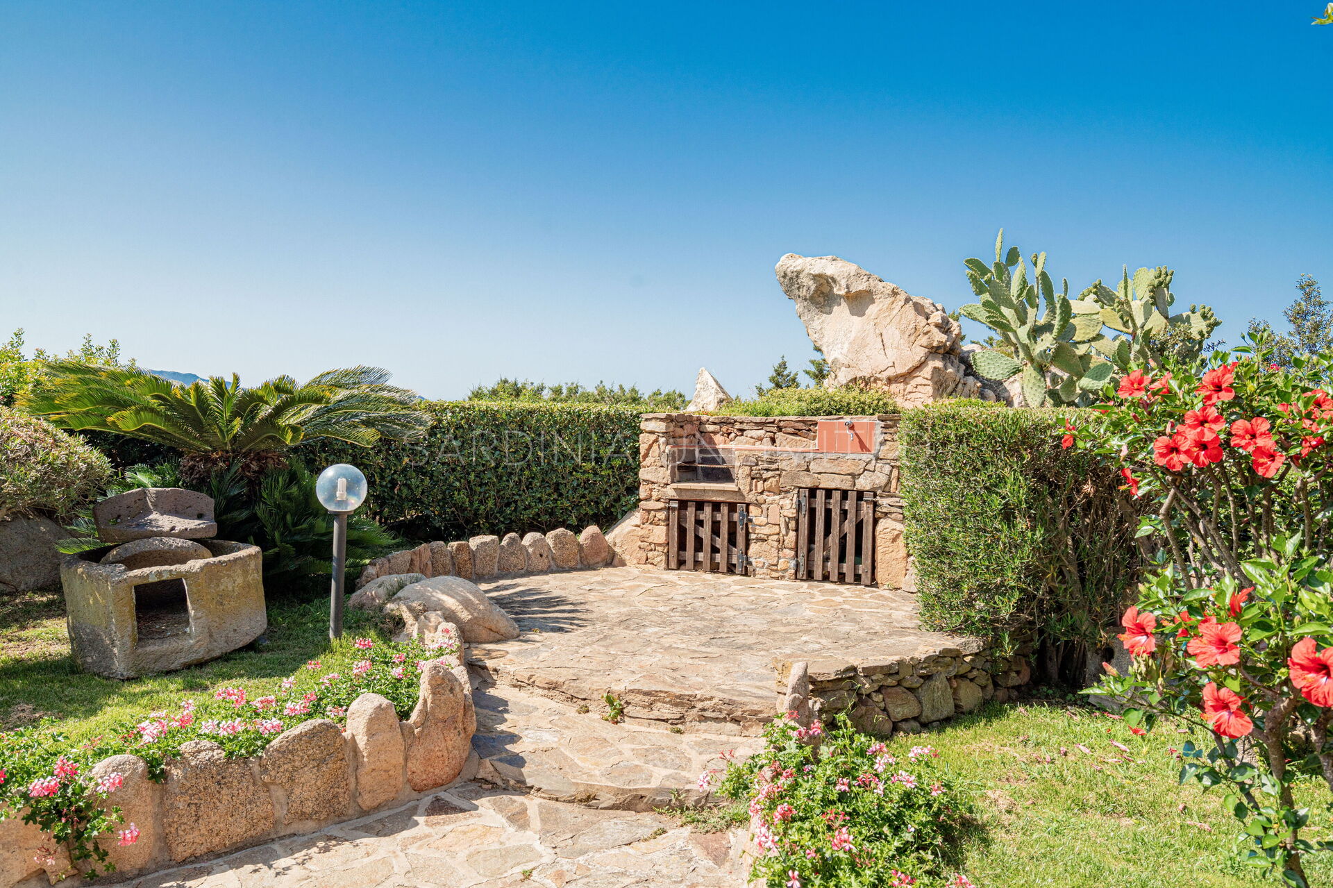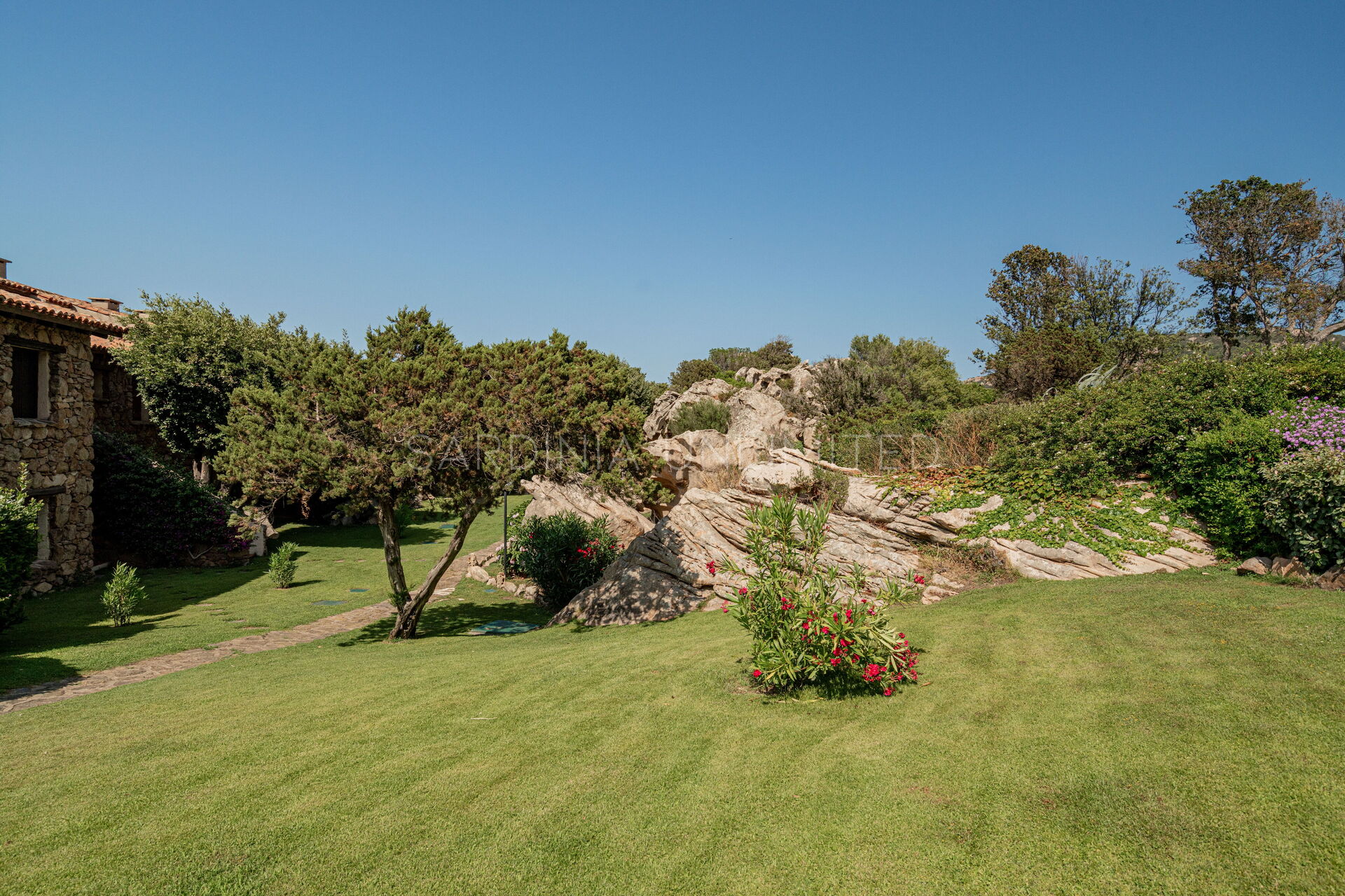 Участок окружён большим ухоженным частным садом, украшенным разноцветными гортензиями и другими средиземноморскими растениями, наполняющими воздух нежными ароматами и создающими завораживающий пейзаж. Аккуратный английский газон завершает эту зелёную идиллию — идеальное место для отдыха или безопасных игр детей.
