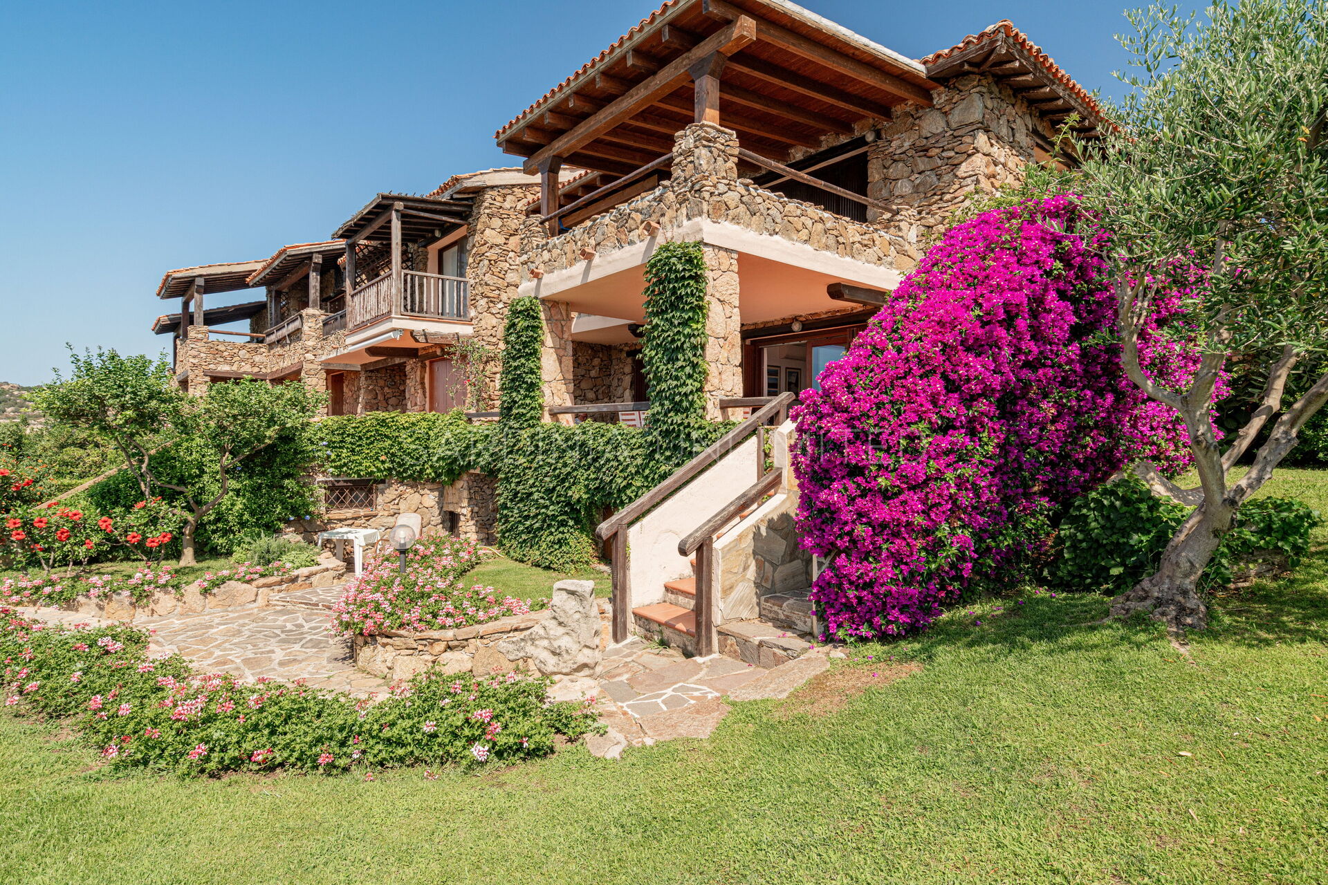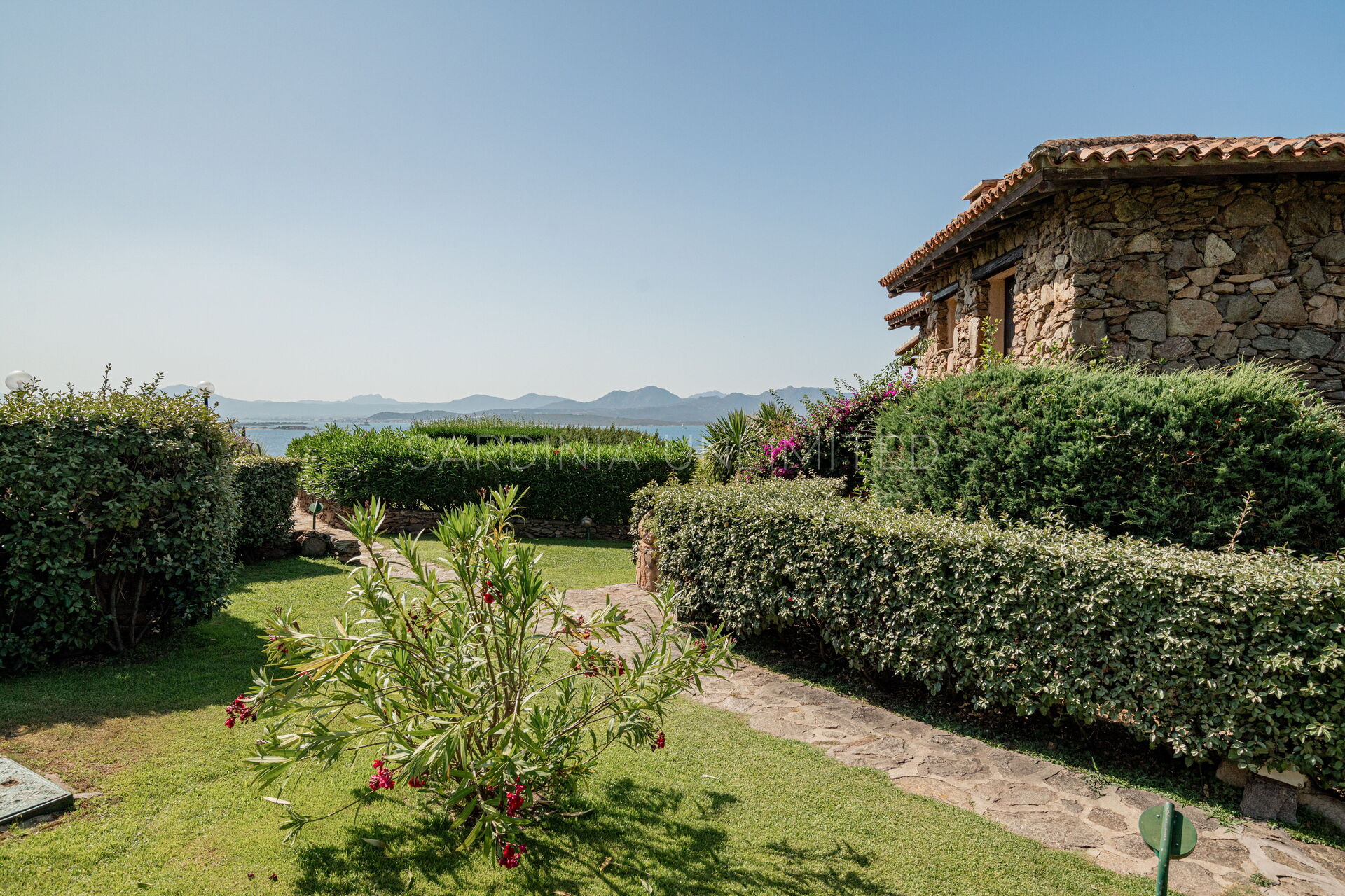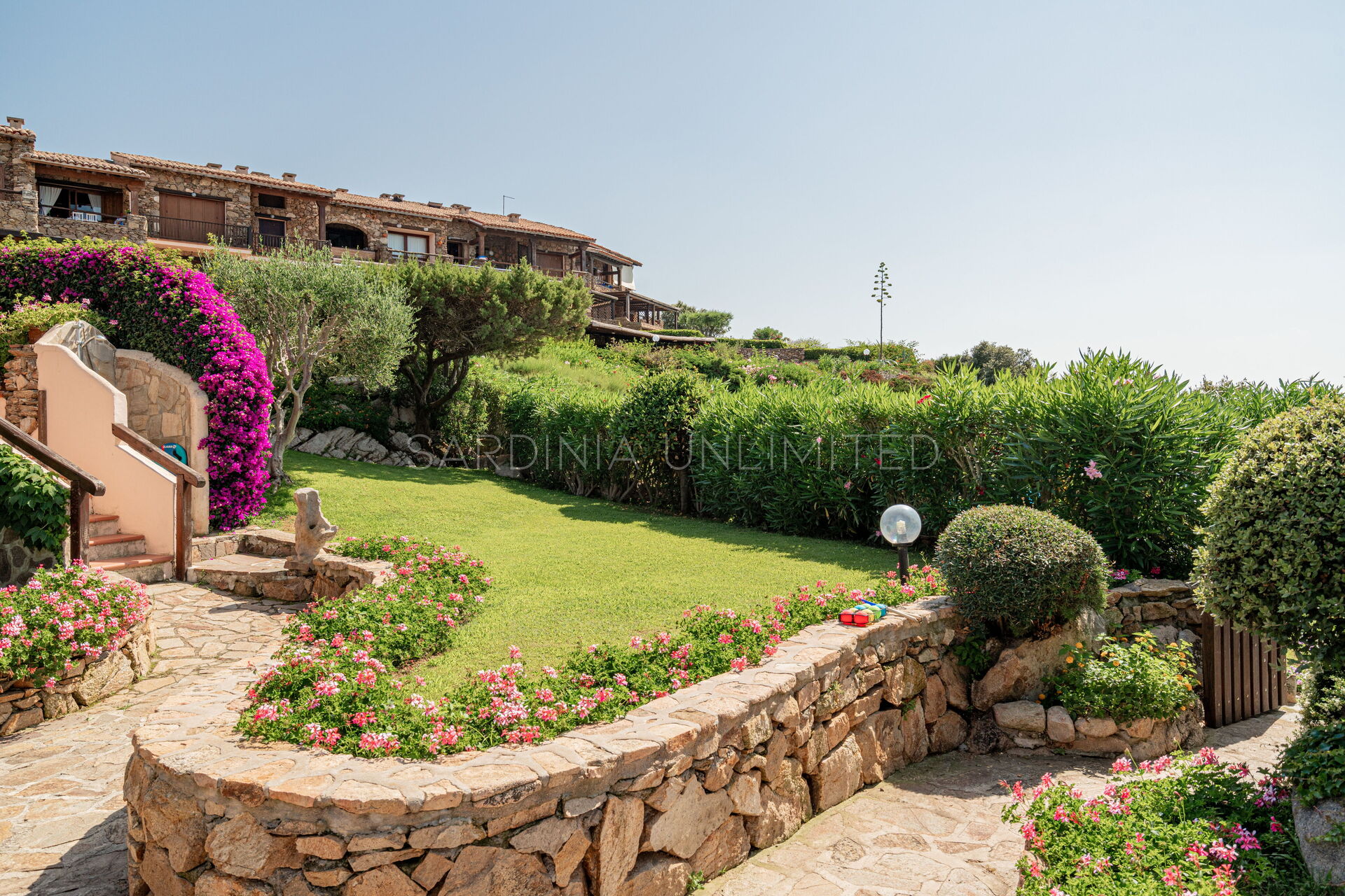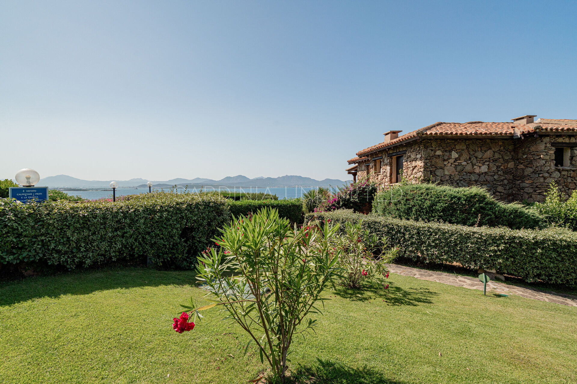 Участок окружён большим ухоженным частным садом, украшенным разноцветными гортензиями и другими средиземноморскими растениями, наполняющими воздух нежными ароматами и создающими завораживающий пейзаж. Аккуратный английский газон завершает эту зелёную идиллию — идеальное место для отдыха или безопасных игр детей.