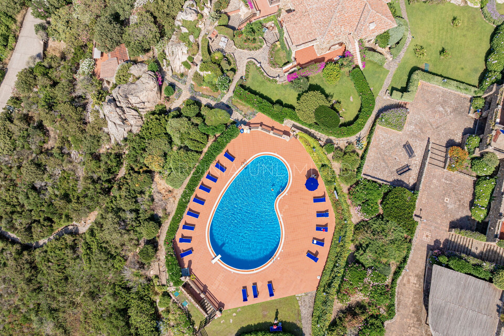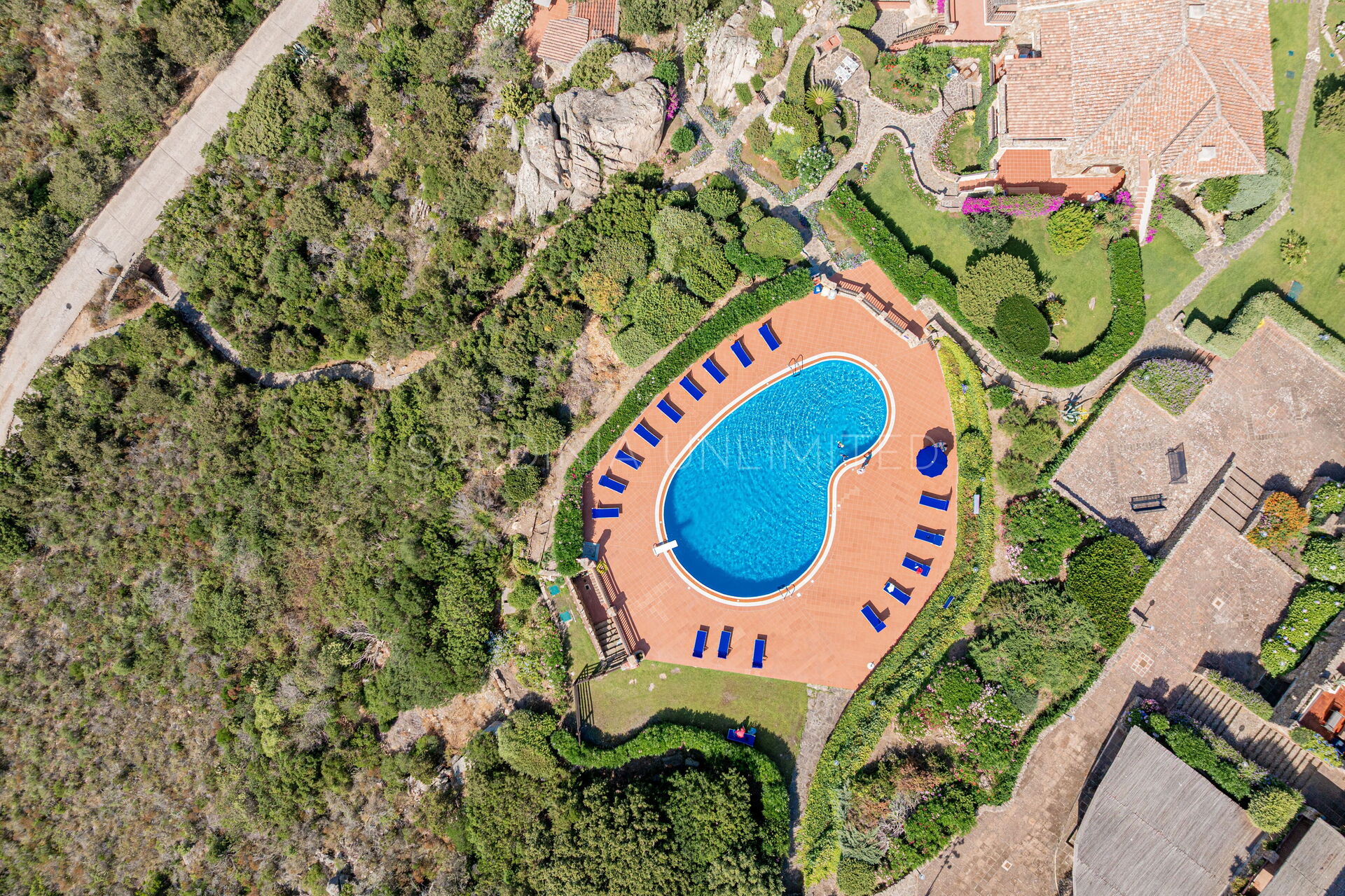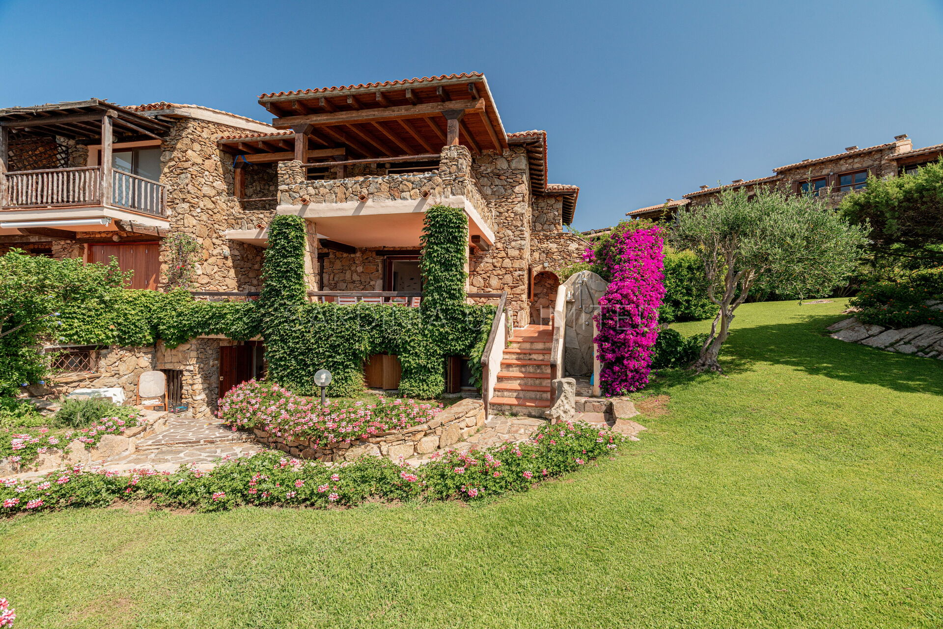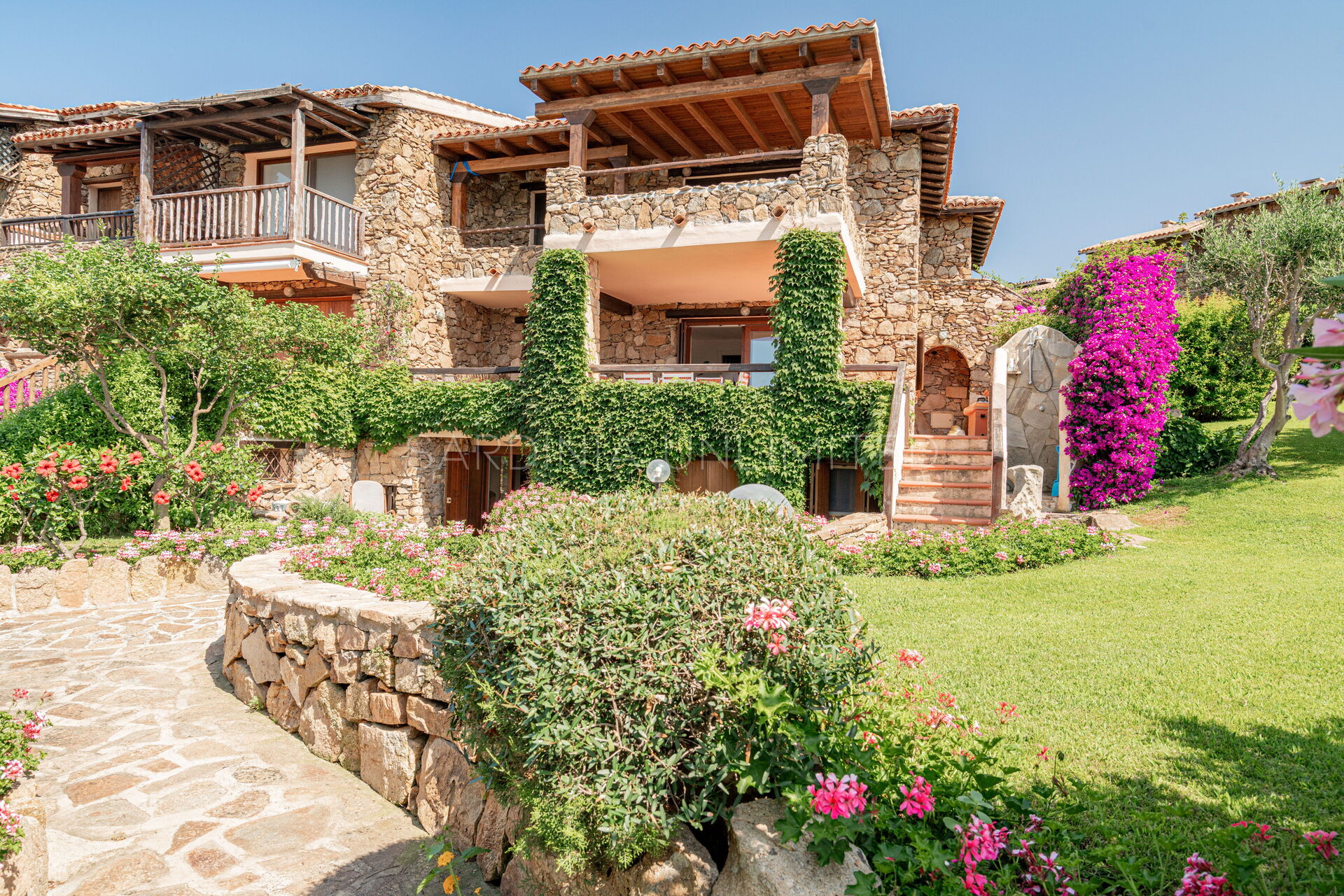 Участок окружён большим ухоженным частным садом, украшенным разноцветными гортензиями и другими средиземноморскими растениями, наполняющими воздух нежными ароматами и создающими завораживающий пейзаж. Аккуратный английский газон завершает эту зелёную идиллию — идеальное место для отдыха или безопасных игр детей.
