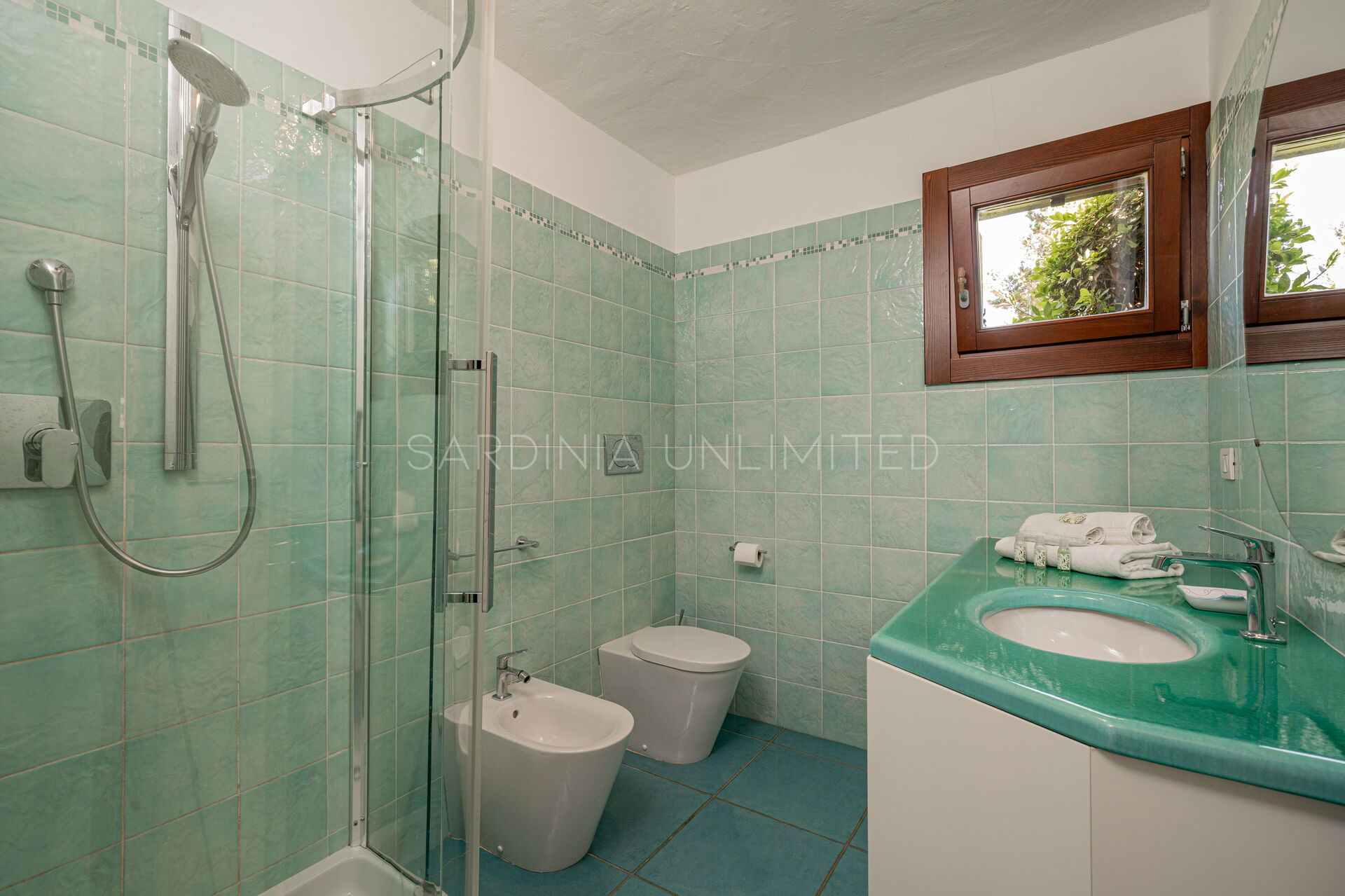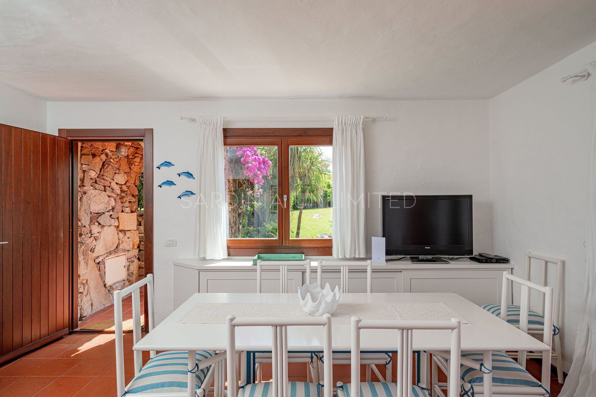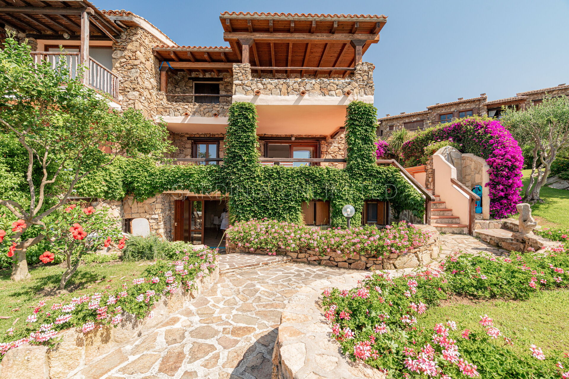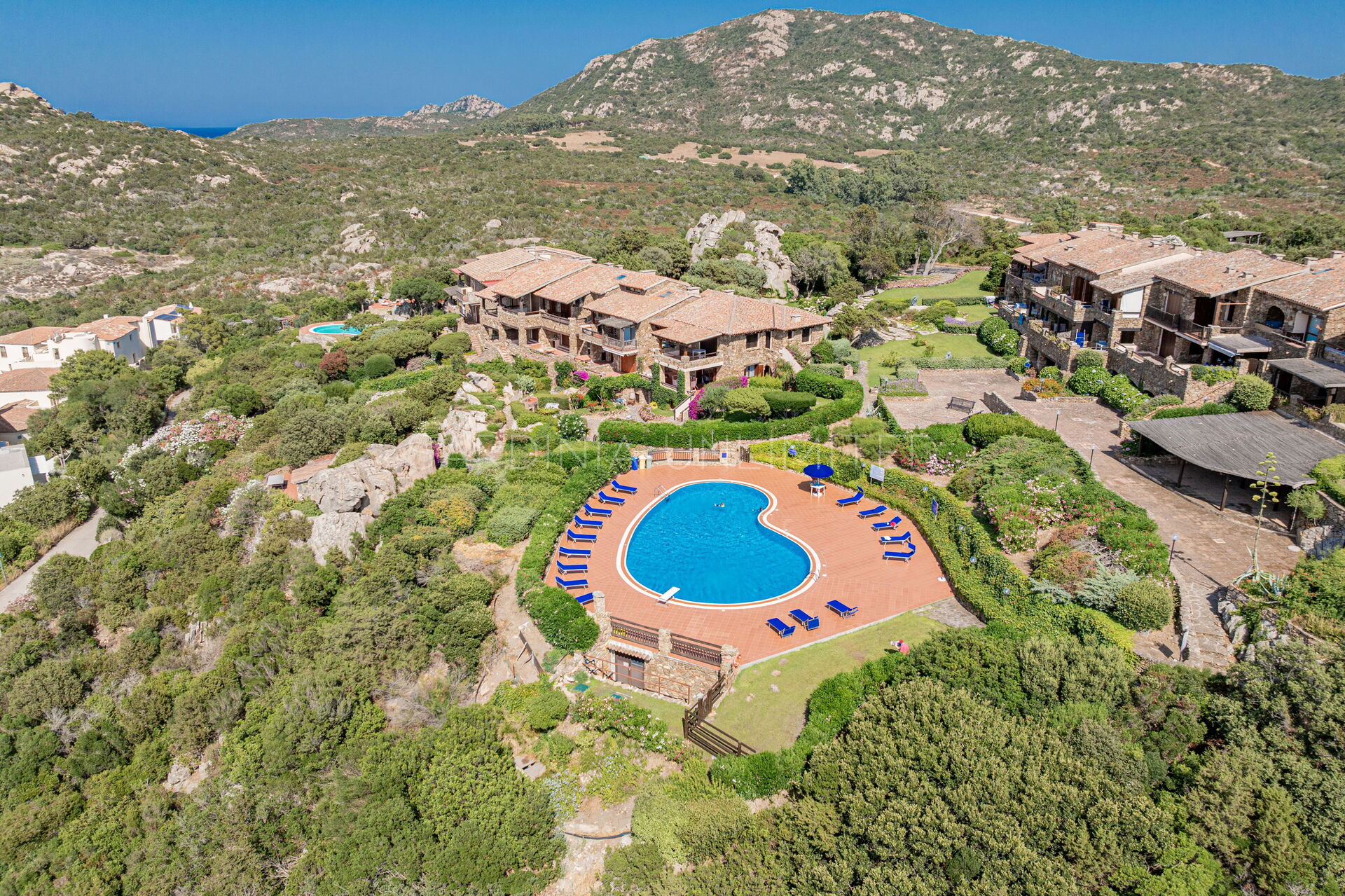 Участок окружён большим ухоженным частным садом, украшенным разноцветными гортензиями и другими средиземноморскими растениями, наполняющими воздух нежными ароматами и создающими завораживающий пейзаж. Аккуратный английский газон завершает эту зелёную идиллию — идеальное место для отдыха или безопасных игр детей.