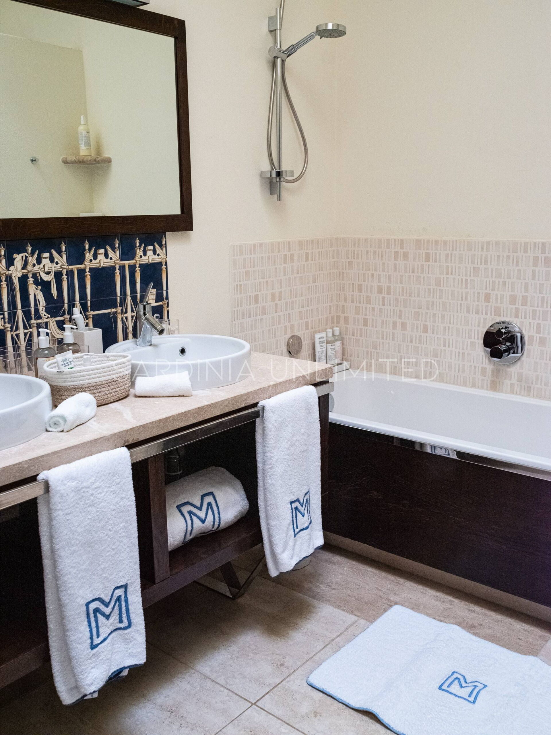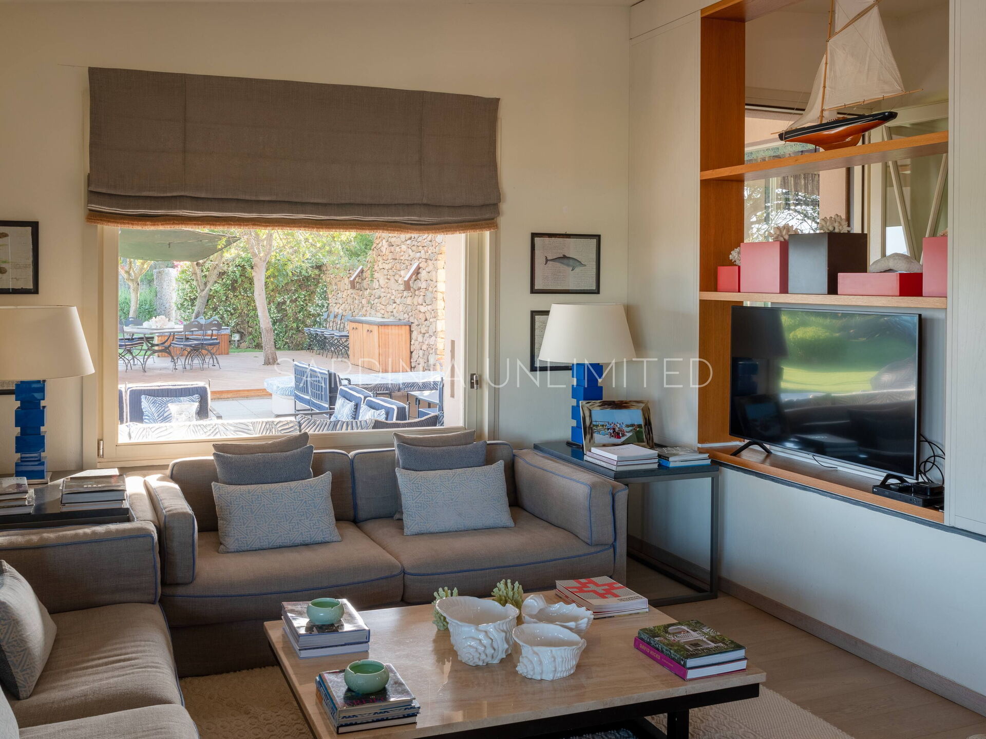Расположенная в маленькой защищенной бухте, которая формирует естественную гаванью, идеально подходящую для крупных яхт, вилла находится всего в нескольких минутах ходьбы (около 10 минут) от второго пляжа, известного своими кристально чистыми водами.