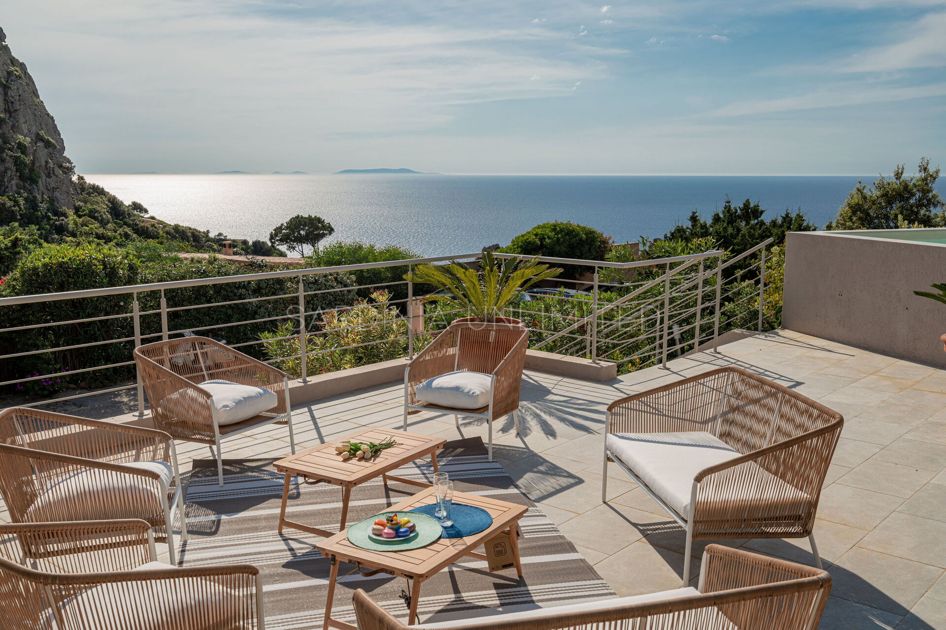 На открытой территории также есть несколько лаунж-зон для отдыха и терраса с современным столом и удобными креслами, которая приглашает вас на незабываемые ужины под звездным небом, овеваемым морским бризом.